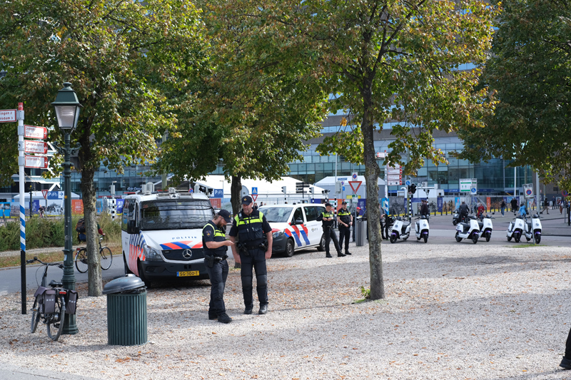 De politie is aanwezig en ziet toe op een ordelijk verloop van de demonstratie.