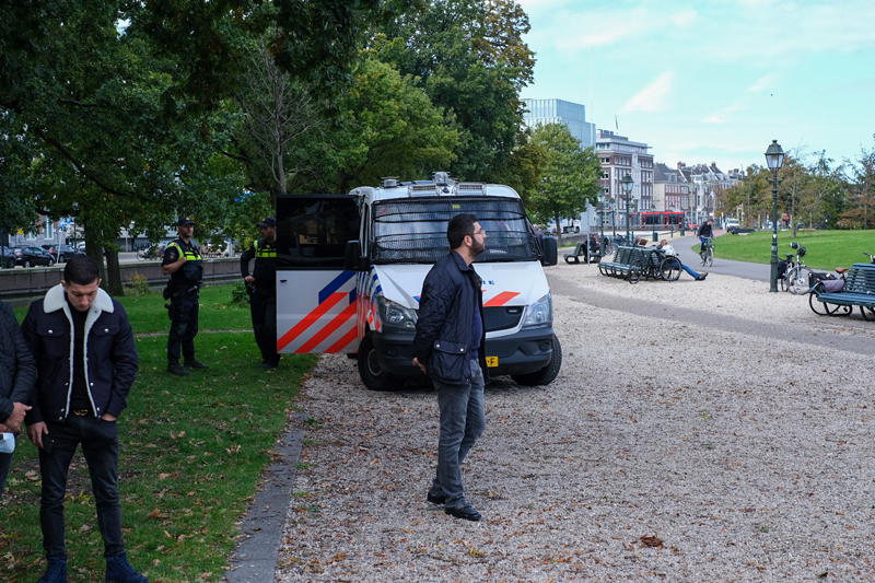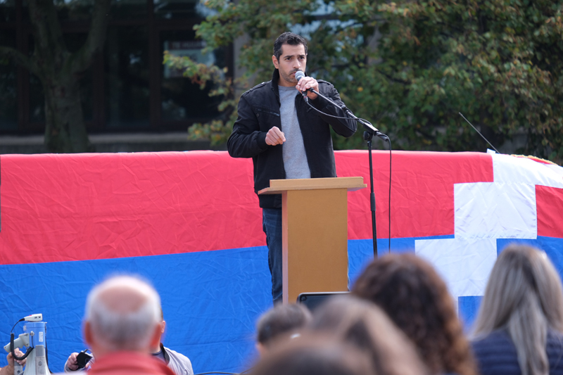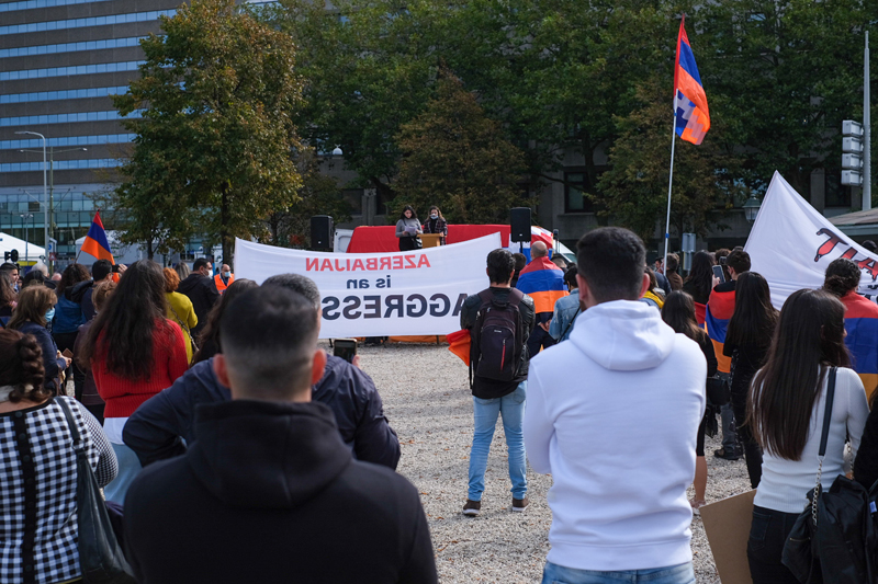 Op de Laan van Reagan en Gorbatsjov is een klein podium opgebouwd waarop enkele sprekers de demonstranten toespreken en er wordt muziek gespeeld. De geplande protestmars langs de ambassades van Azerbeidzjan en Turkije mag niet doorgaan.