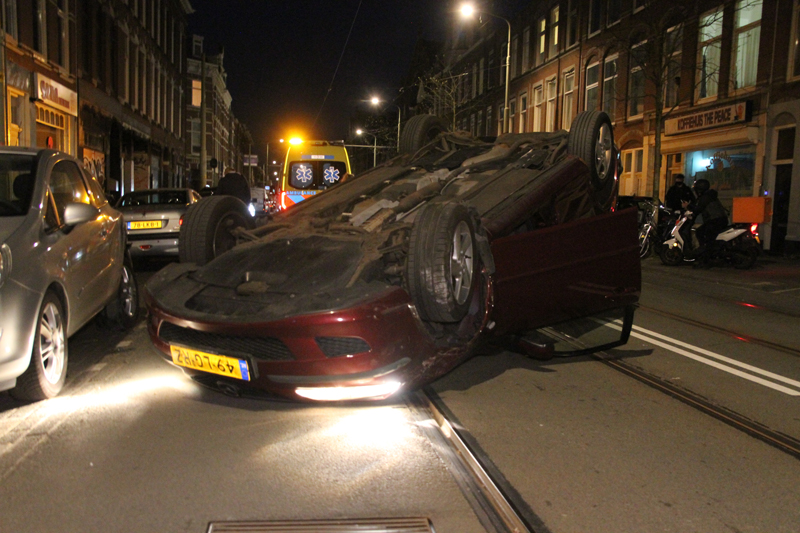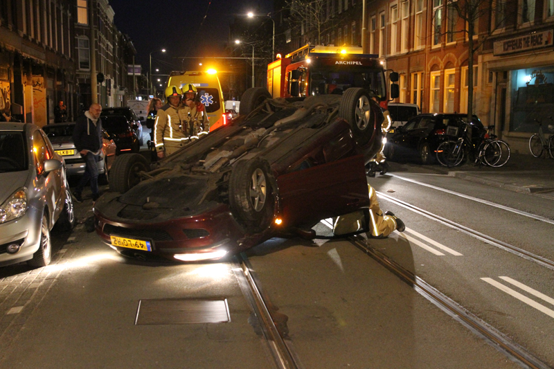 Den Haag – Op de Beeklaan in Den Haag is dinsdagavond een auto op z’n dak terecht gekomen. De bestuurder raakte daarbij lichtgewond.
