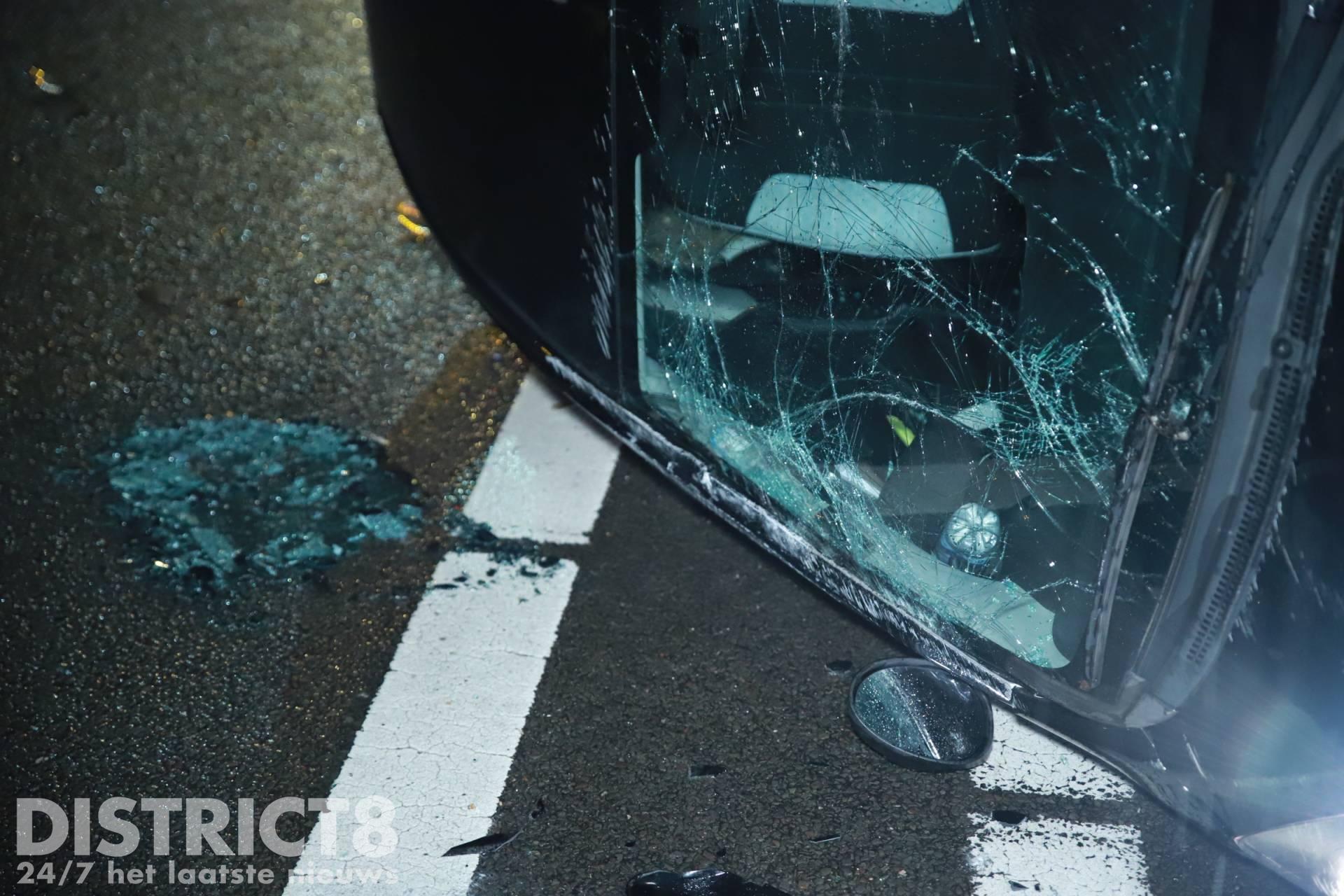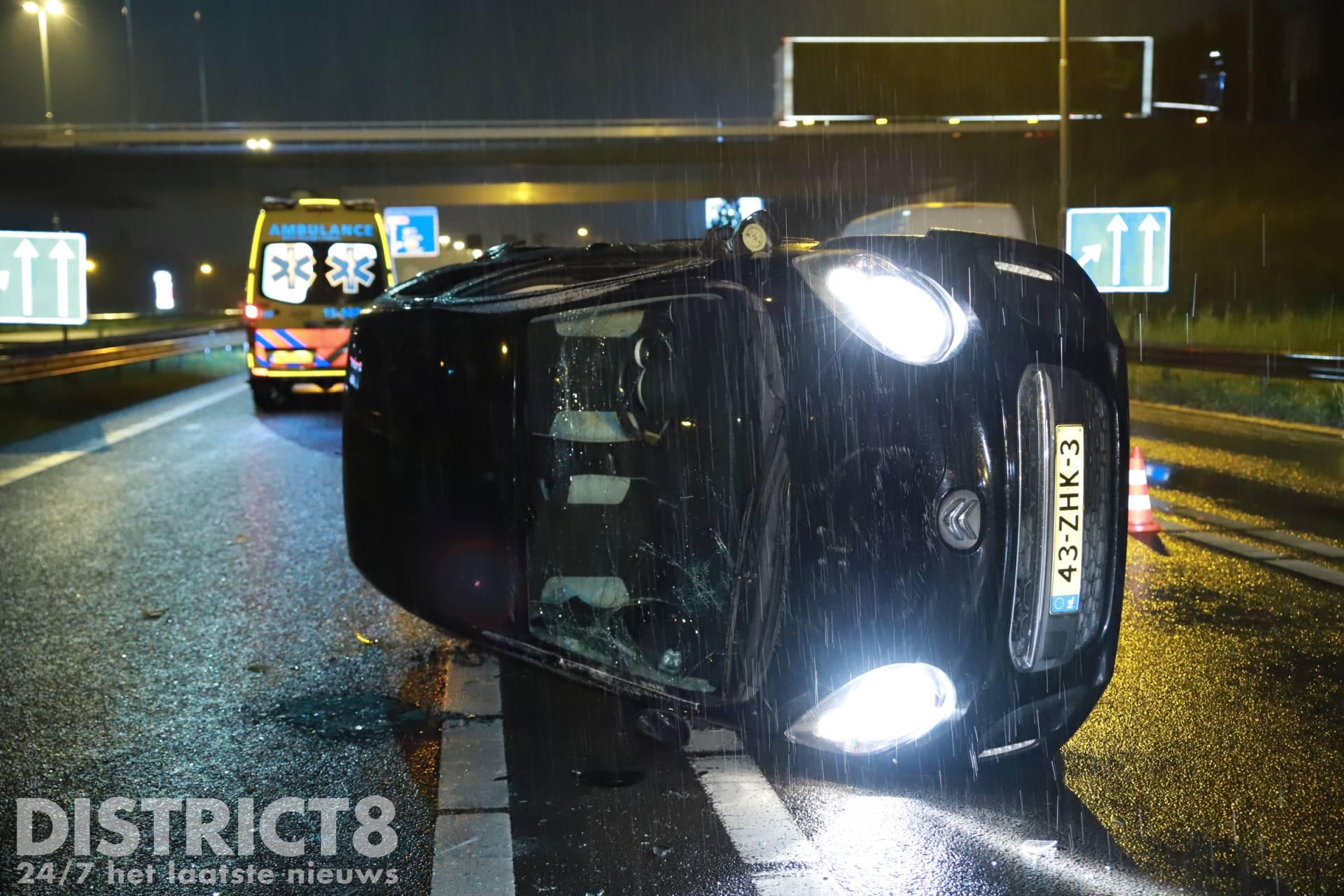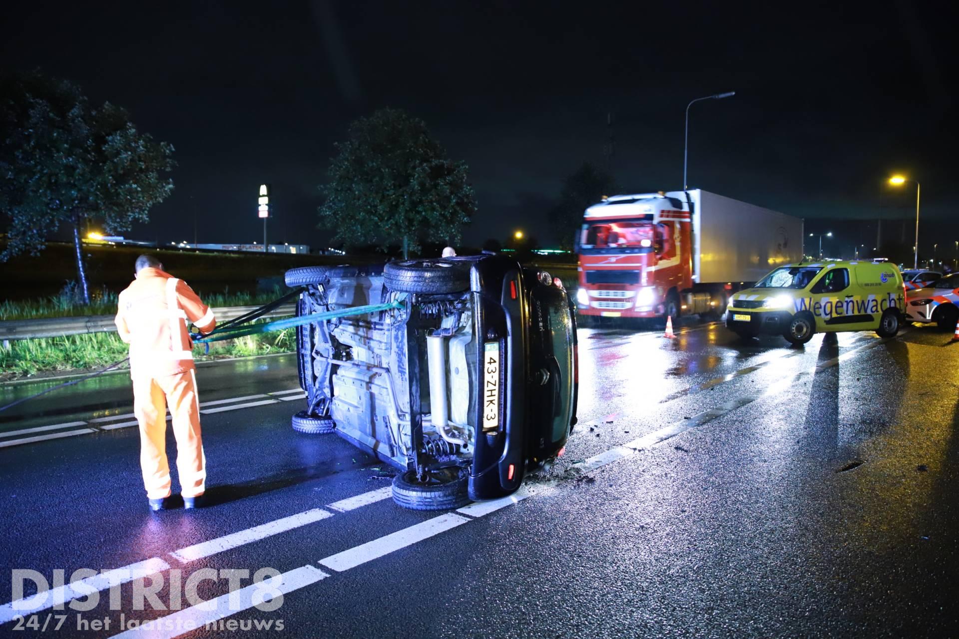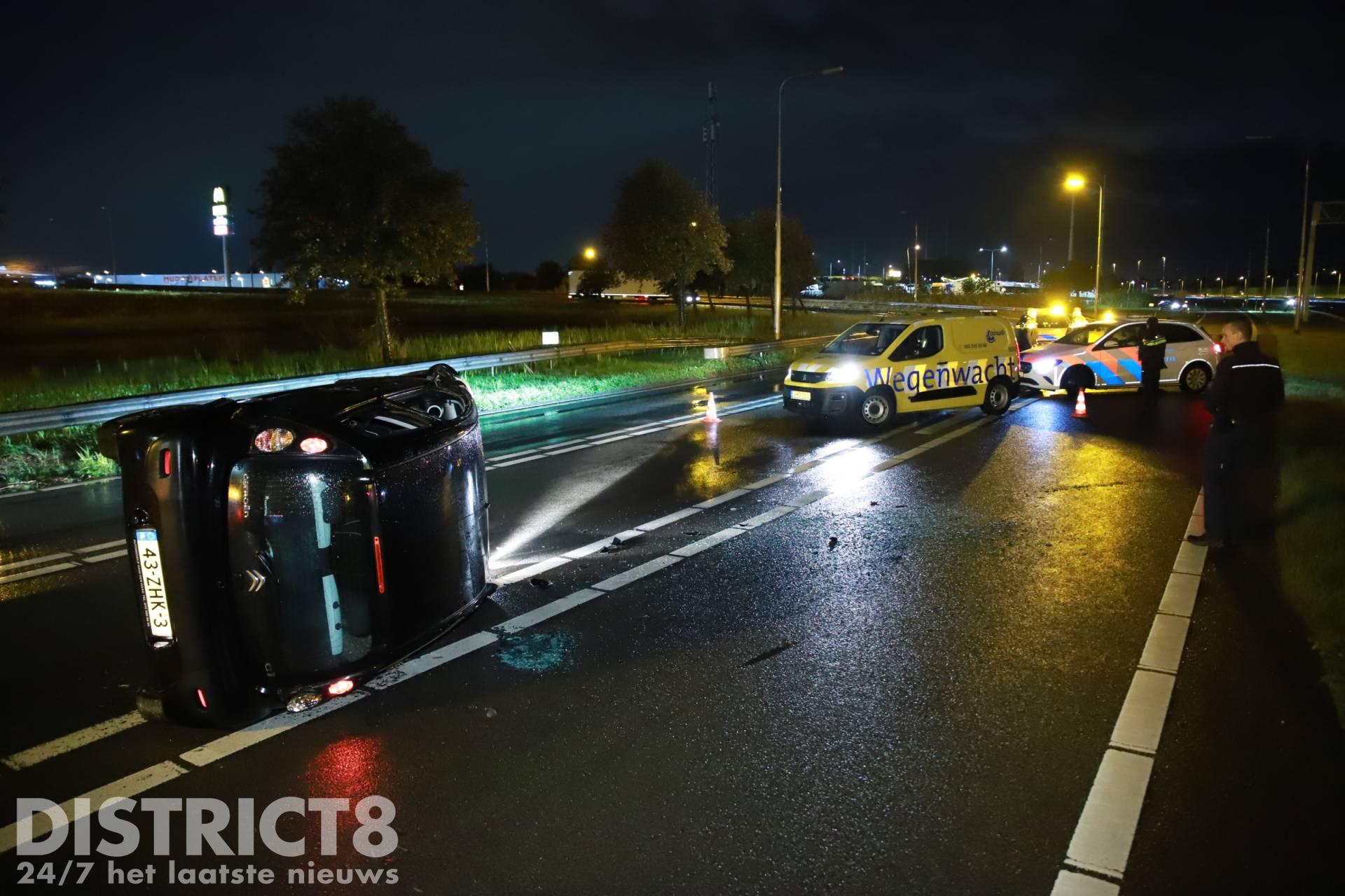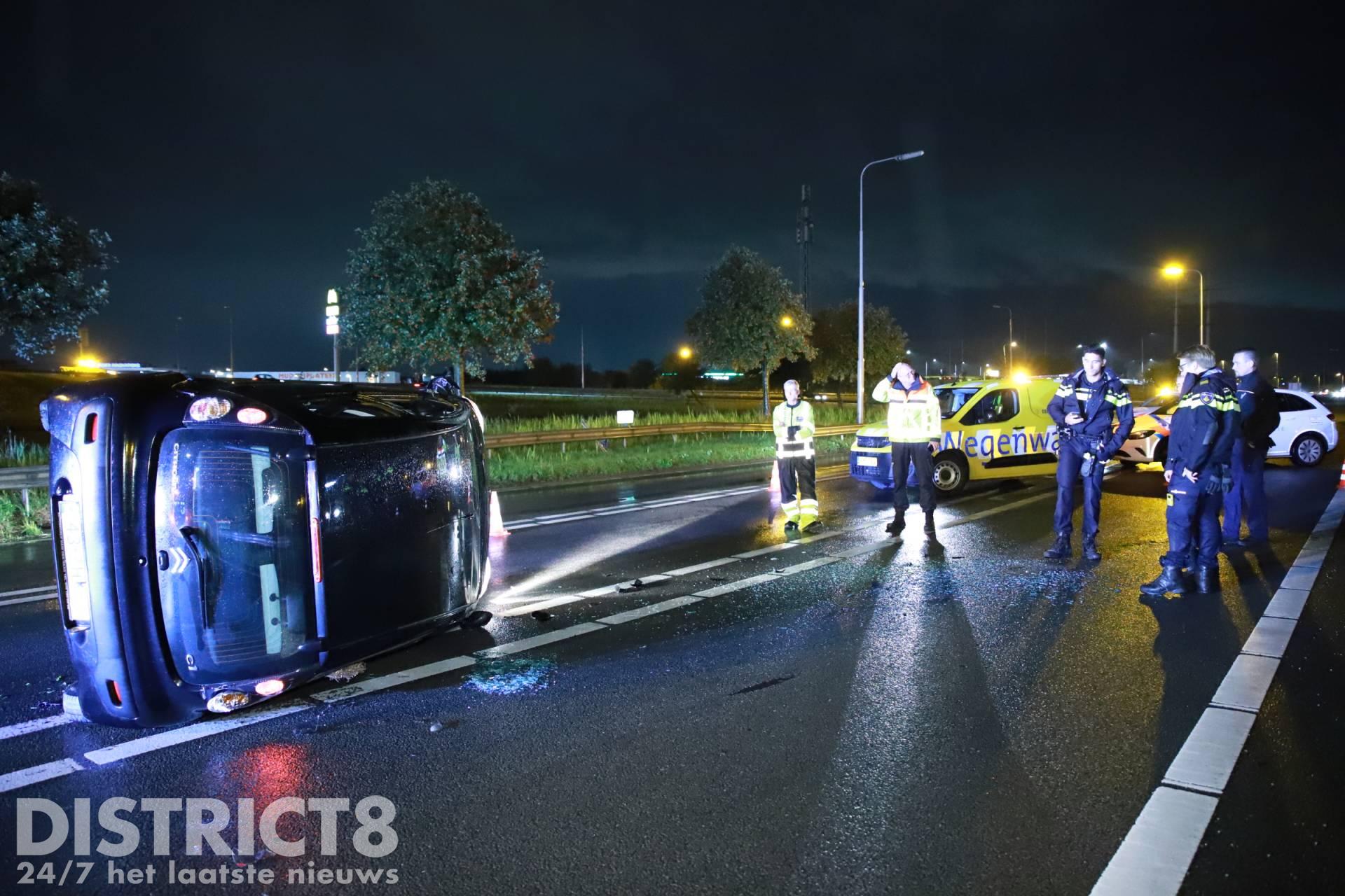 Door nog onbekende oorzaak ging het mis. De auto met daarin twee inzittenden kwam ter hoogte van het viaduct op z’n kant terecht. De twee inzittenden konden zelfstandig de auto verlaten.