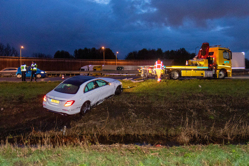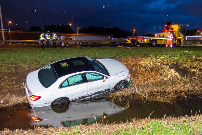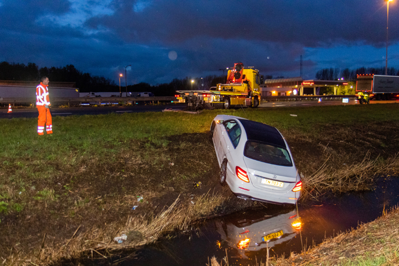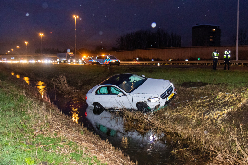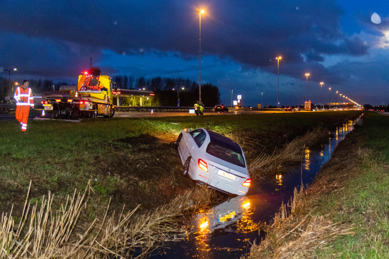 Vlaardingen – Woensdagmorgen tijdens een flinke regenbui is een automobilist met zijn auto van de A20 geschoten en bijna te water geraakt. De hulpdiensten rukten massaal uit voor een voertuig te water maar eenmaal ter plaatse bleek de bestuurder veel geluk gehad te hebben. Zijn auto hing op de rand van de sloot maar hij raakte niet gewond. In de ambulance is hij nog nagekeken door het ambulance personeel. Het eenzijdig ongeval vond plaats t.h.v. HM paal 19,6 in de richting van Maassluis. Achter het ongeval ontstond een flinke file vanuit Rotterdam richting het Westland.