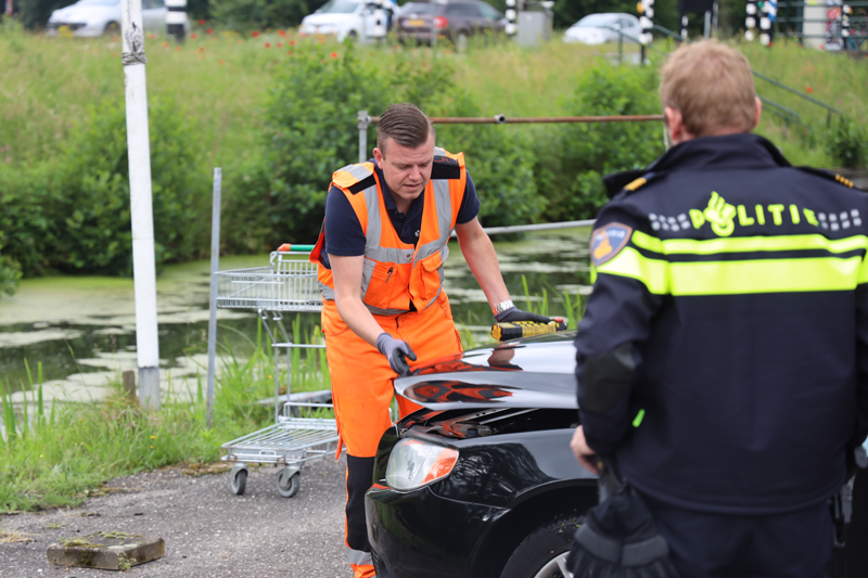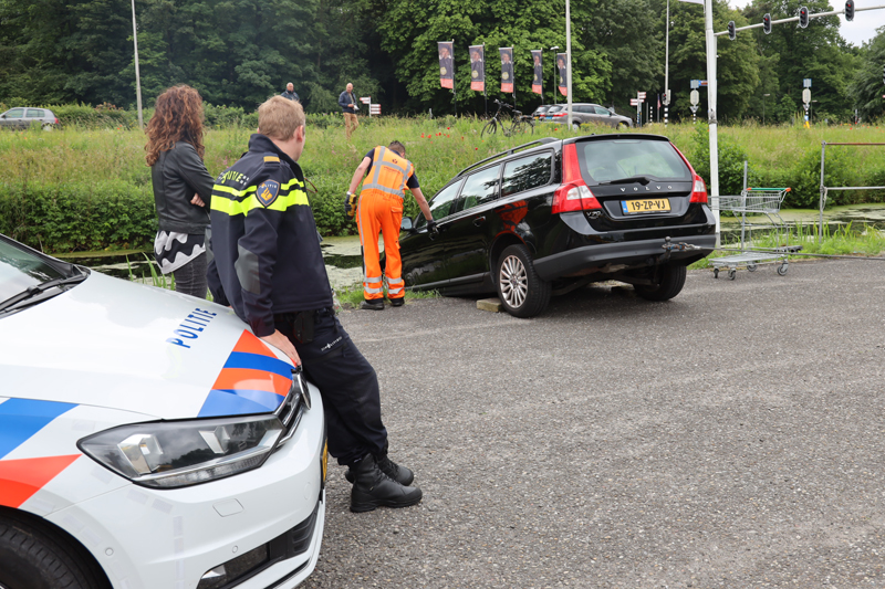 De vrouw die na het halen van wat plantjes bij een tuincentrum uit de parkeerplaats wilde rijden verwisselde vermoedelijk het pedaal waarna de auto naar voor schoot en met de voorkant deels te water raakte.