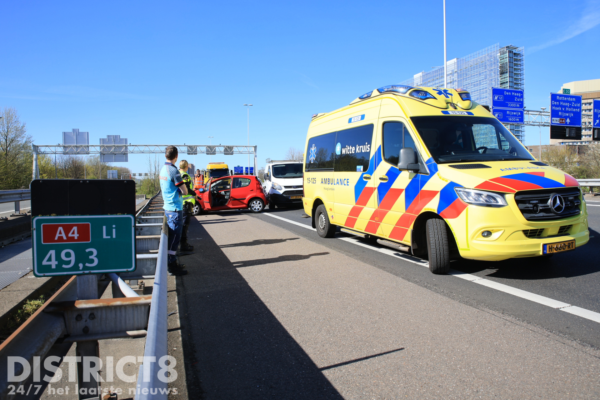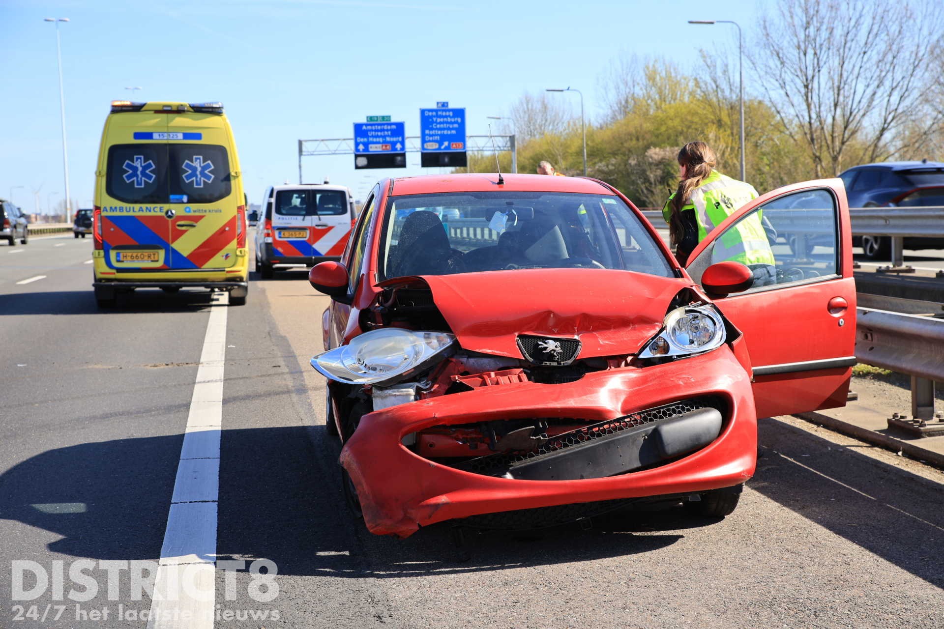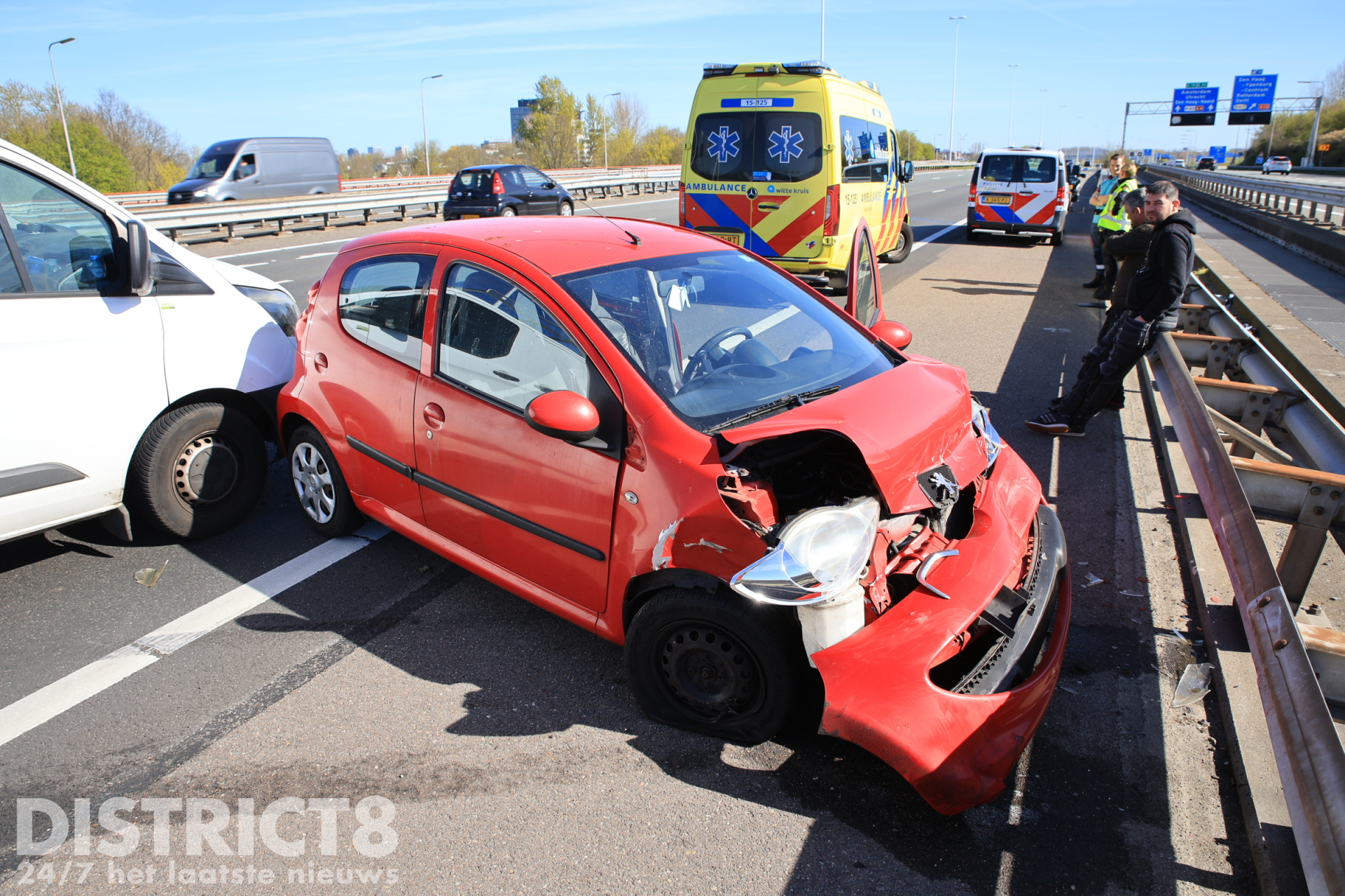 Rijswijk – Dinsdagochtend 7 april heeft op de A4 ter hoogte van Rijswijk richting Amsterdam een ongeval plaatsgevonden tussen een auto en een busje. Na de botsing kwam de auto in de vangrail terecht.