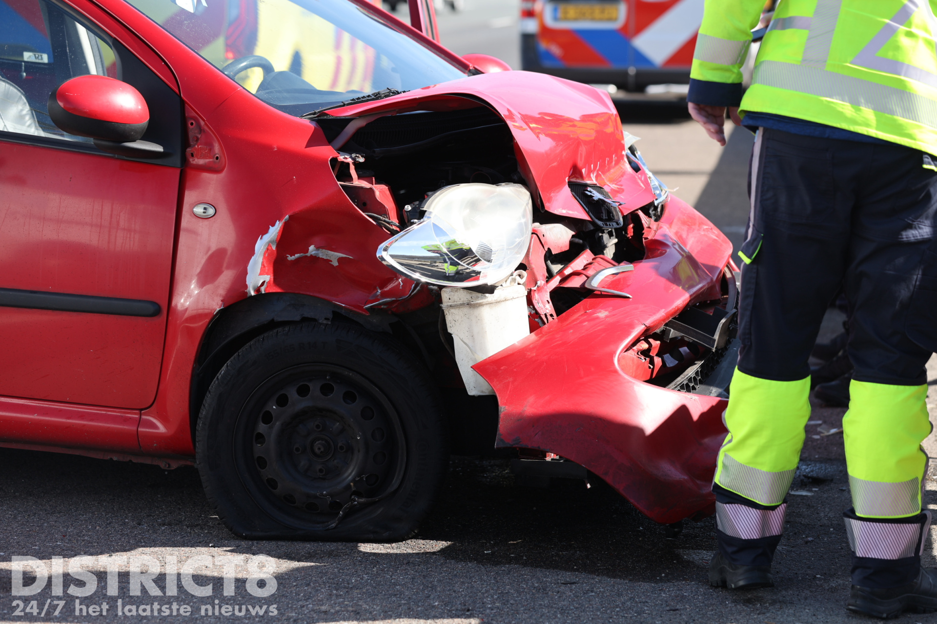 De bestuurster van de rode auto is nagekeken in de ambulance. De auto liep bij het ongeval de meeste schade op.