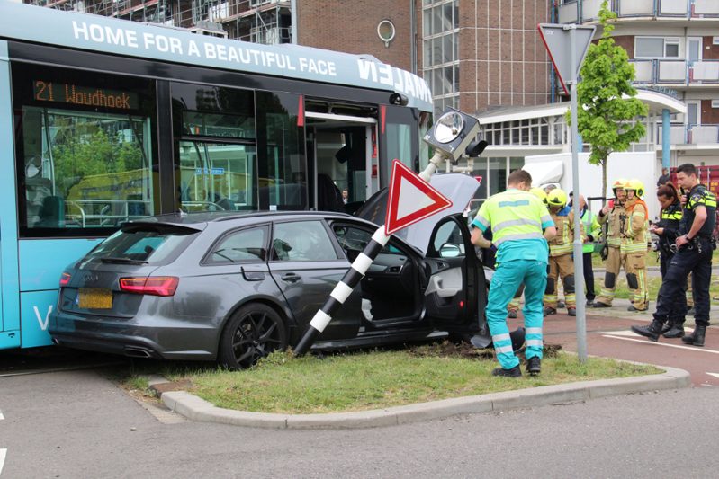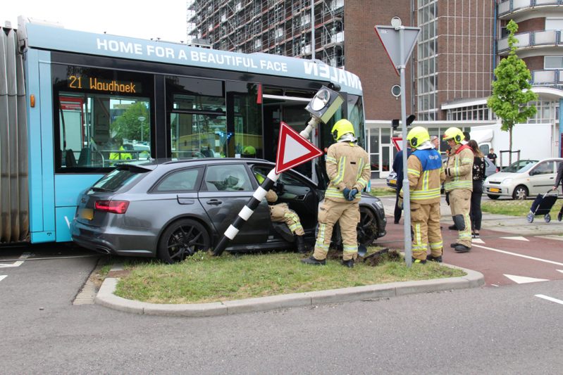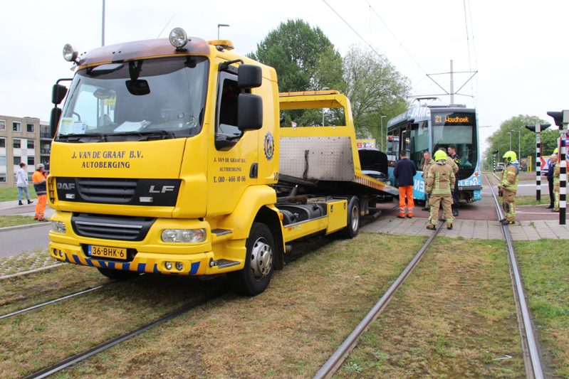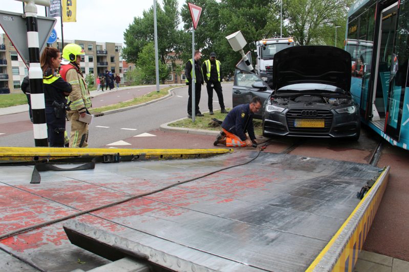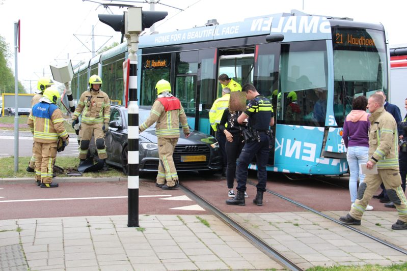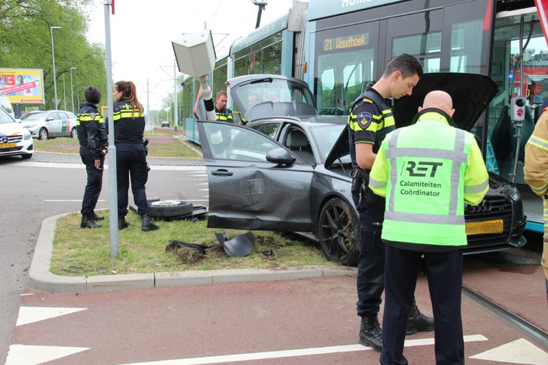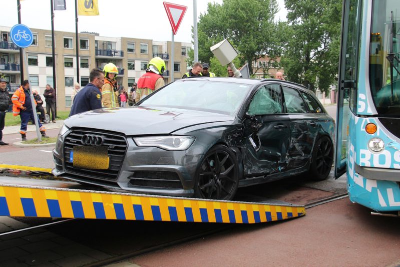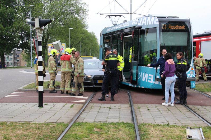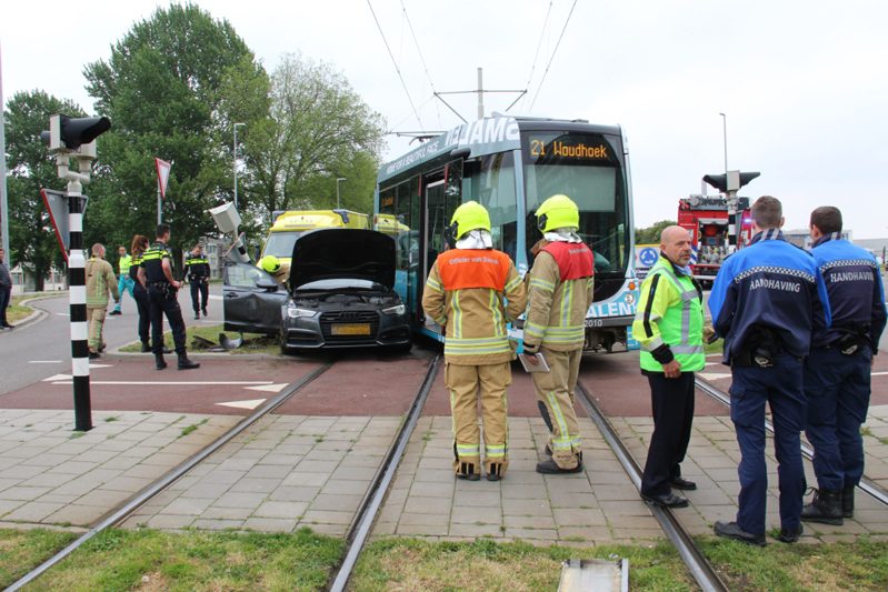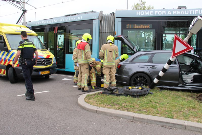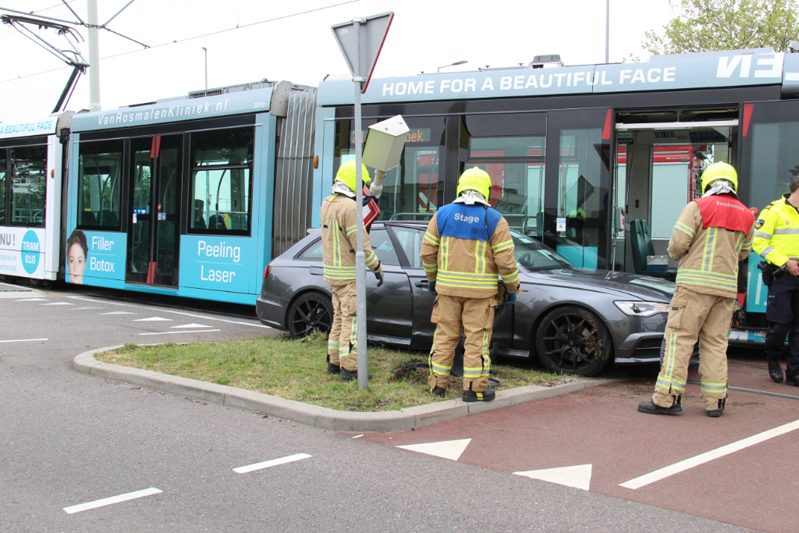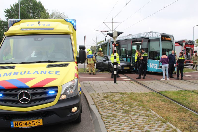 De auto kwam klem te zitten tussen een paal en de tram. De politie, brandweer en meerdere ambulances kwamen met spoed ter plaatse.