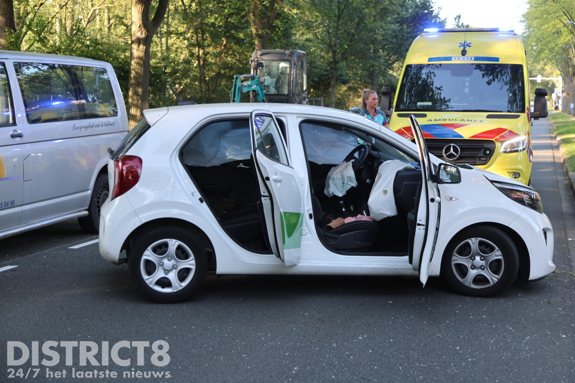 Meerdere politie-eenheden en een ambulance spoedden zich ter plaatse. Bij aankomst bleek er een voertuig tegen een boom te zijn aangereden. De schade is aanzienlijk. Een vrouw werd lopend onder begeleiding van het ambulancepersoneel de ambulance ingebracht en daar gecontroleerd op eventuele verwondingen.