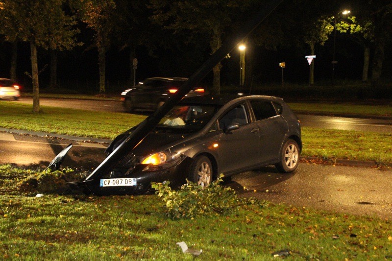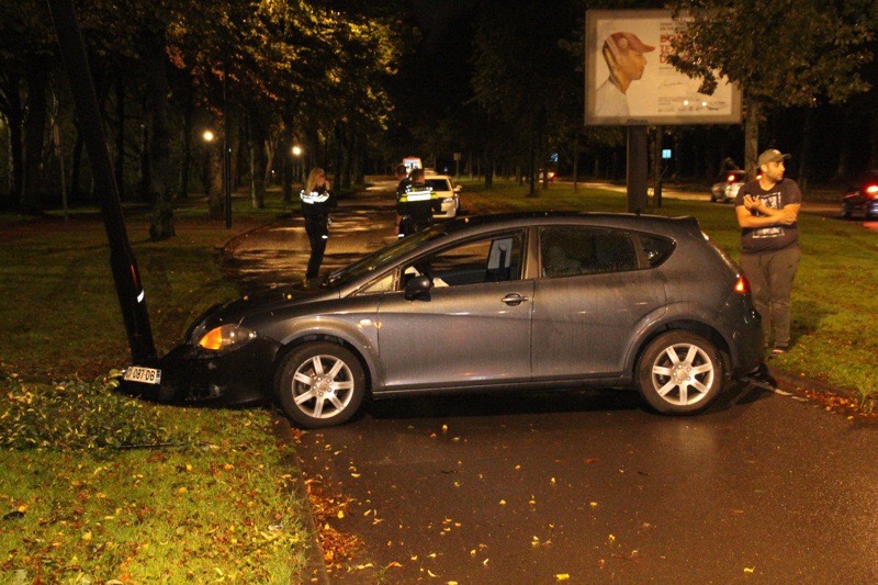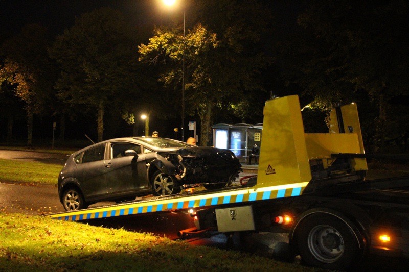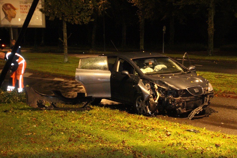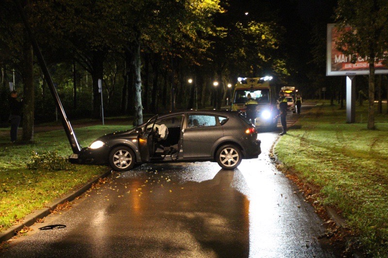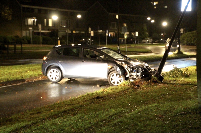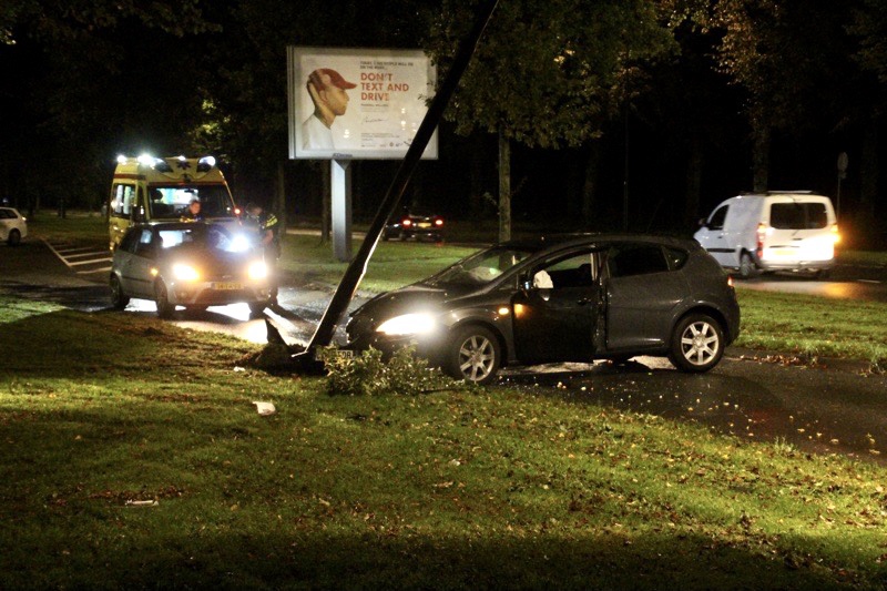 Door nog onbekend oorzaak raakte de bestuurder van de auto de macht over het stuur kwijt en knalde tegen de lichtmast aan.