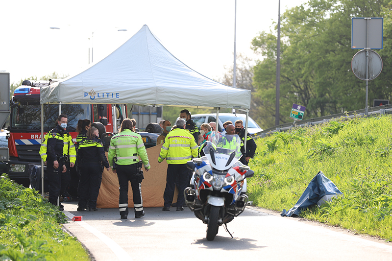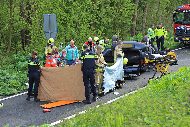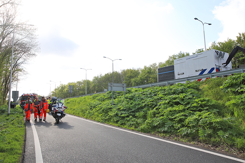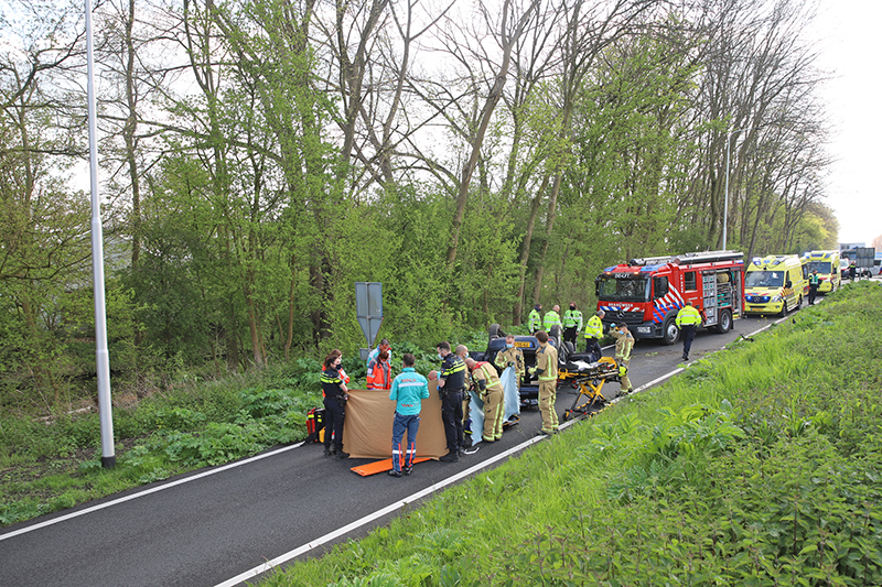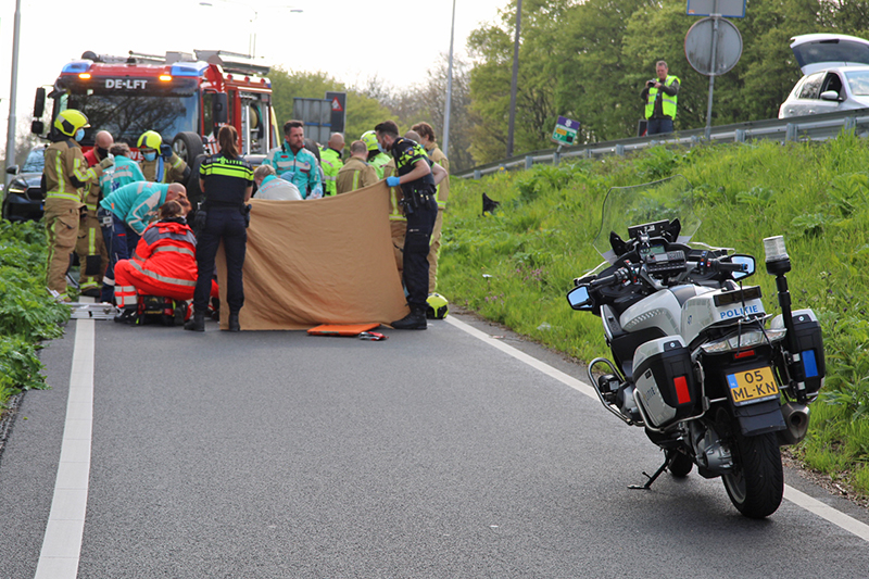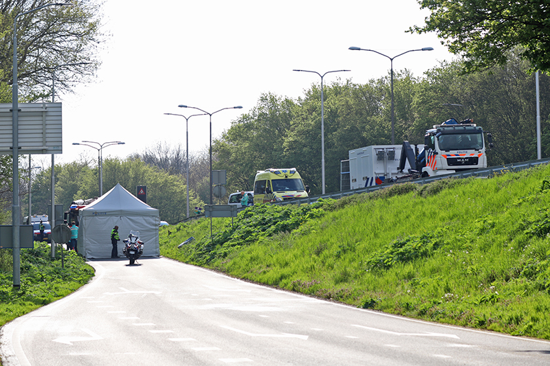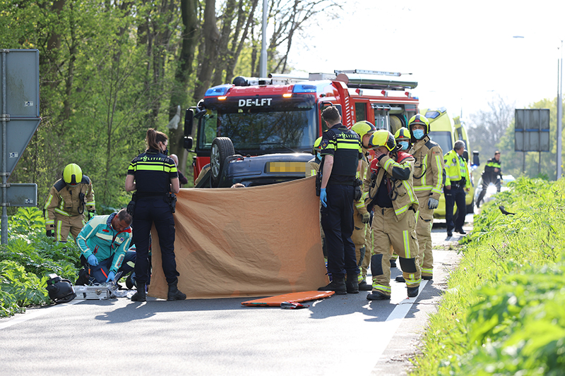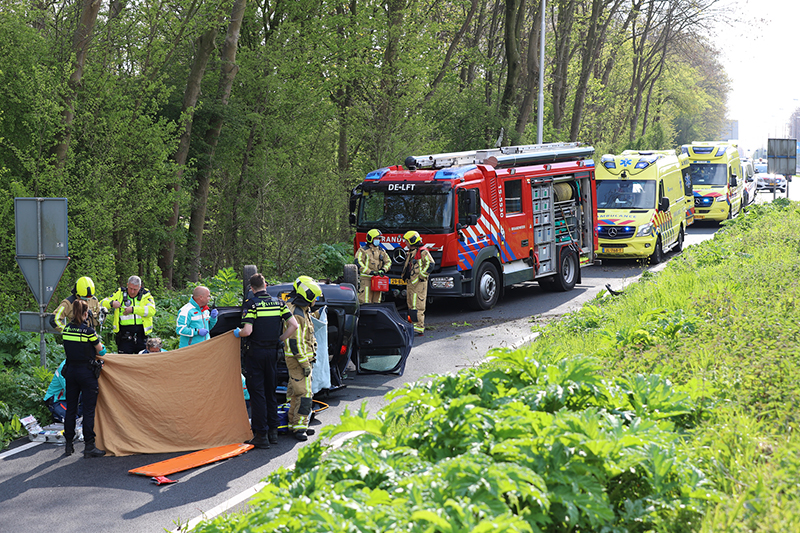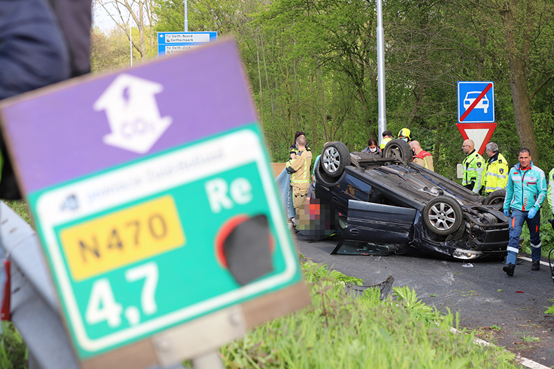 Delft – Op de afrit Schoemakerstraat van de Kruithuisweg (N470) heeft donderdag 29 april aan het eind van de middag een zwaar, eenzijdig ongeval plaatsgevonden. Hierbij is een auto die de afrit wilde nemen in de berm terecht gekomen, waardoor de auto gelanceerd werd en op zijn dak terecht is gekomen. De inzittende van dit voertuig is hierbij om het leven gekomen.