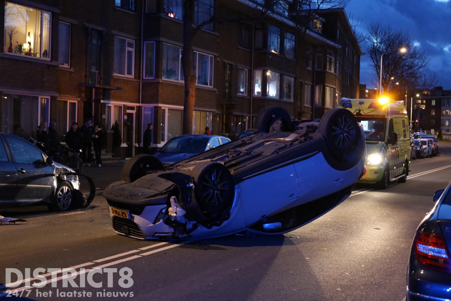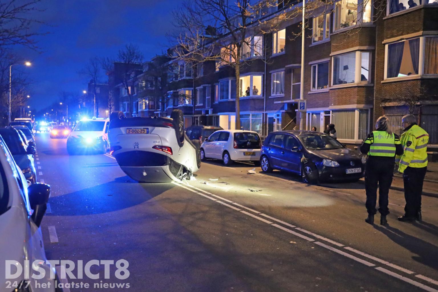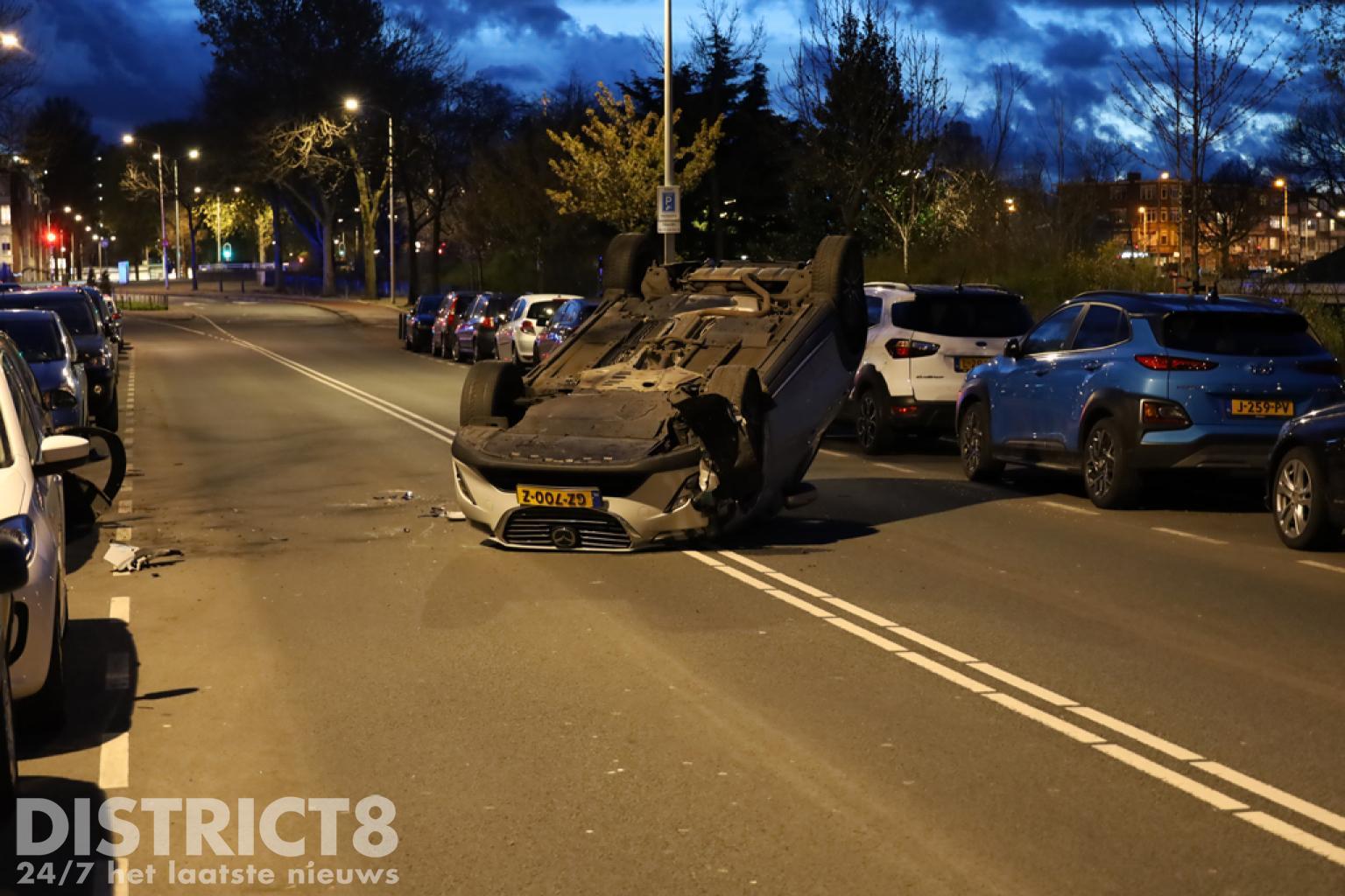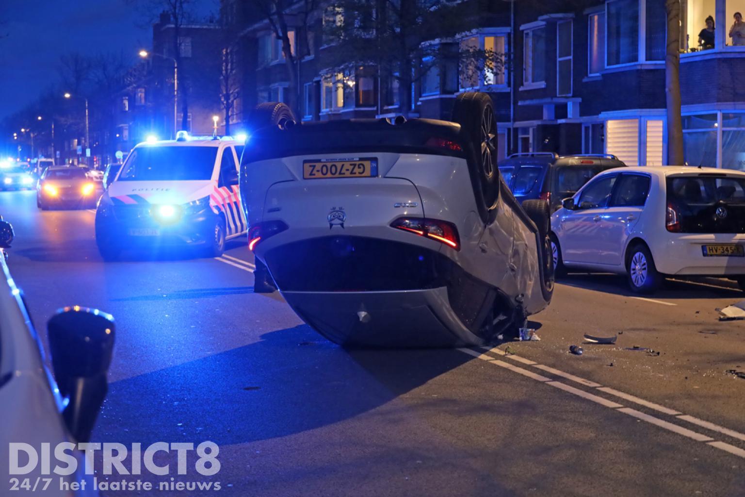 Den Haag – Op de Soestdijksekade in Den Haag is een automobilist met zijn auto op z’n dak terecht gekomen. Dit gebeurde nadat hij in botsing kwam met een geparkeerde auto.