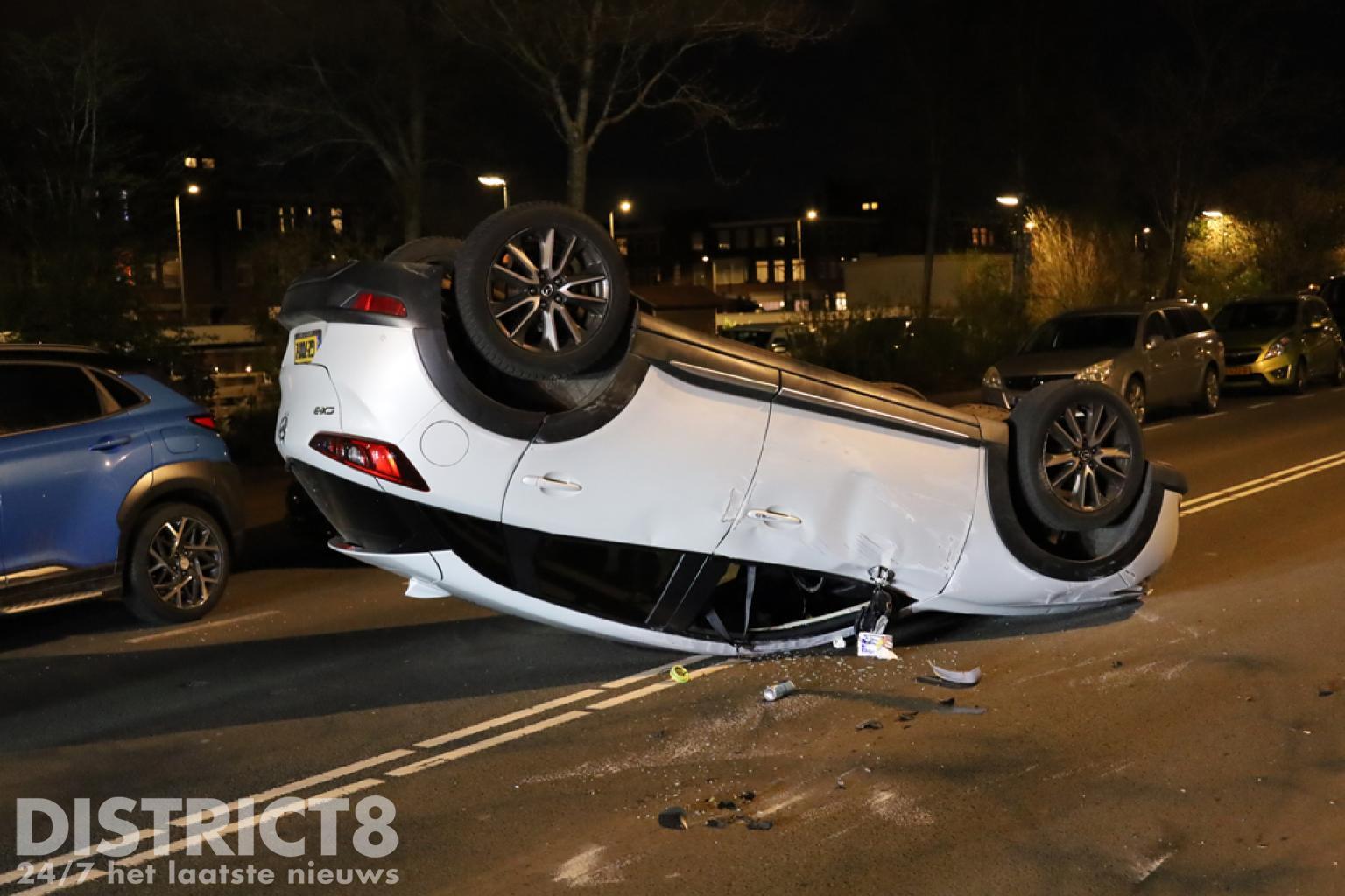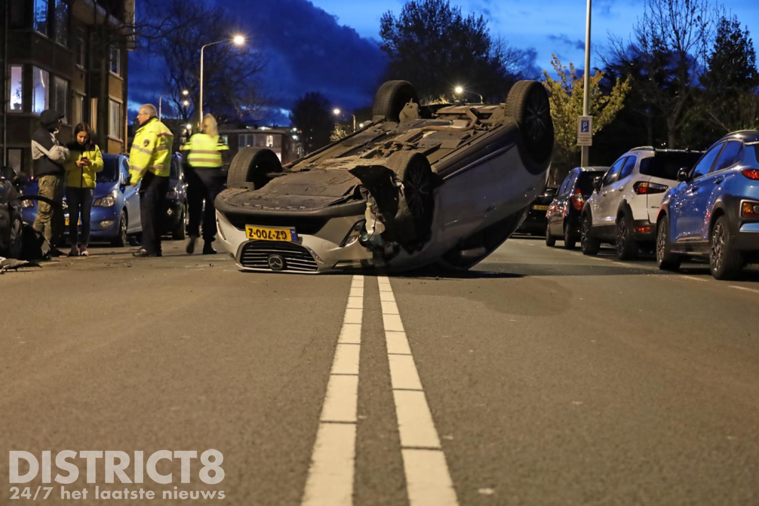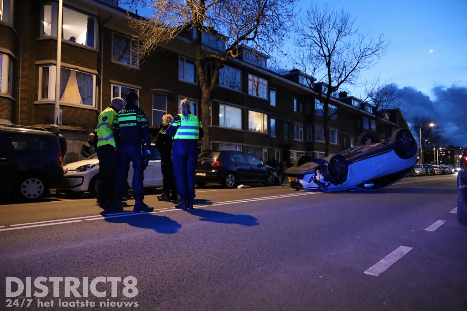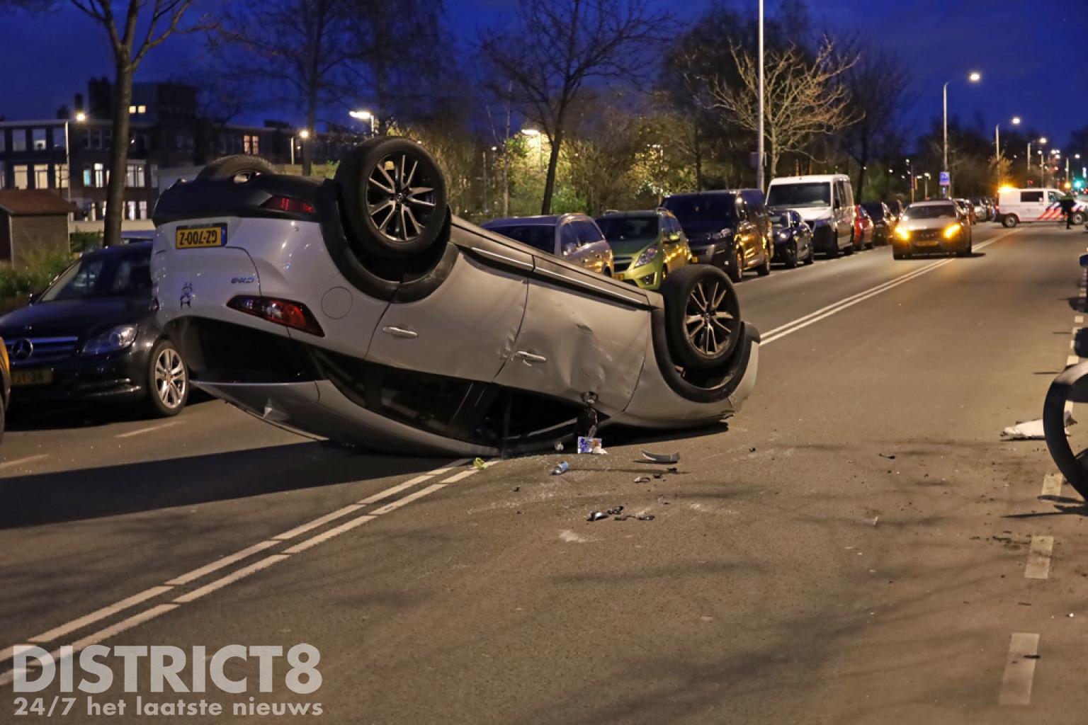 Den Haag – Op de Soestdijksekade in Den Haag is een automobilist met zijn auto op z’n dak terecht gekomen. Dit gebeurde nadat hij in botsing kwam met een geparkeerde auto.