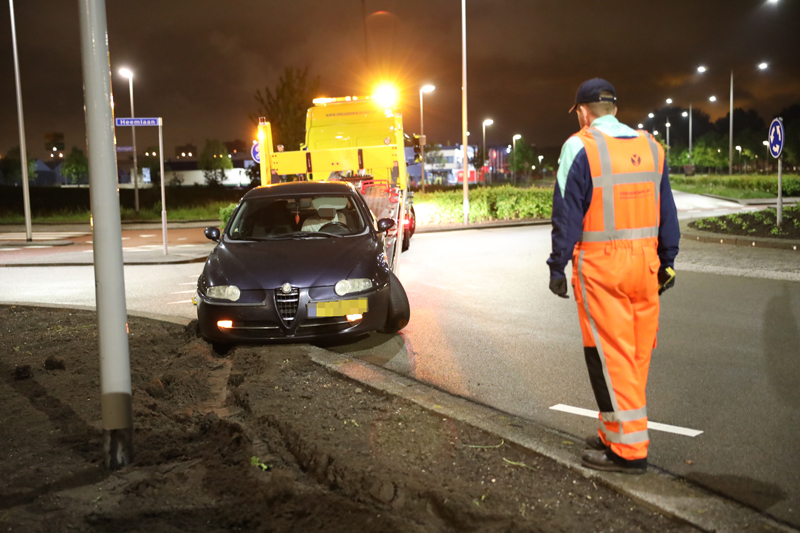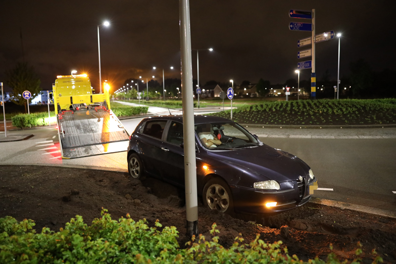 De bestuurder moest tijdens het nemen van de rotonde een stuurcorrectie maken waarna deze over de stoeprand knalde en vast kwam te zitten in de modder.