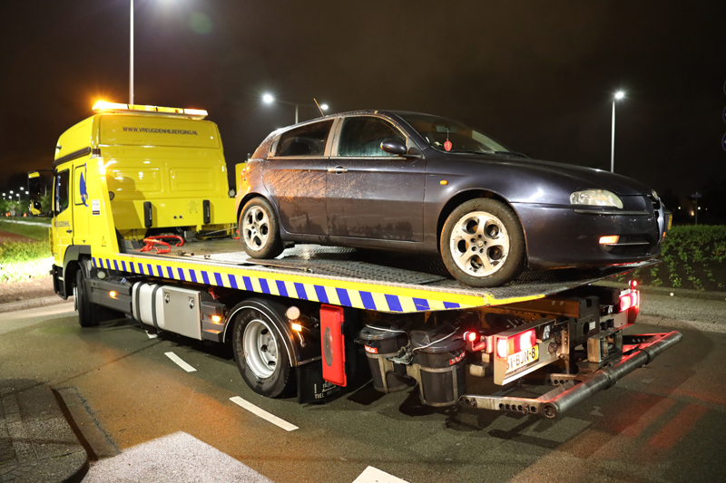 Een berger heeft de auto uit de modder getrokken, de auto heeft door de klap schade opgelopen en is afgevoerd door de berger.
