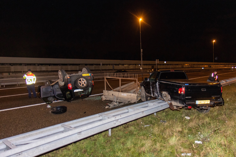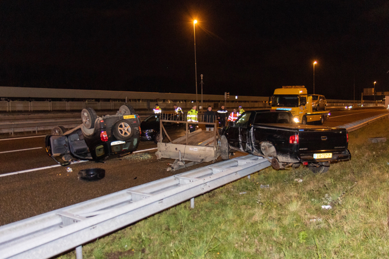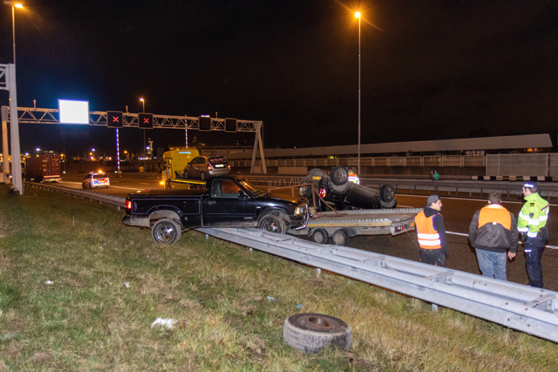 Auto op de kop, andere bovenop vangrail na aanrijding A4 Pernis