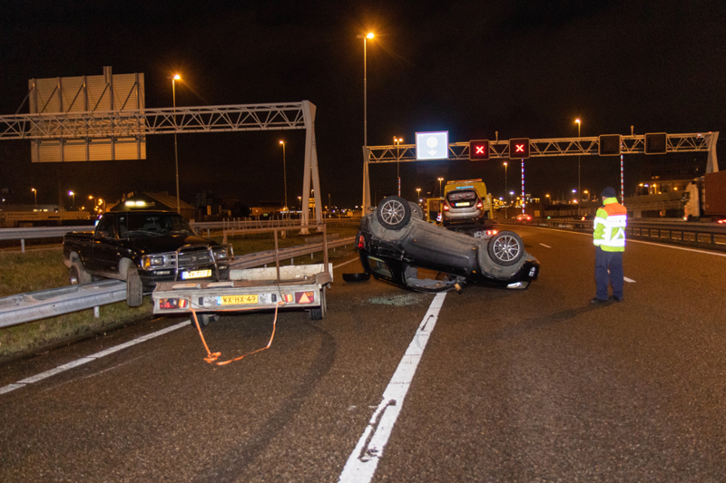 Home Rotterdam-Rijnmond Auto op de kop, andere bovenop vangrail na aanrijding A4 Pernis