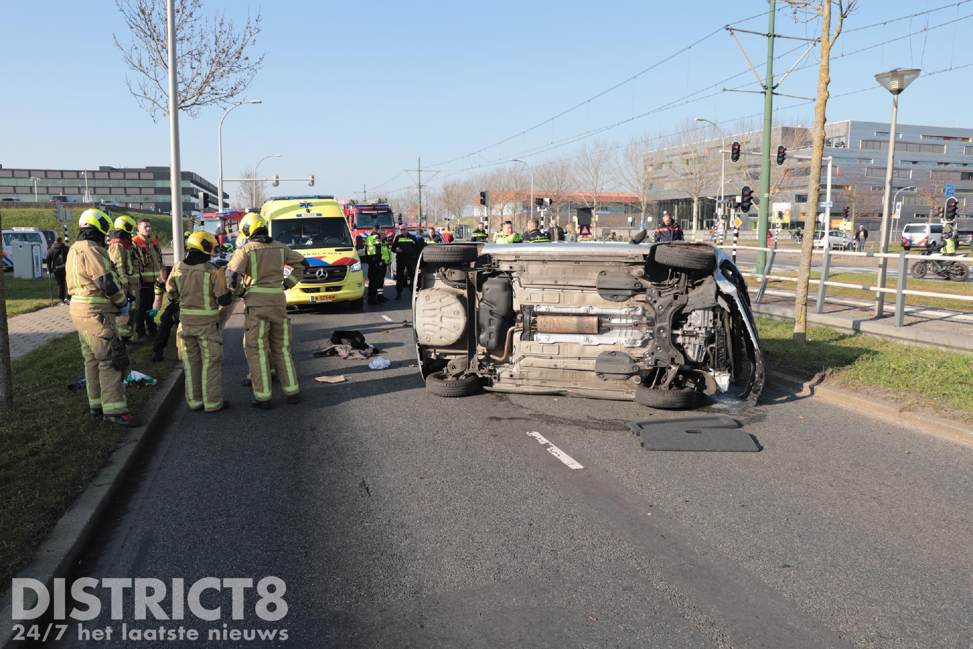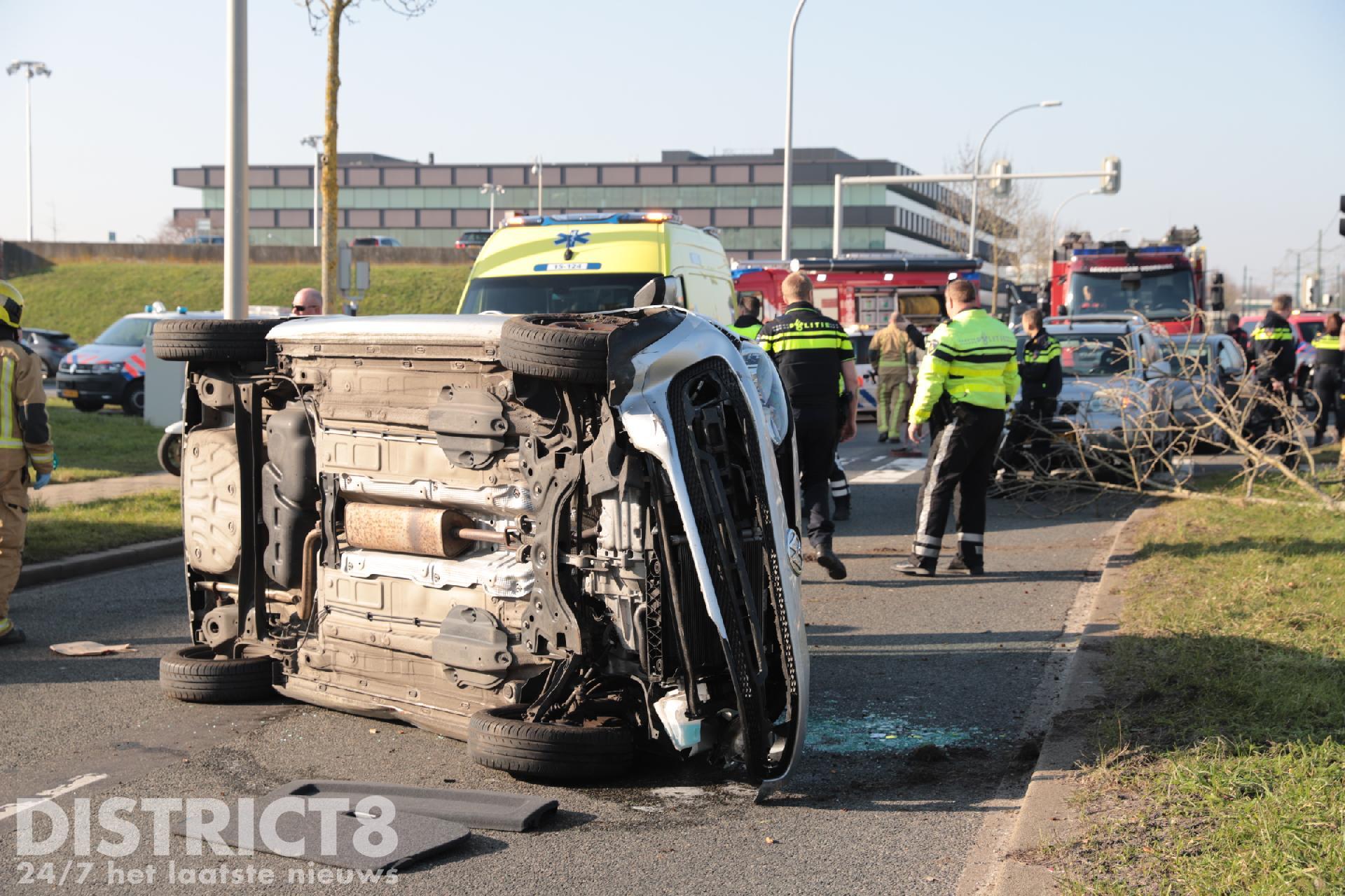 De brandweer heeft het voertuig weer op 4 wielen gezet. Een berger zal ter plaatse komen om het voertuig af te slepen.
