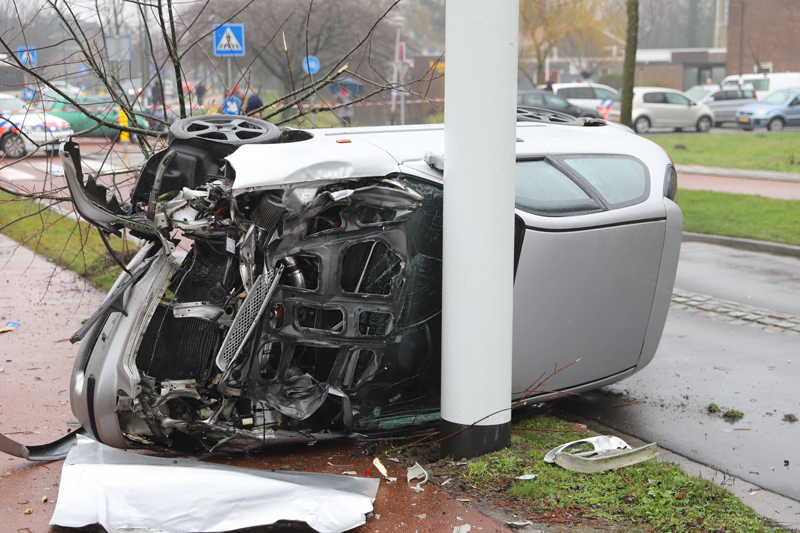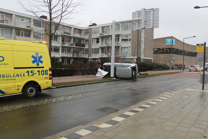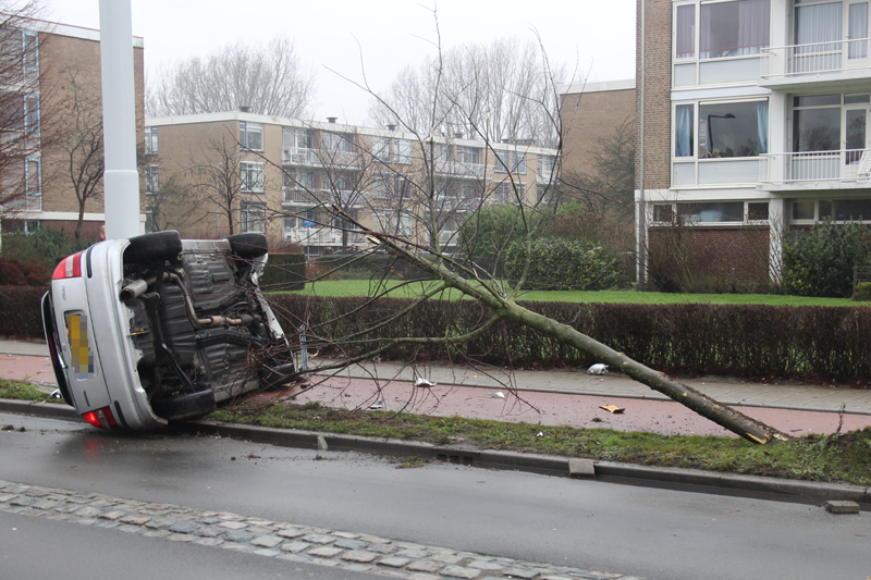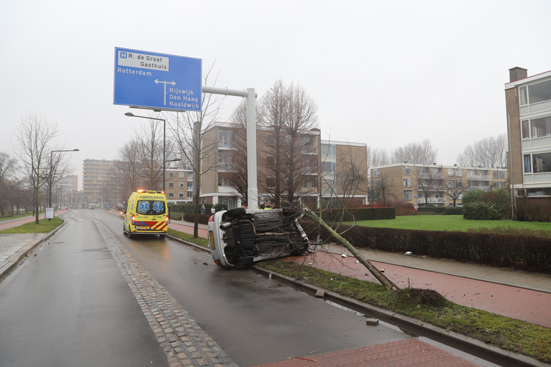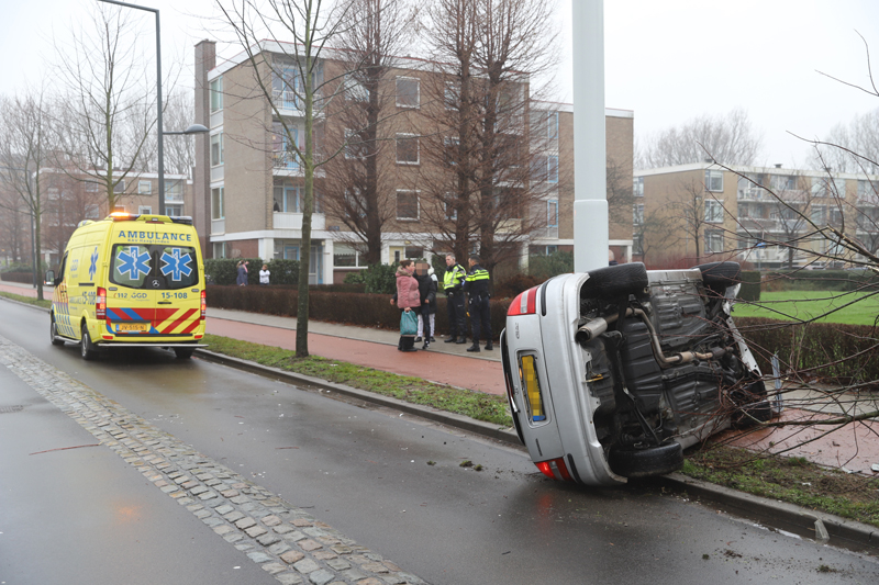 Een automobilist knalde door nog onbekende oorzaak een stoep op, verloor de macht over het stuur, ramde een boompje en kwam op zijn kant tot stilstand tegen een verkeersinformatiebord. De inzittenden kwamen zelfstandig uit het voertuig.