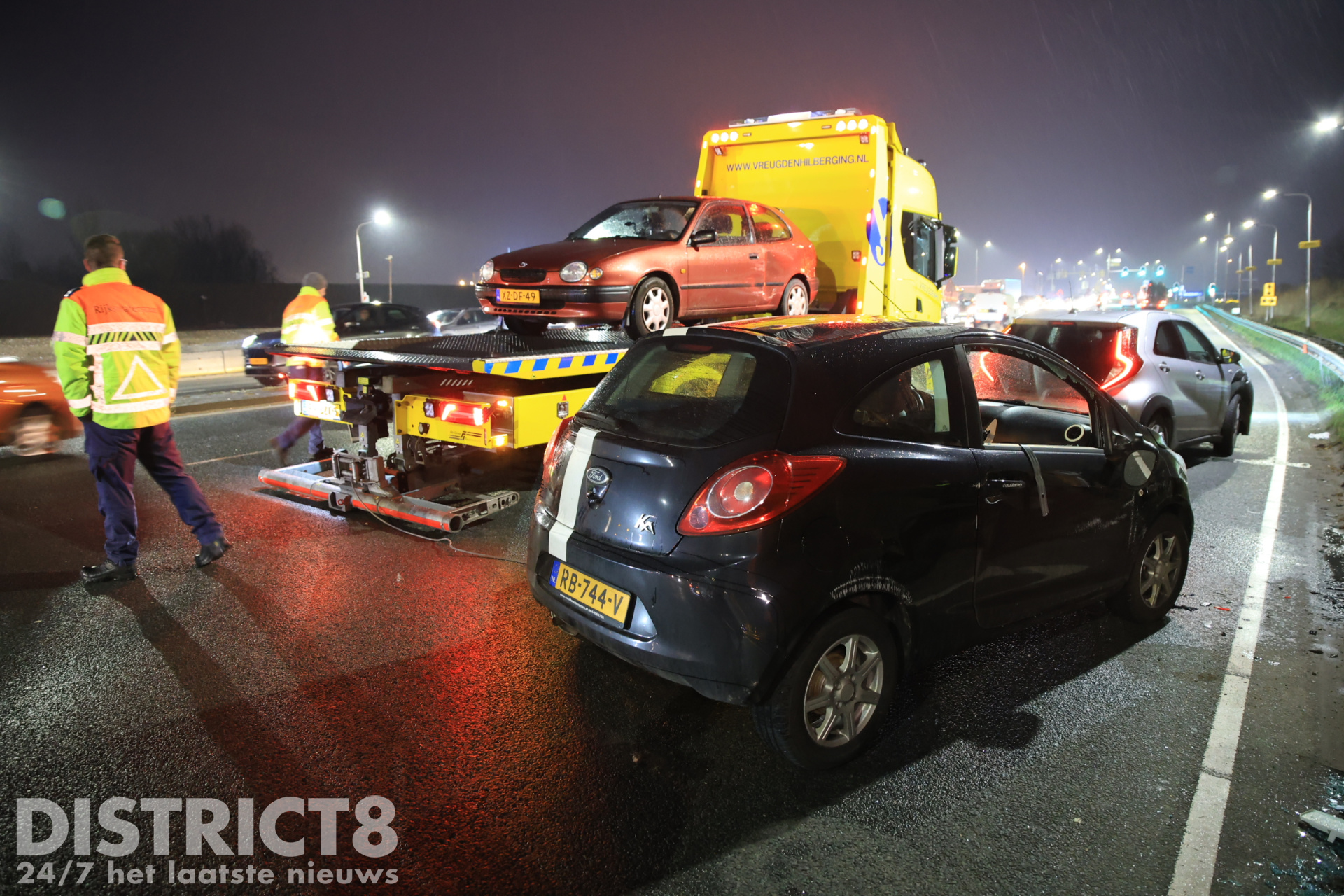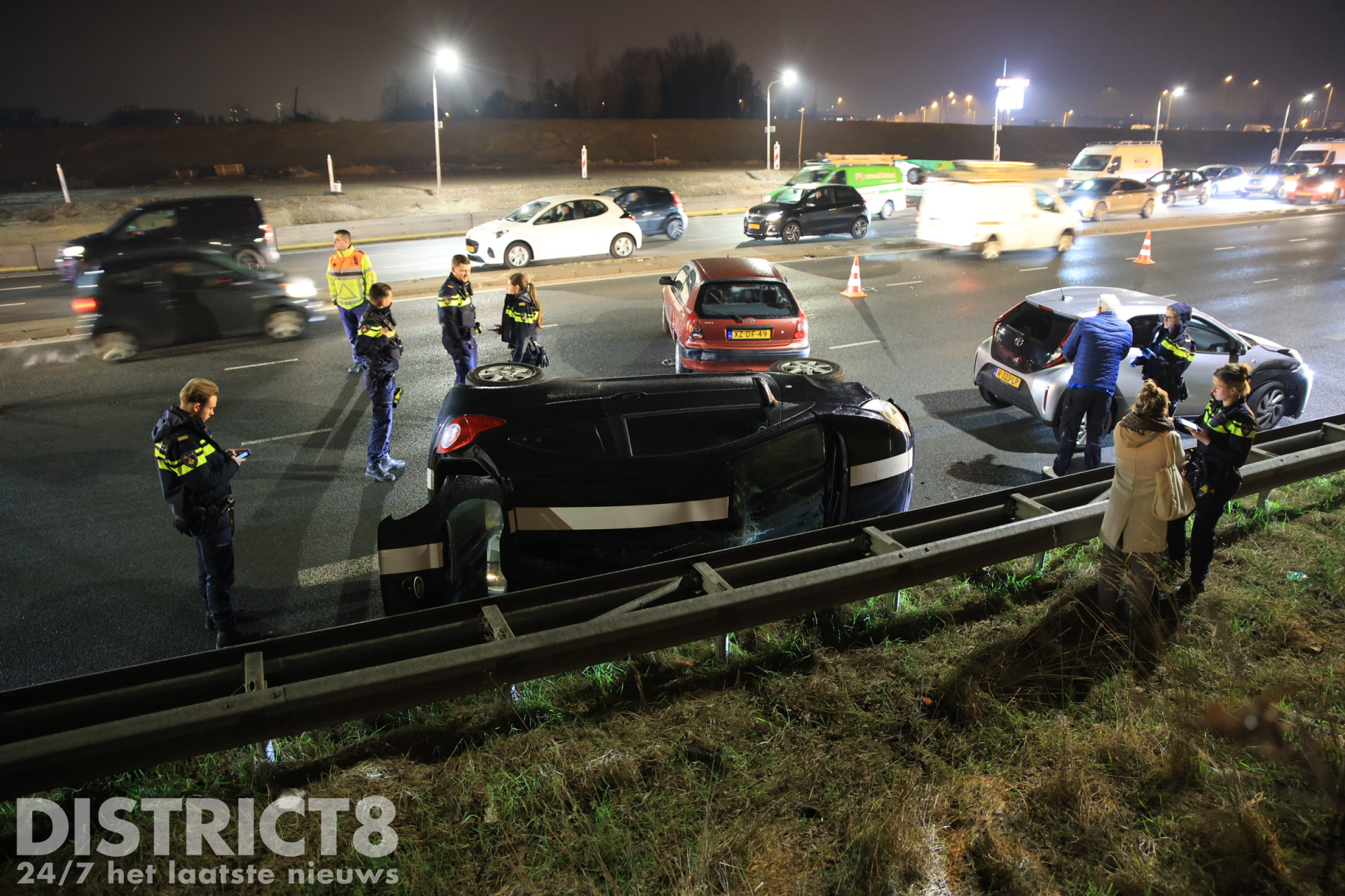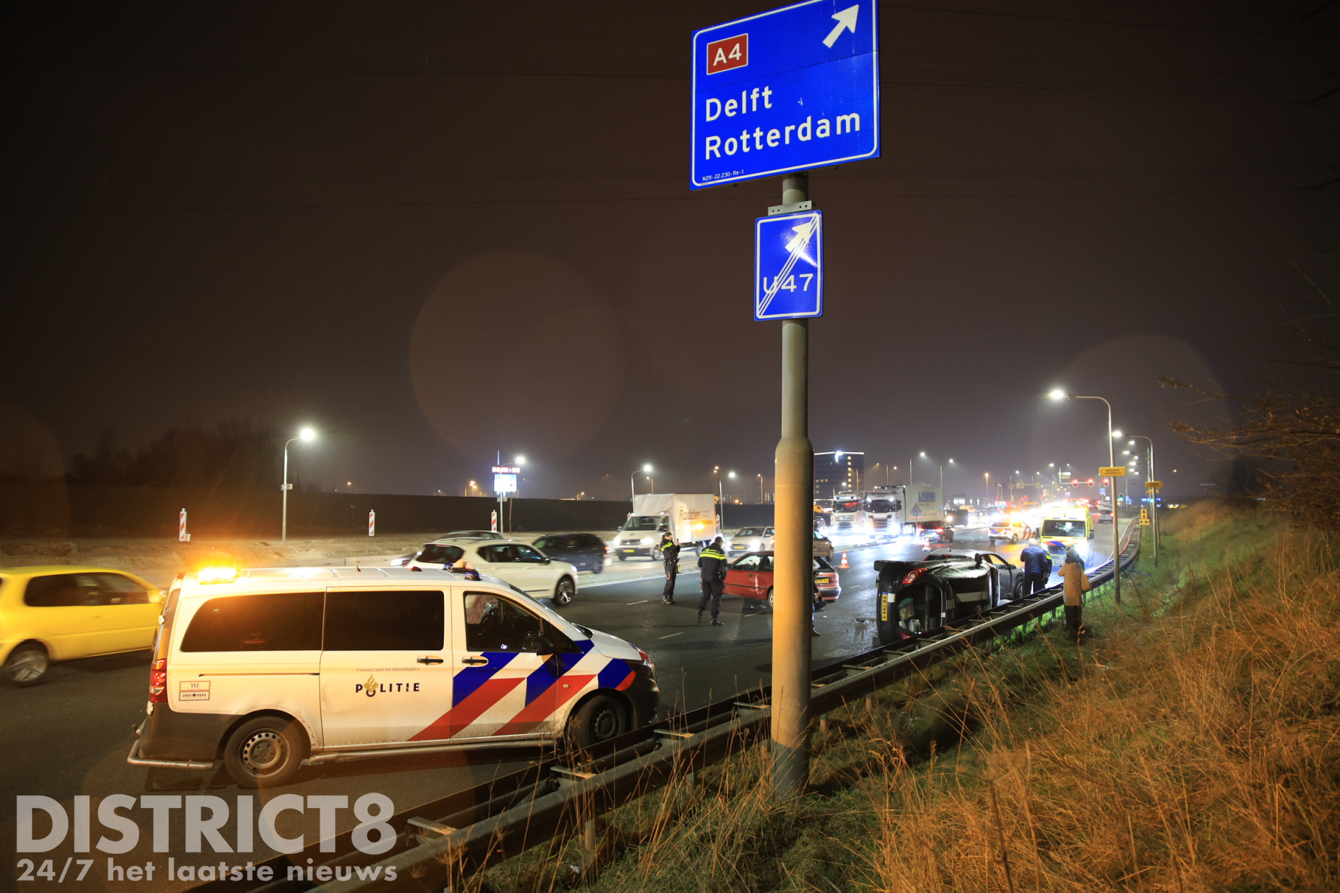 De zwarte auto kwam door de aanrijding op z’n kant terecht tegen de vangrail. Door het incident ontstond een grote file richting de A4.