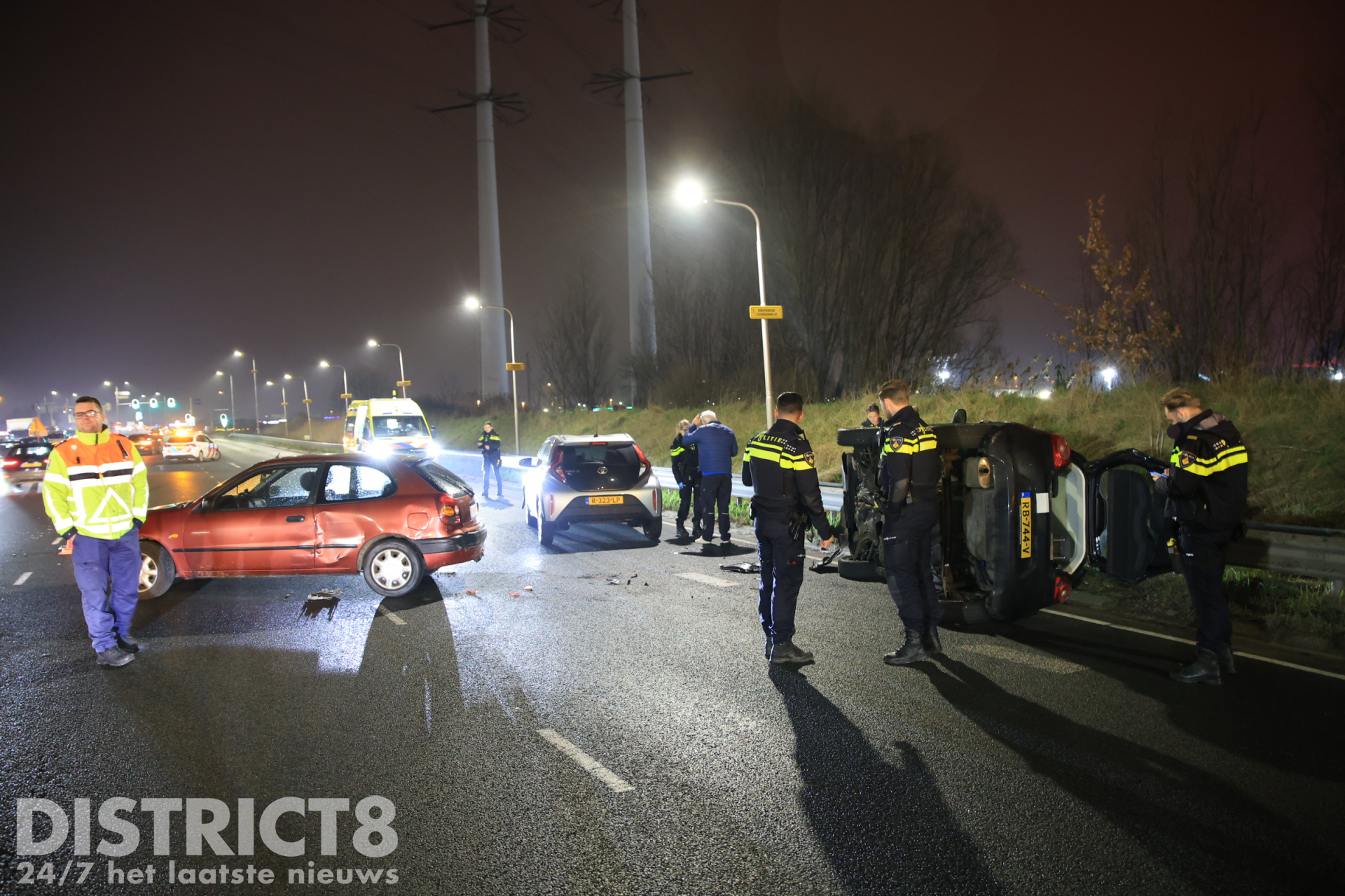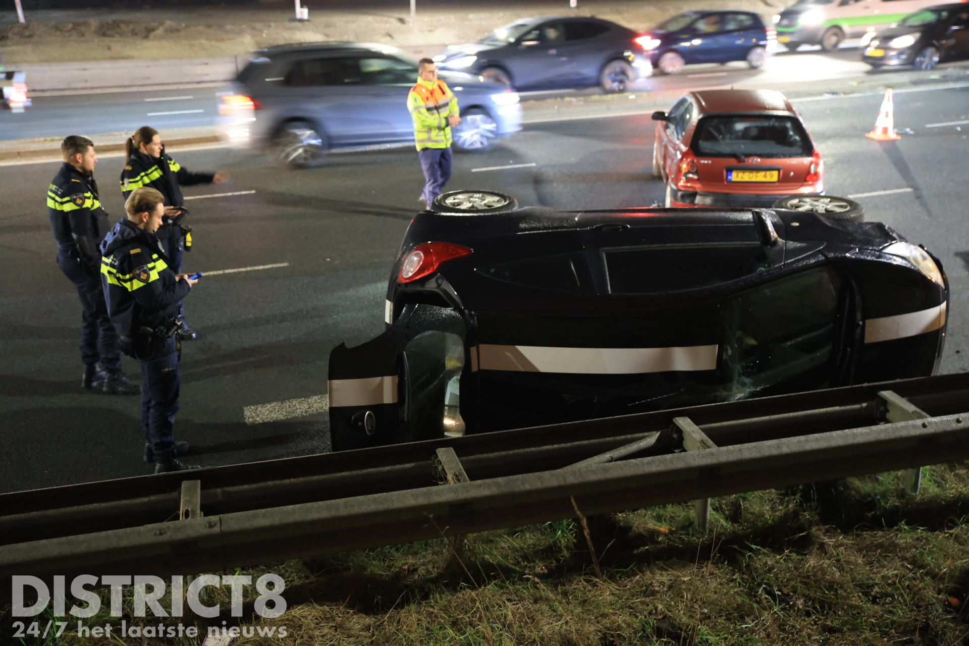 Één persoon uit de op z’n kant geraakte auto is naar het ziekenhuis vervoerd, de brandweer hoefde verder niet ingezet te worden: hun inzet bleef beperkt bij hand- en spandiensten. Een berger is inmiddels bezig met het bergen van de betrokken voertuigen.