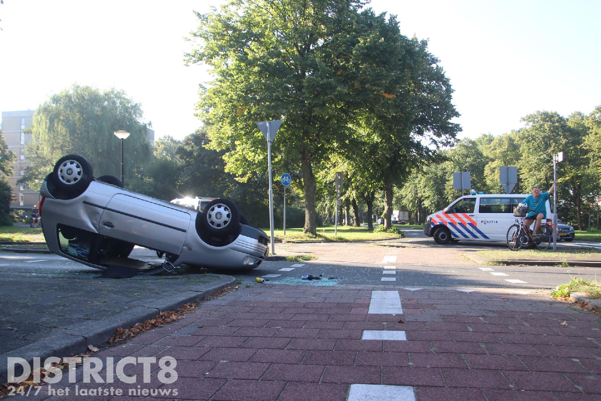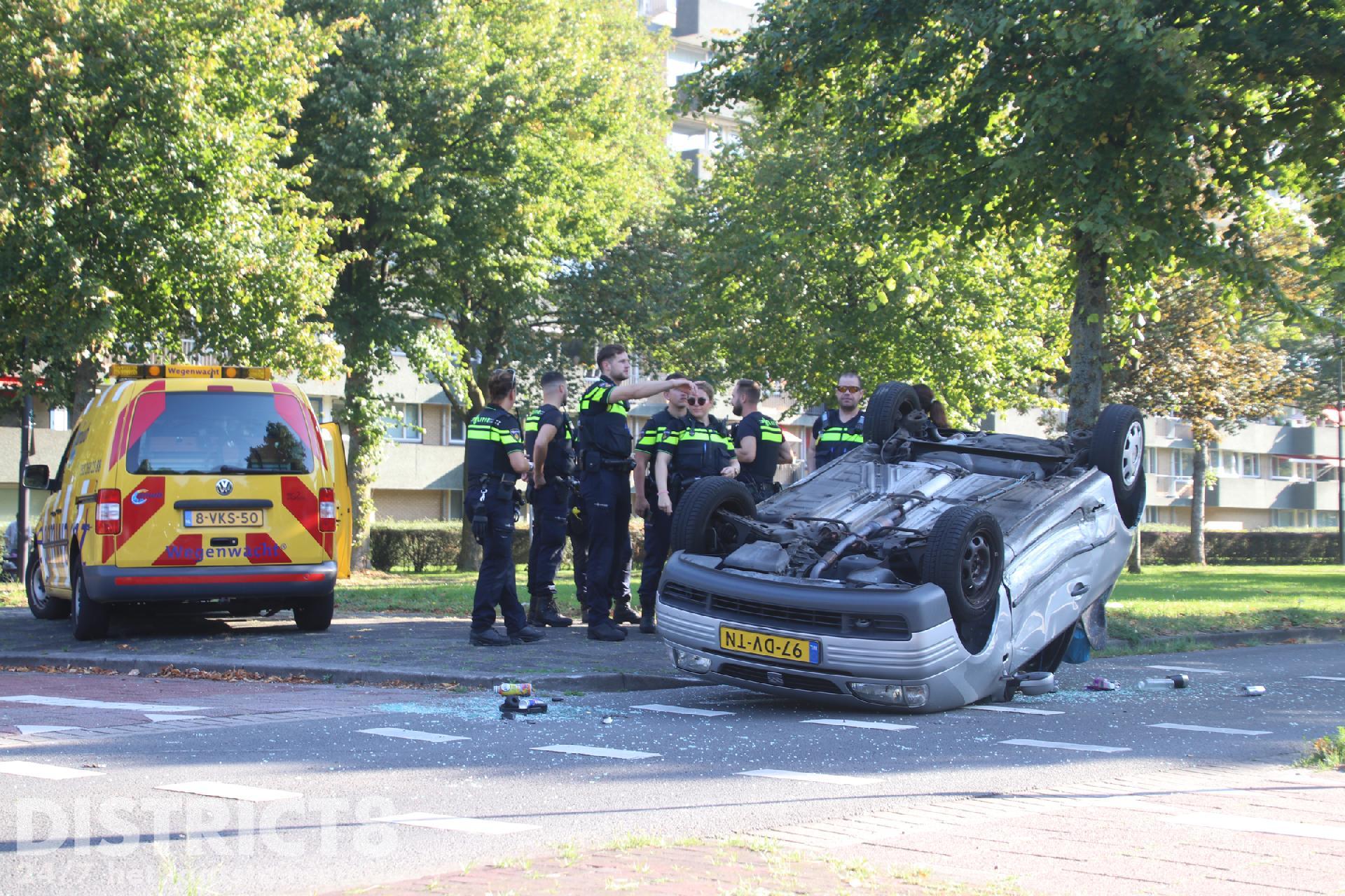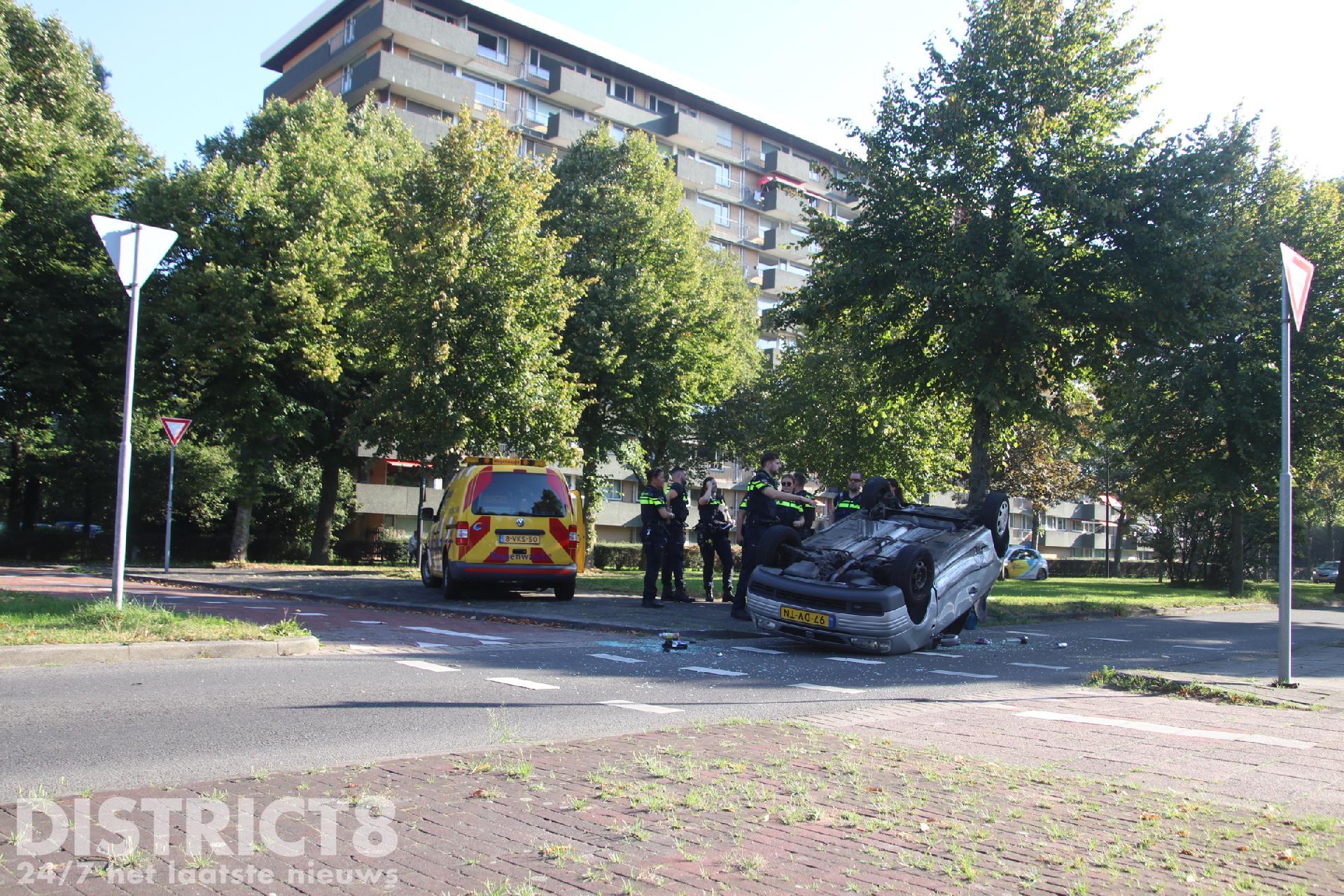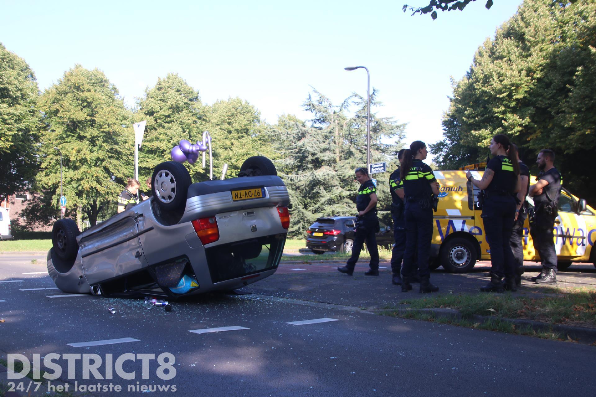 Beide bestuurders zijn gecontroleerd, maar alleen de bestuurder van de op zijn kop geslagen voertuig is naar het ziekenhuis vervoerd.