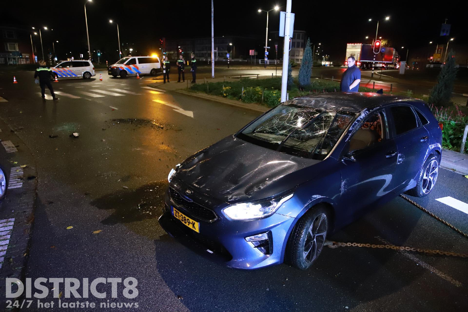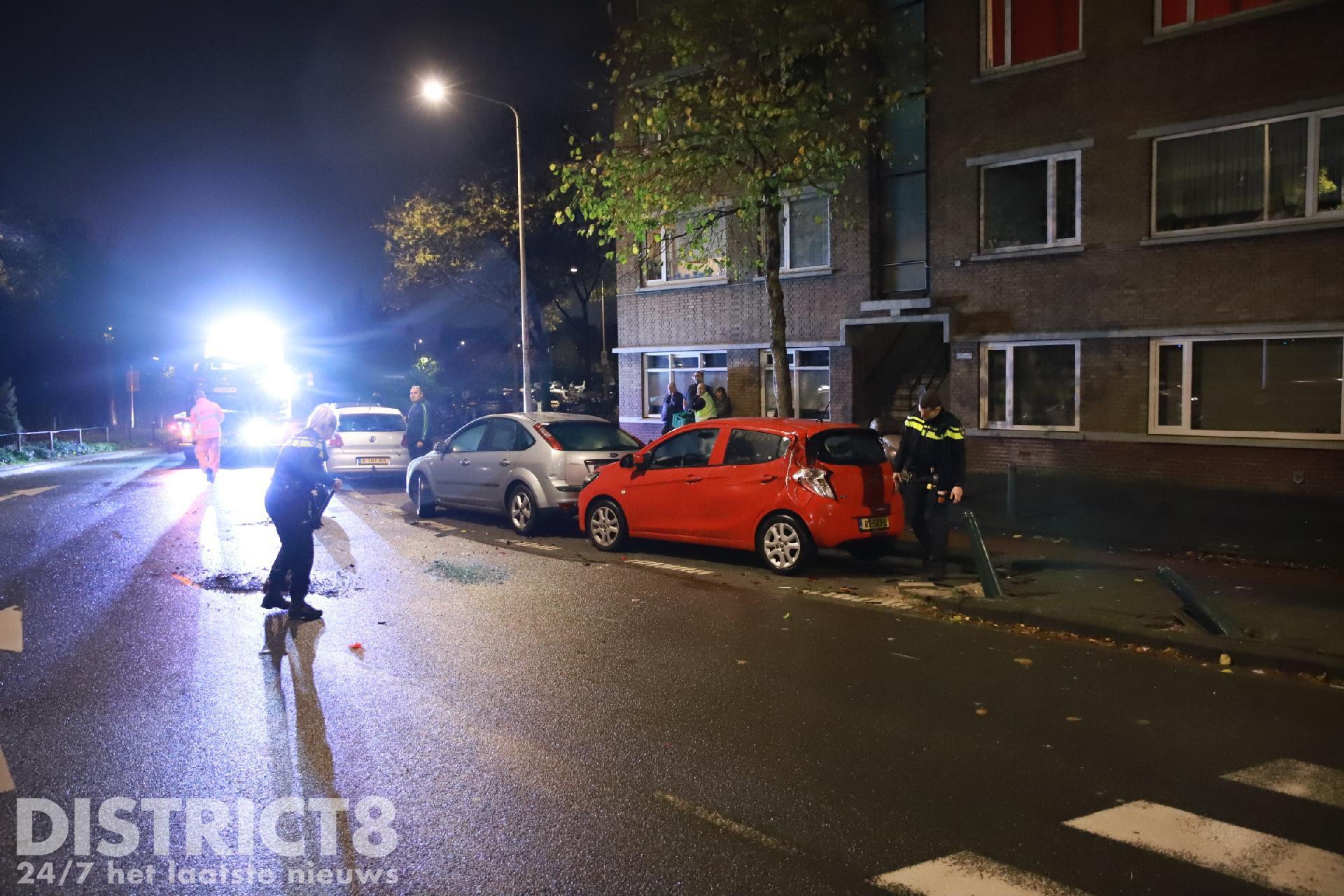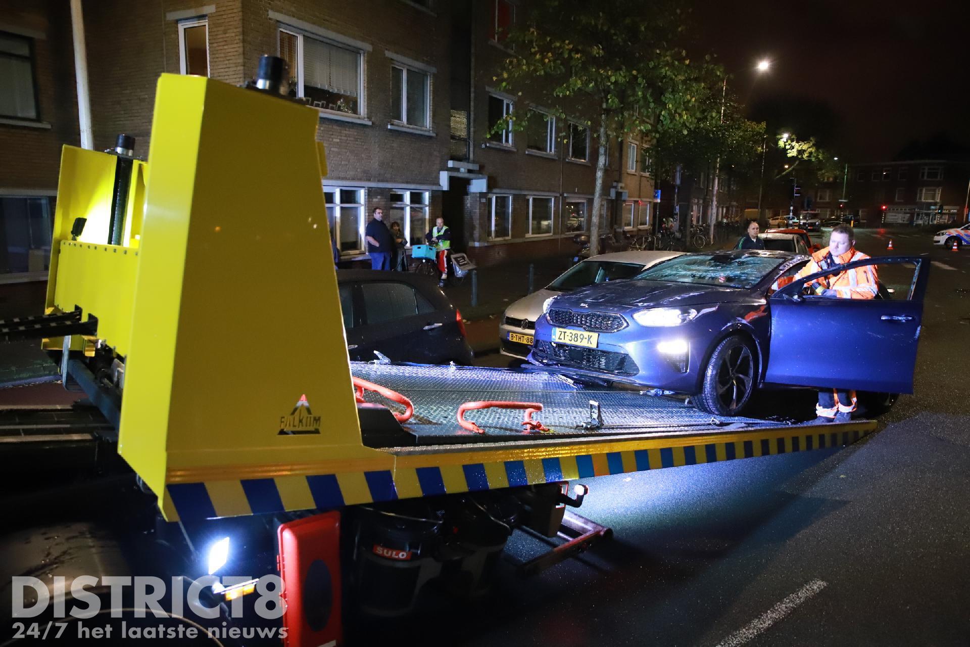 Even na half zes ging het mis. De bestuurder van een Kia schatte de bocht verkeerd in, ramde twee Hagenaartjes, een geparkeerde auto, een andere voorbijrijdende auto en belandde op z’n dak.