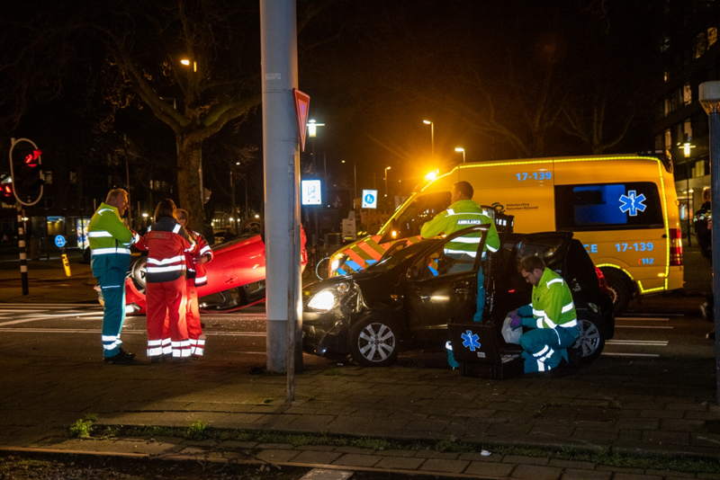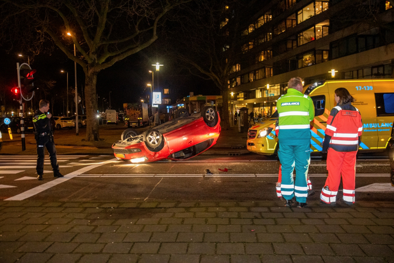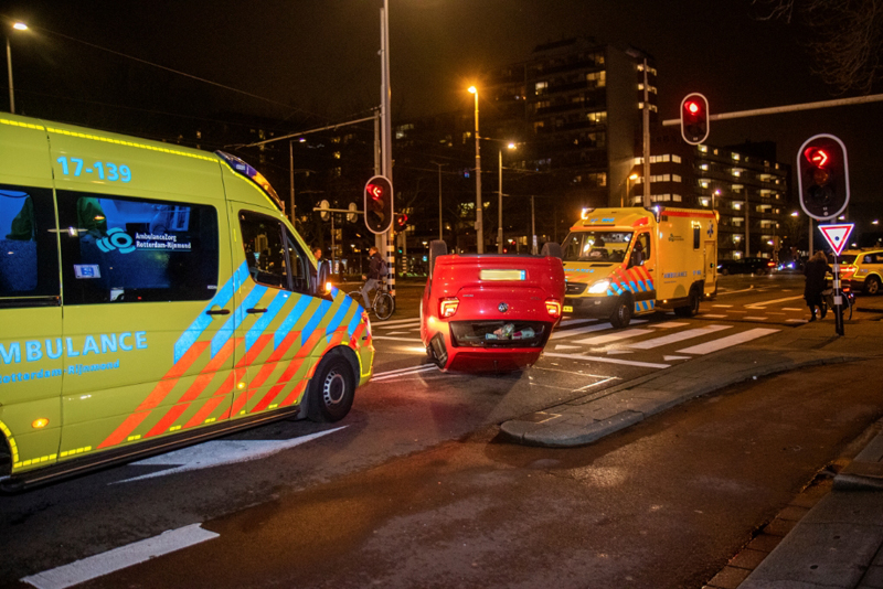 Rotterdam – Op het Bentinckplein in Rotterdam heeft zondagavond een aanrijding plaatsgevonden tussen twee auto’s. Een van de auto’s kwam ondersteboven tot stilstand.