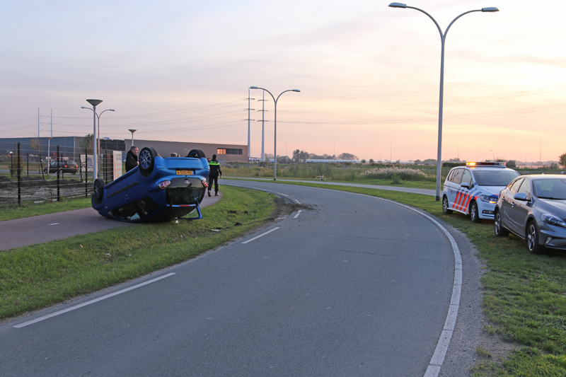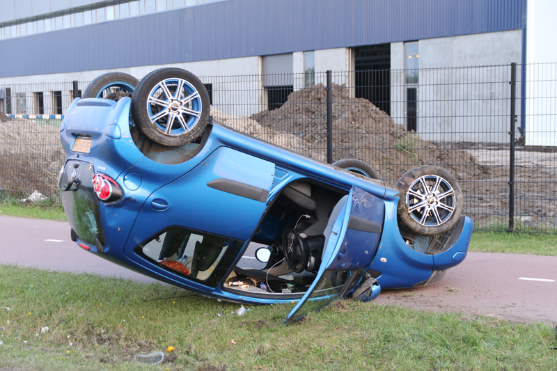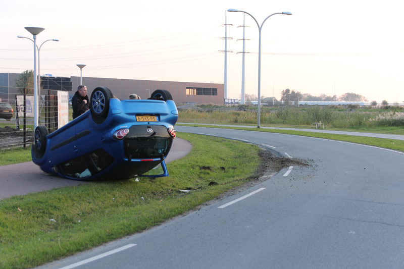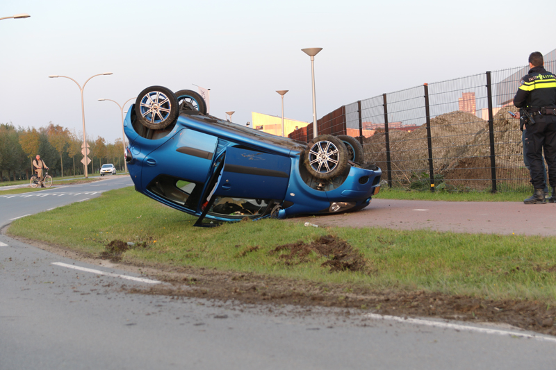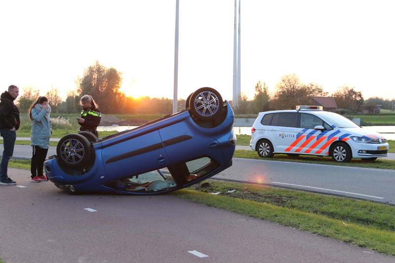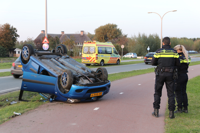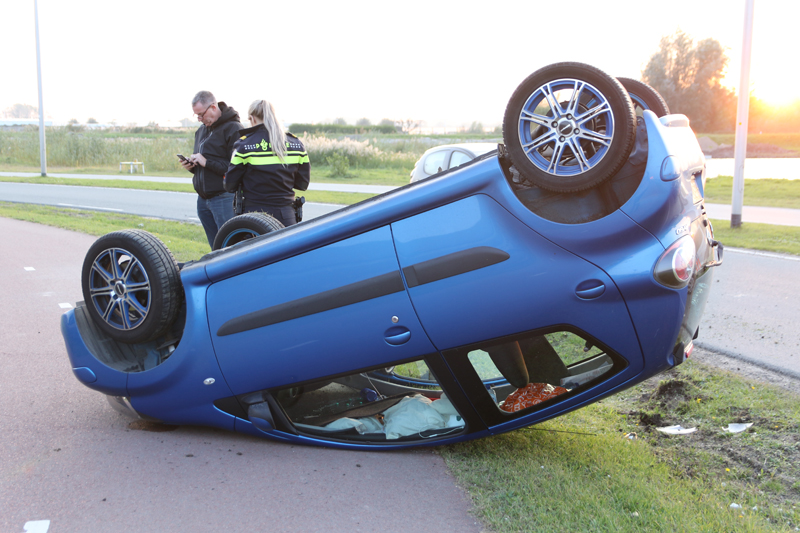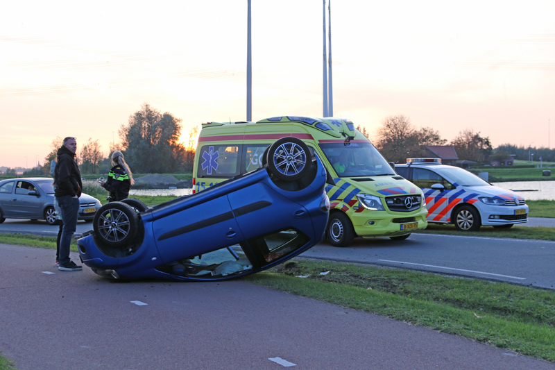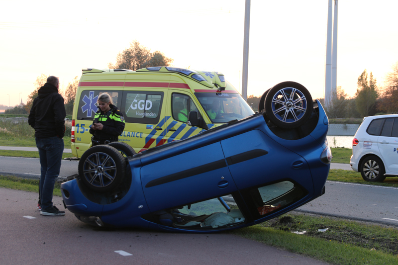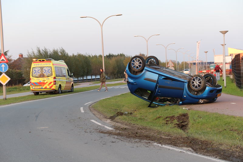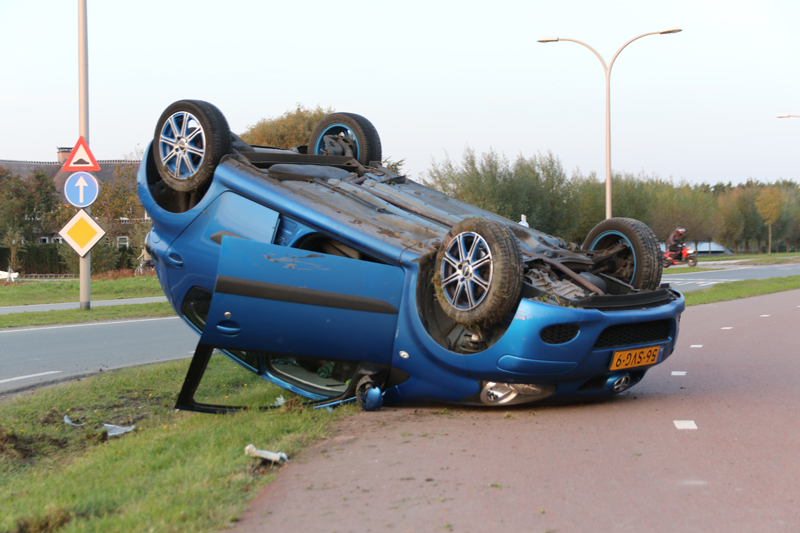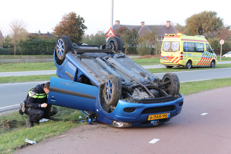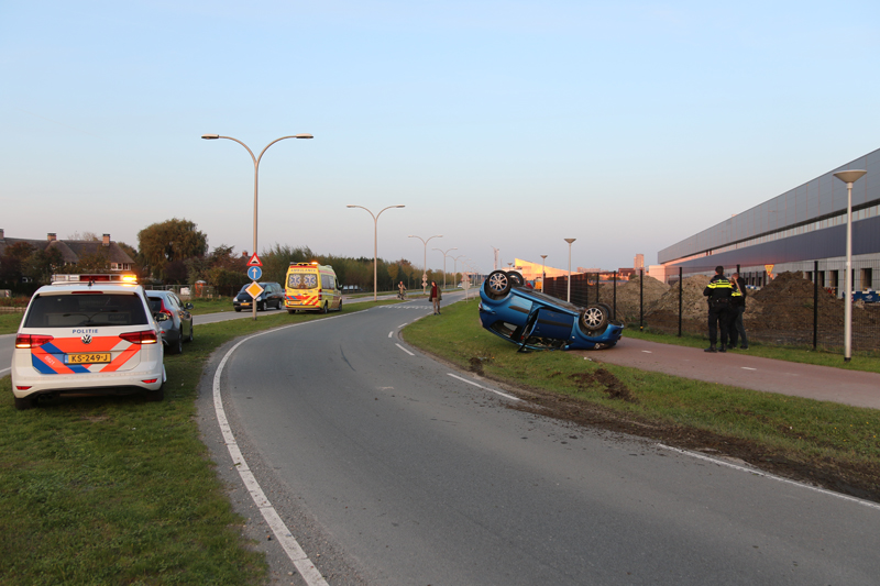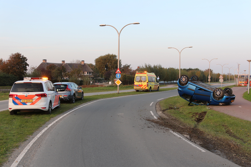 Den Hoorn – Op de Harnaschdreef in Den Hoorn is een automobiliste met haar auto over de kop geslagen. De vrouw kwam met de rechterkant van de auto in de berm en raakte de macht over het stuur kwijt. De auto raakte hierdoor over de kop.