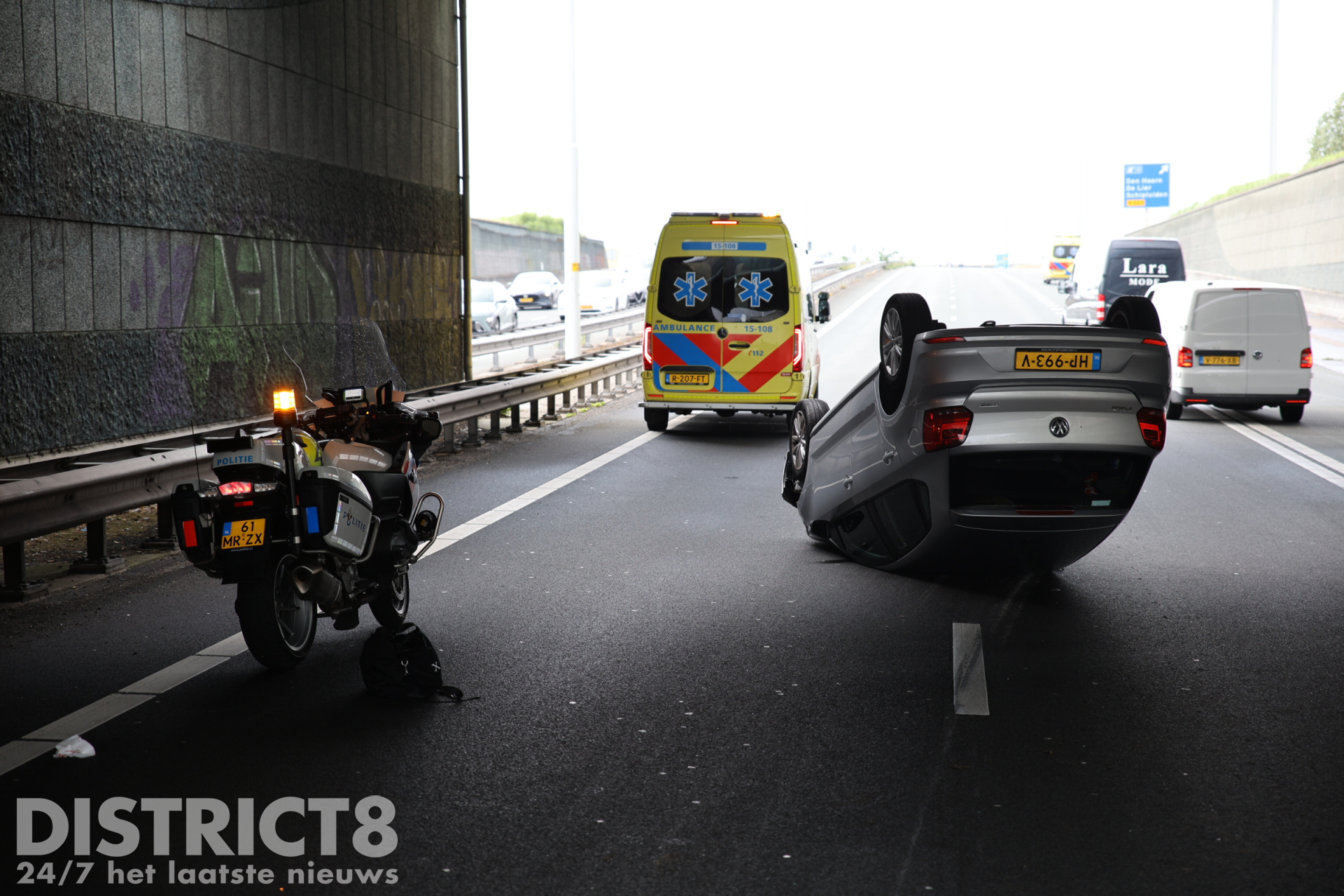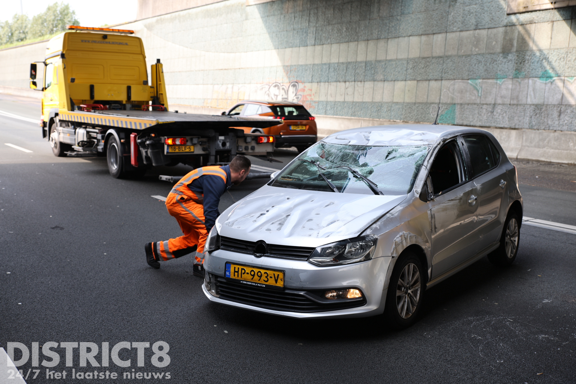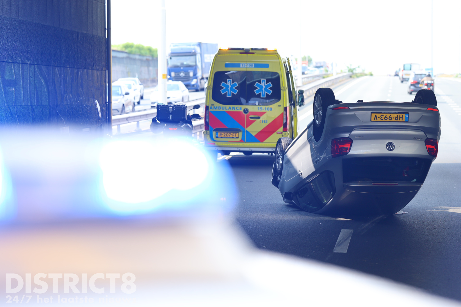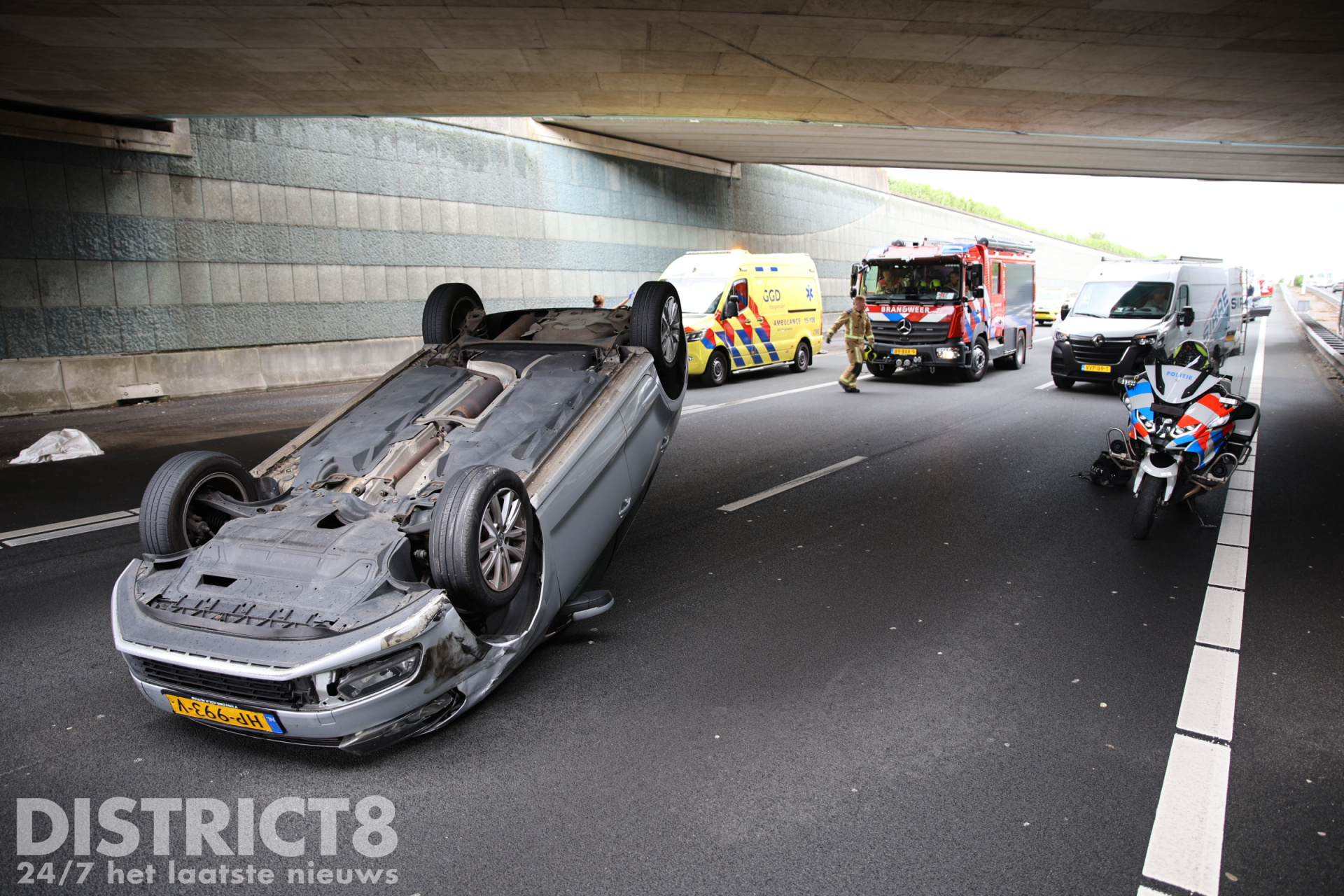 Schipluiden – Op de A4 bij het Gaag-aquaduct is donderdagmiddag 5 juni een auto over de kop geslagen na een aanrijding. De bestuurder moest uitwijken voor een vrachtwagen, waarbij het voertuig aan de achterkant werd geraakt en over de kop sloeg.