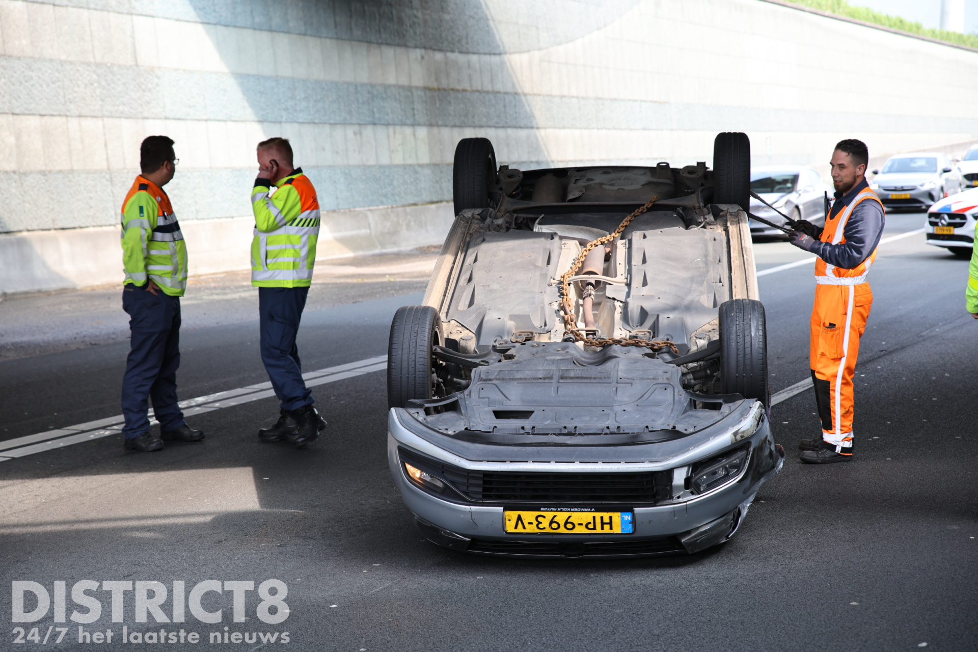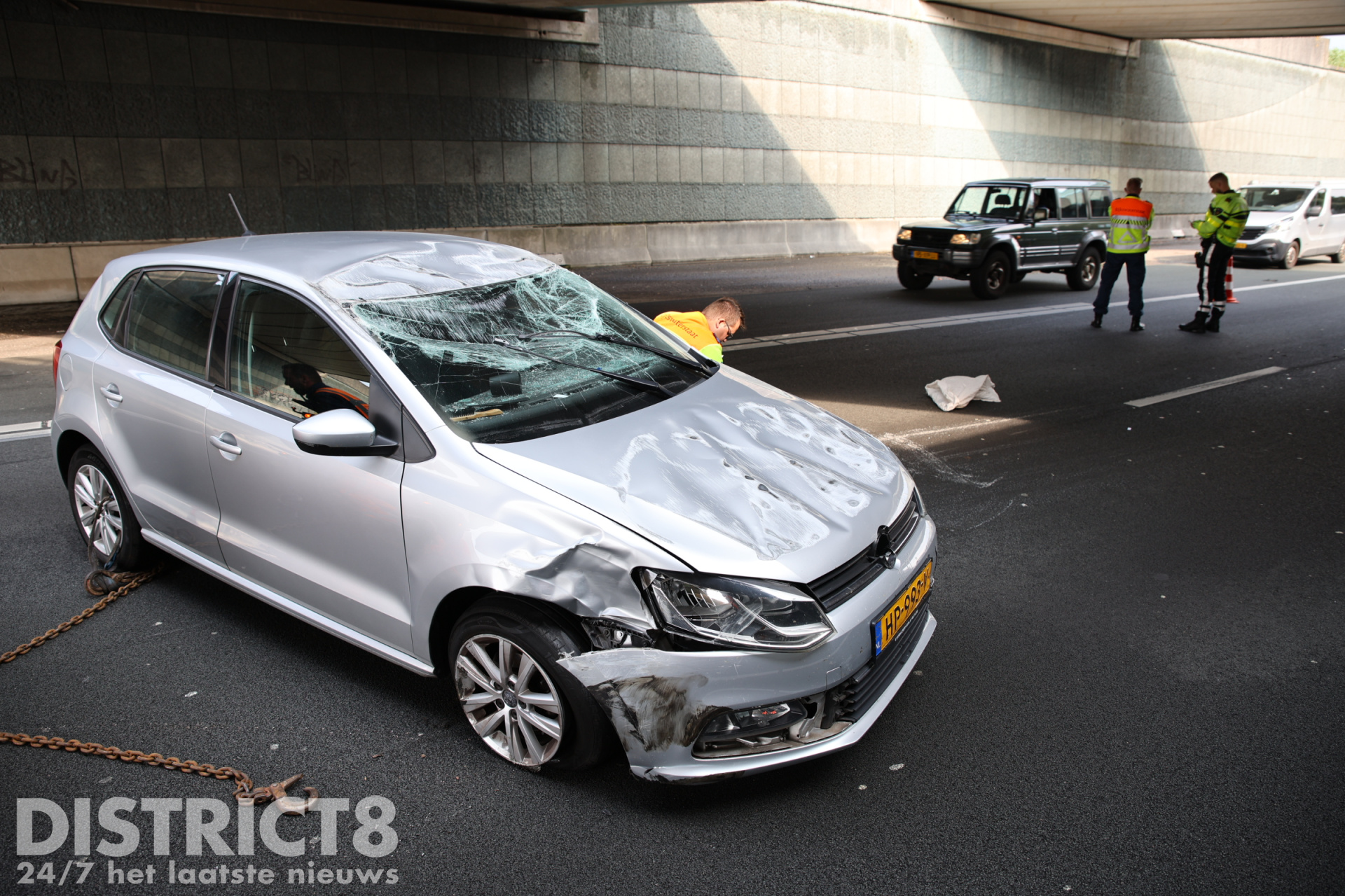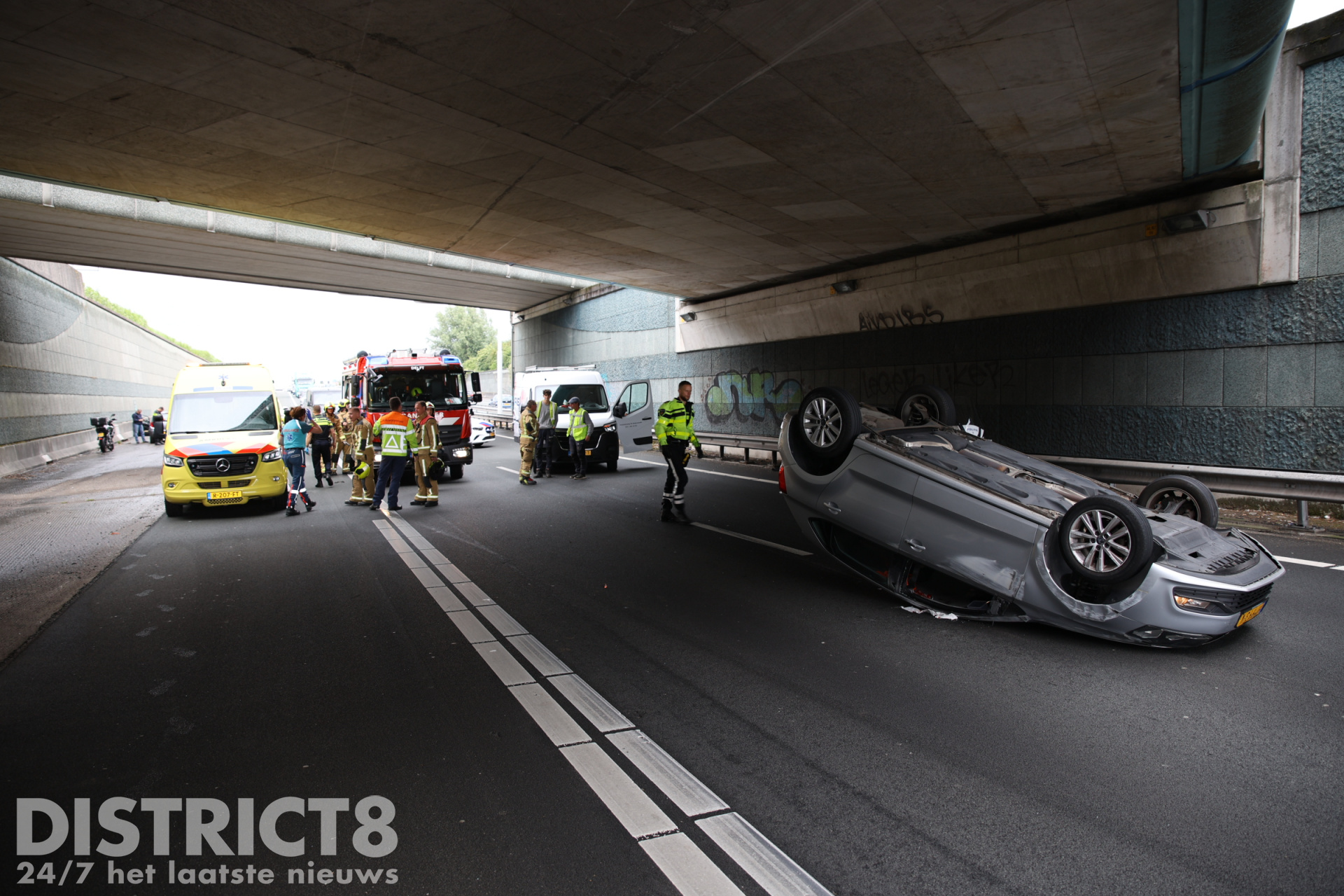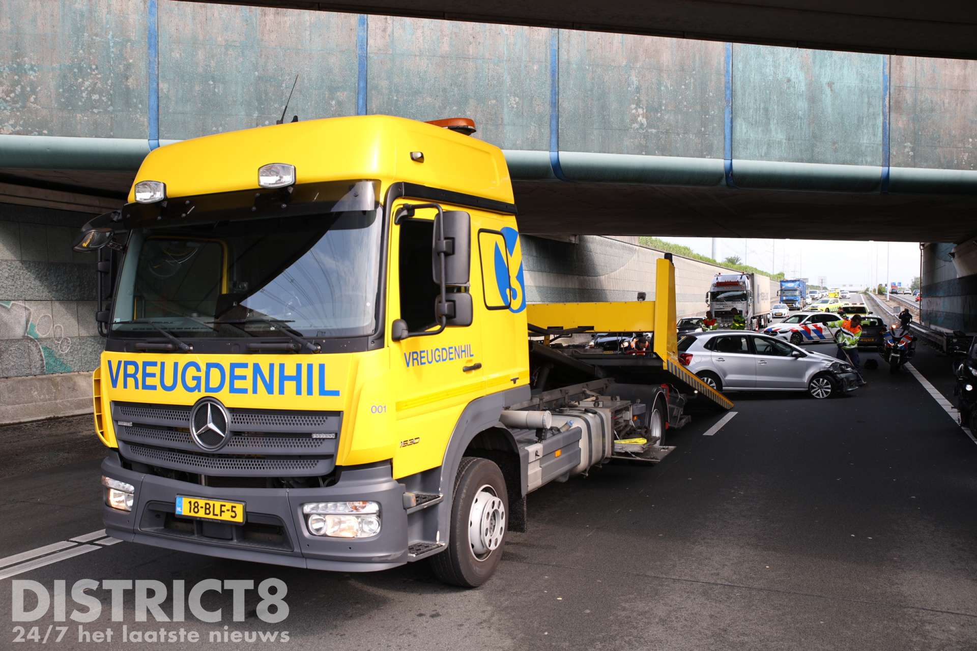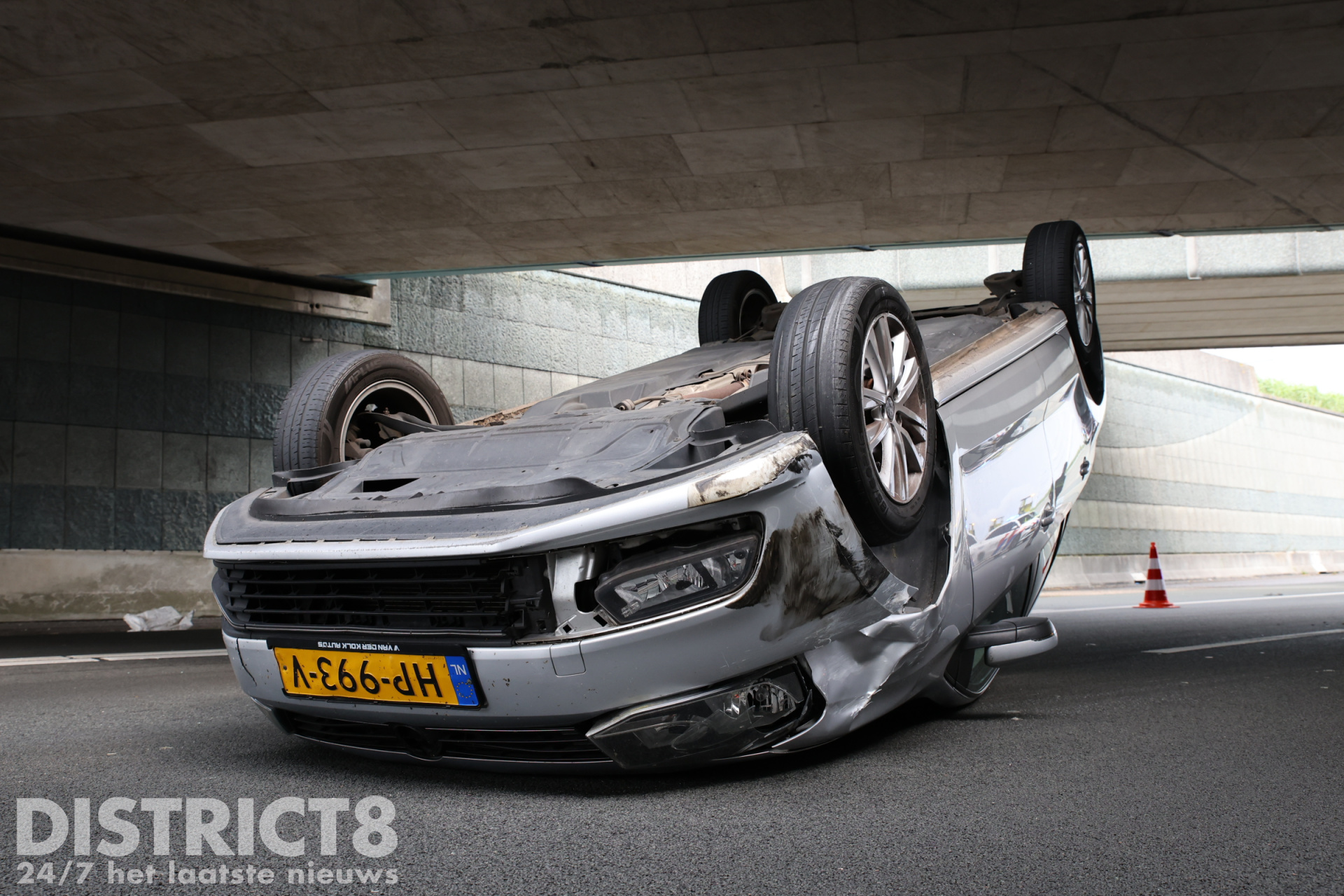 Schipluiden – Op de A4 bij het Gaag-aquaduct is donderdagmiddag 5 juni een auto over de kop geslagen na een aanrijding. De bestuurder moest uitwijken voor een vrachtwagen, waarbij het voertuig aan de achterkant werd geraakt en over de kop sloeg.