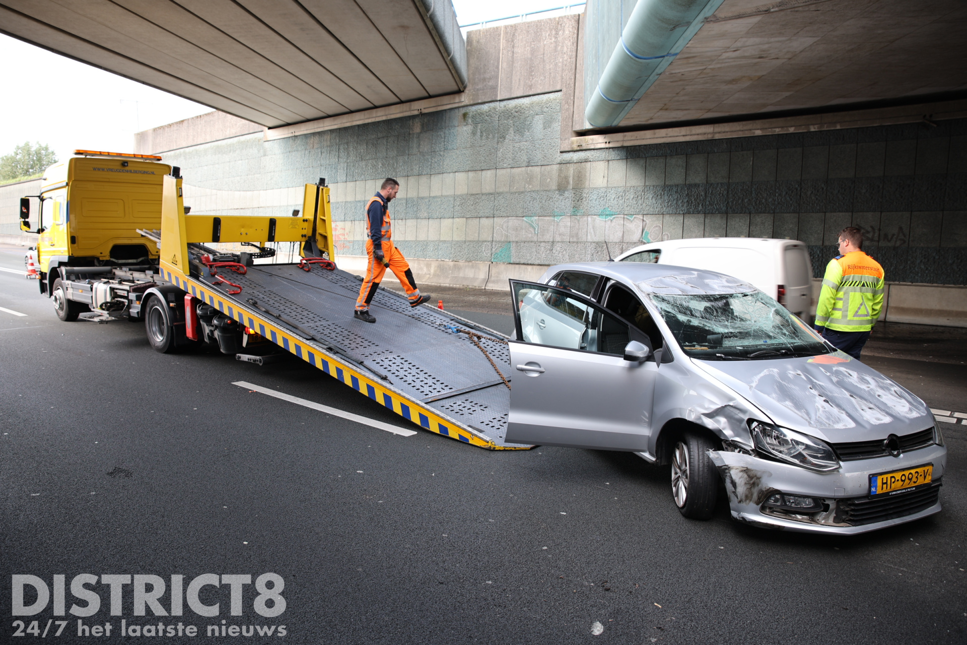 De andere betrokken auto staat verderop op de snelweg met schade. De veroorzaker van het ongeval is na het incident doorgereden.