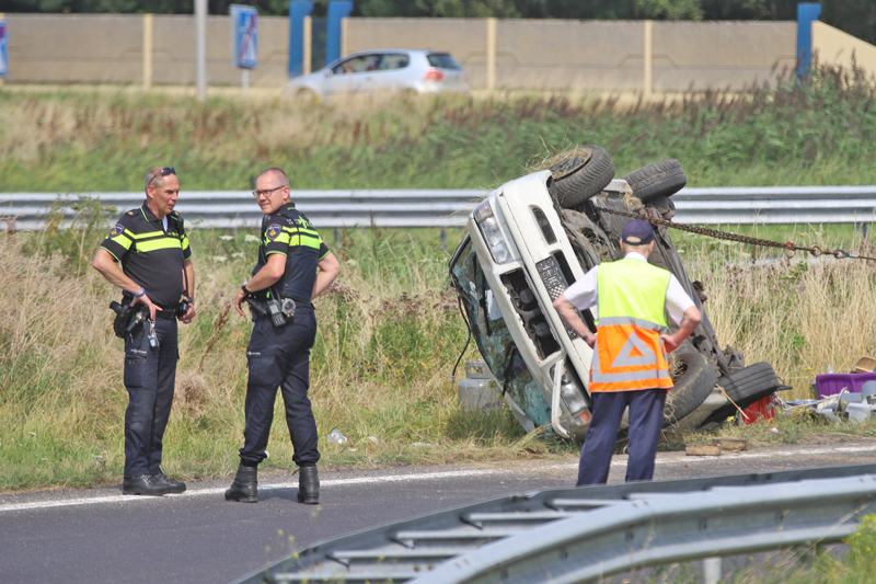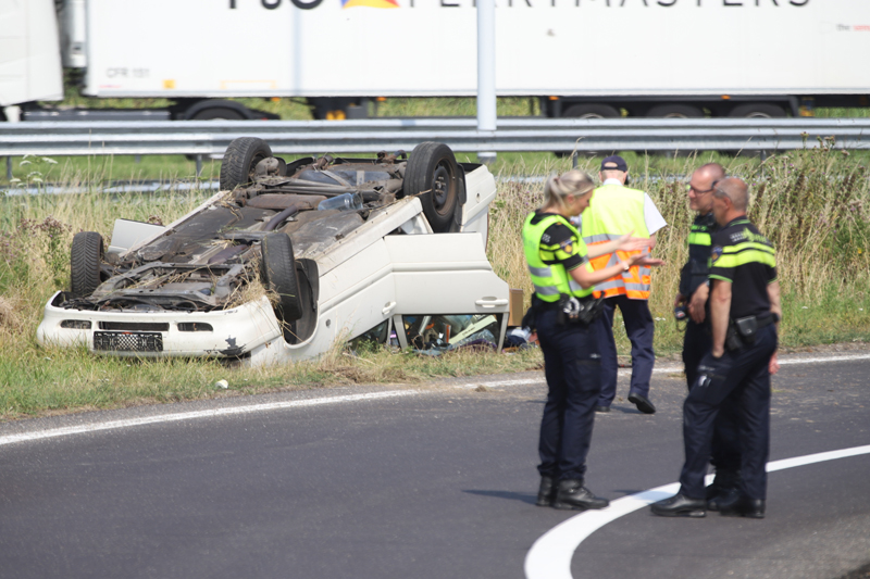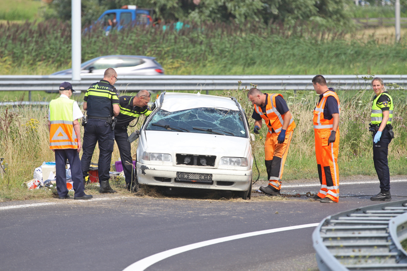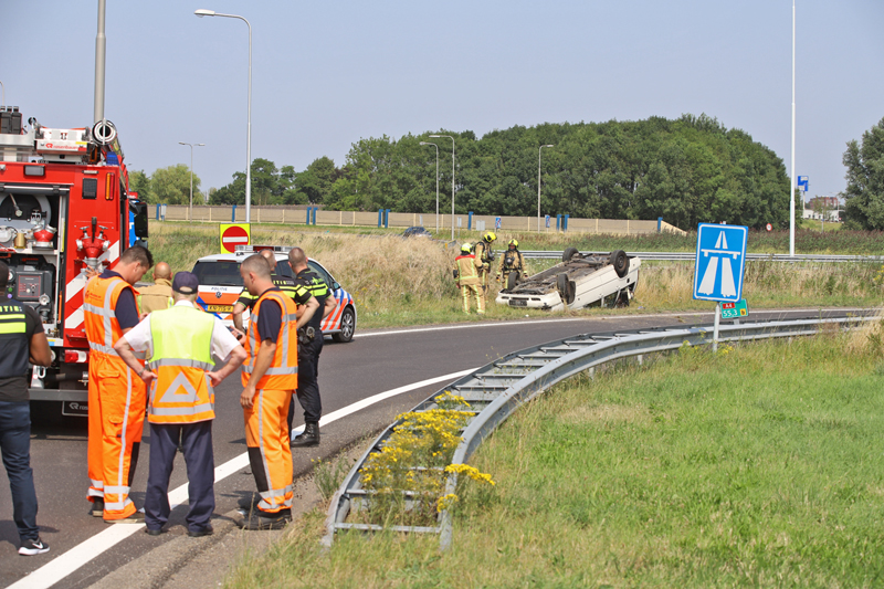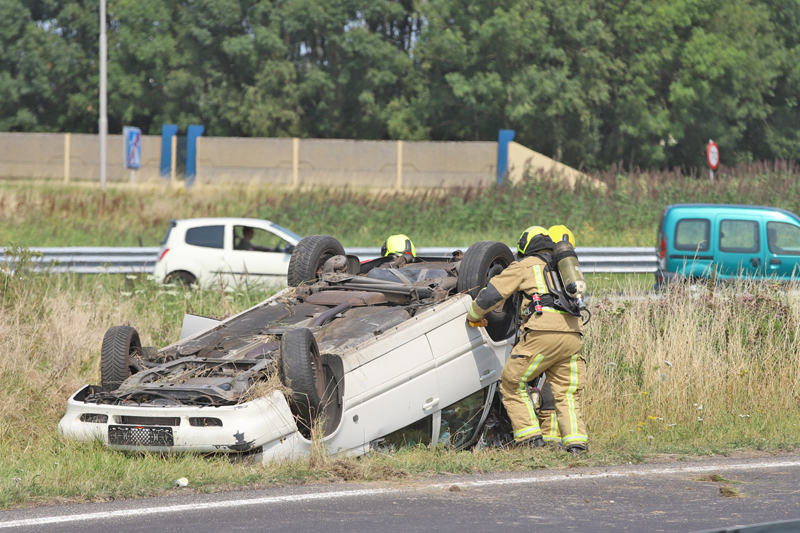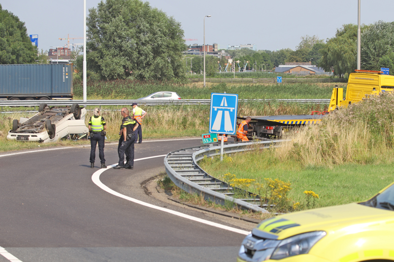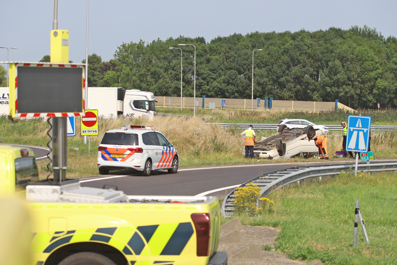 Een man raakte hierbij lichtgewond, de automobilist raakte tijdens het nemen van de oprit de macht over het stuur kwijt en vloog hierna over de kop.