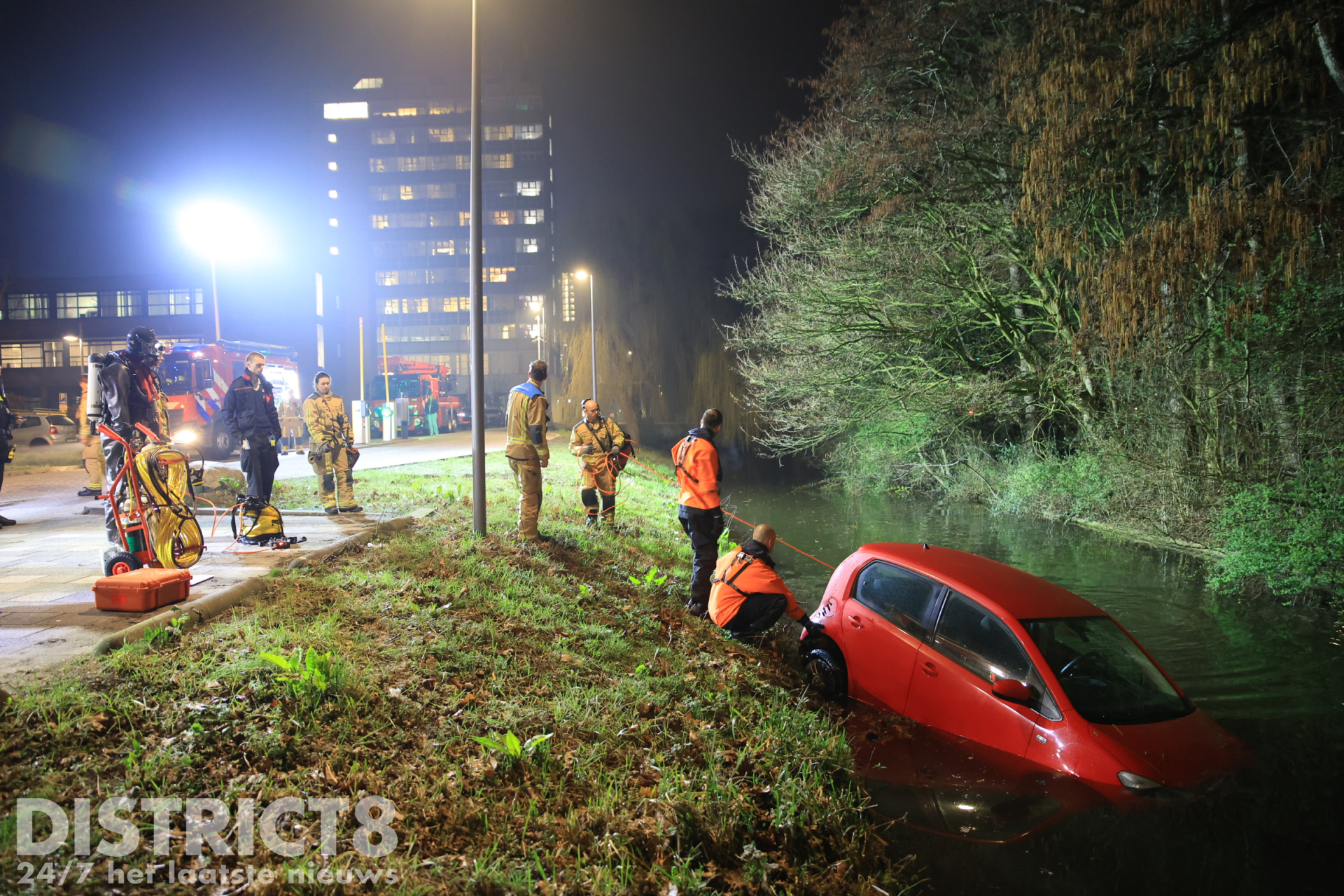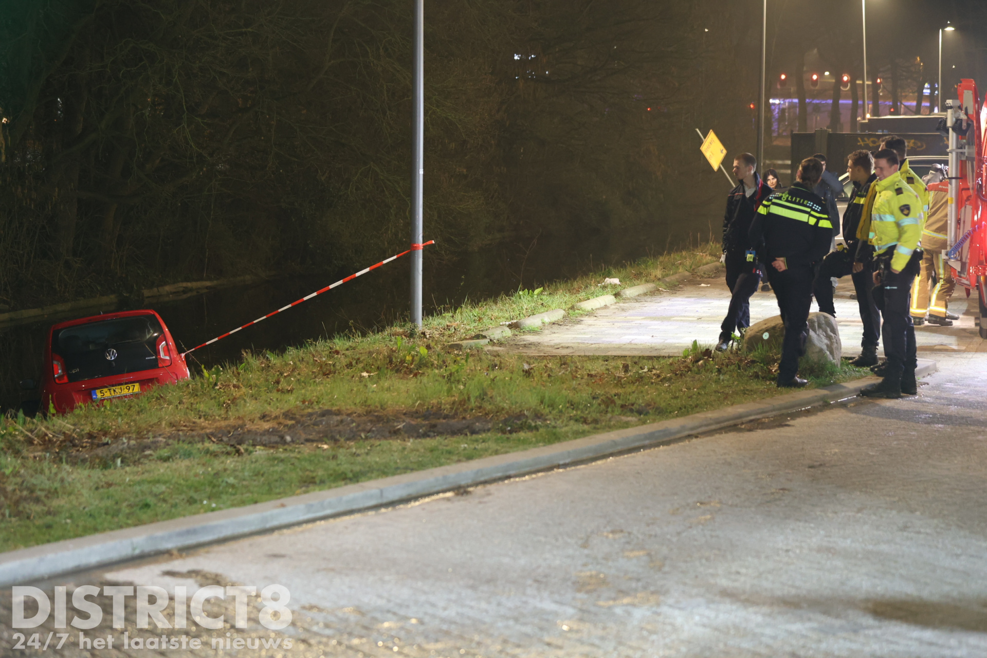 Delft – Op de Van Den Broekweg in Delft, ter hoogte van TU Delft, is zondagavond 8 maart een auto te water geraakt.
