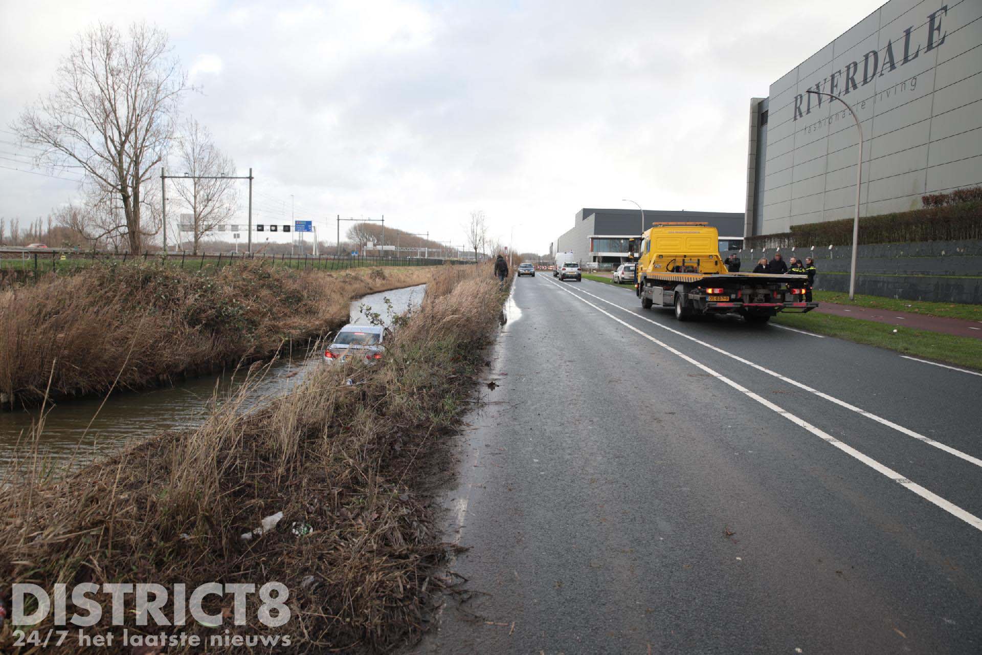 Bergingsbedrijf Vreugdenhil is ter plaatse om de auto uit de sloot te halen.