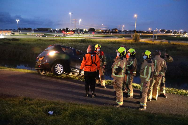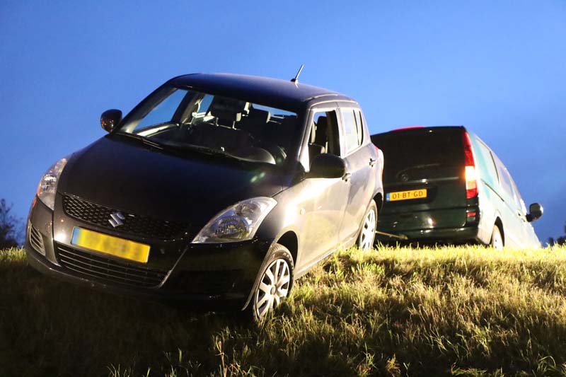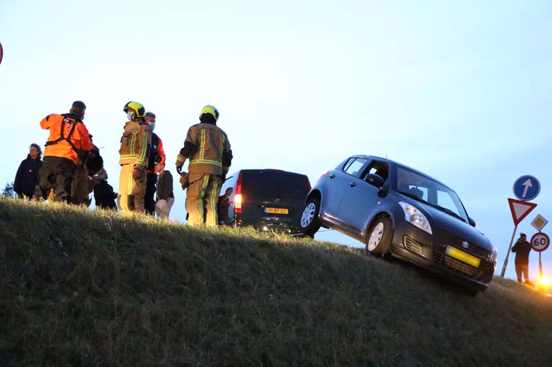 De bestuurder twijfelde geen moment en maakte de auto vast aan de achterzijde van een busje. Hierdoor kon de auto niet verder de dijk af rollen en raakte de auto dus niet te water.