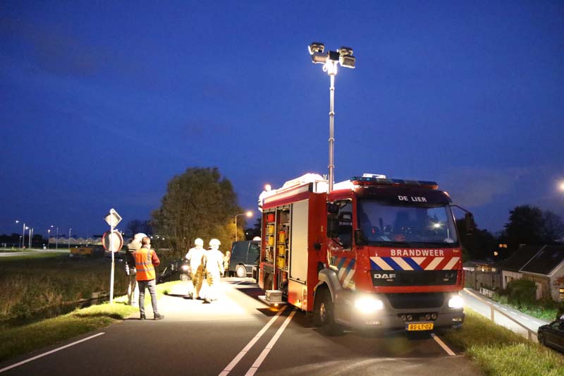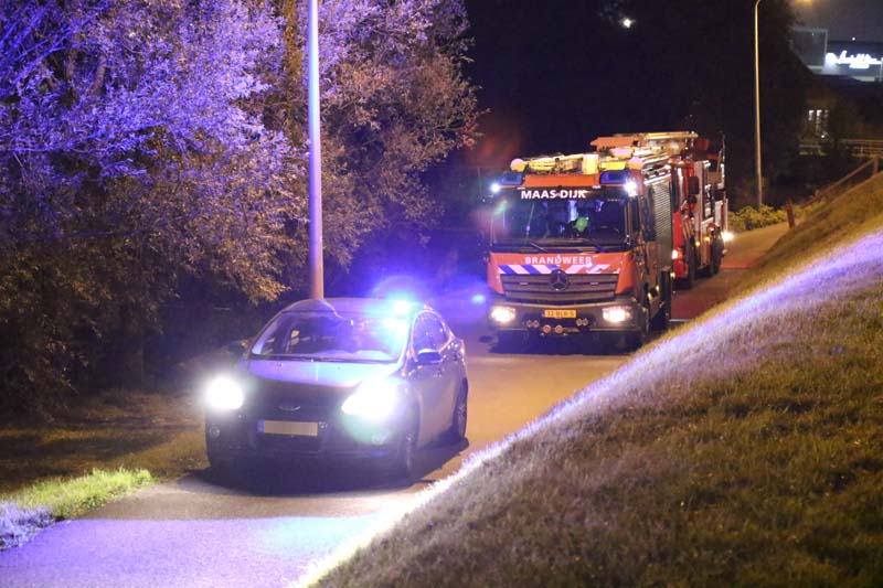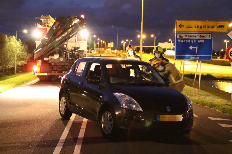 Het voertuig wordt door de brandweer weer terug op de weg gezet. De Maasdijk is in beide richtingen afgesloten voor verkeer.