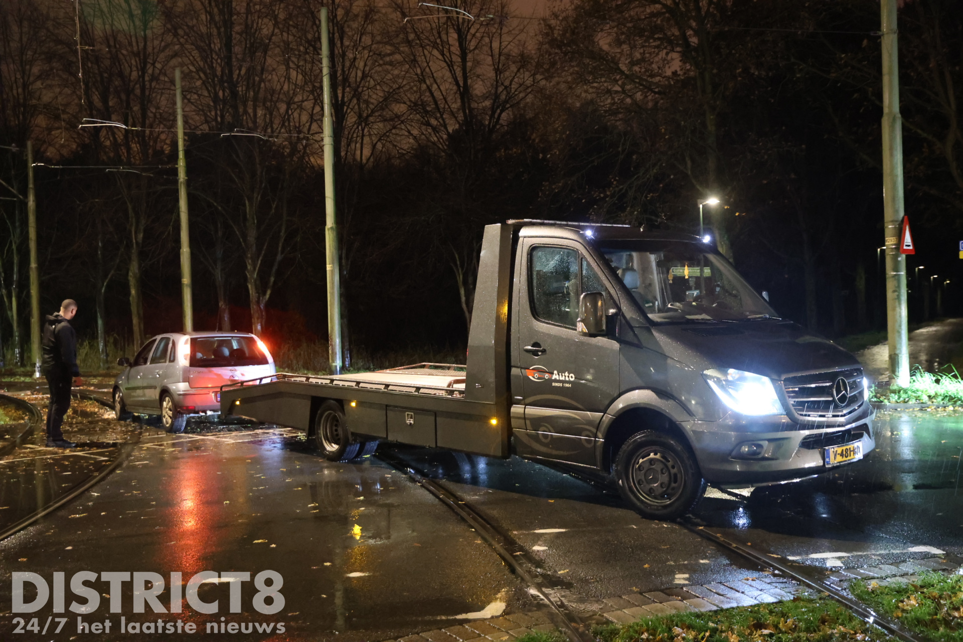 Het tramverkeer was hierdoor enige tijd gestremd, een takelwagen heeft het voertuig weer vrij weten te trekken.
