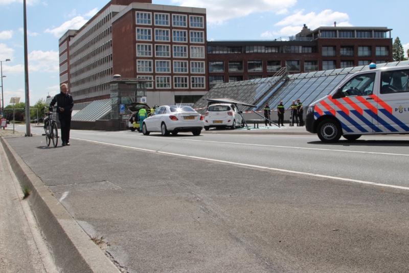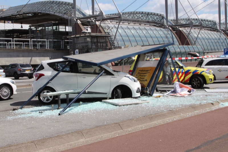 Auto schiet 2x over middenberm en ramt abri Horvathweg Schiedam