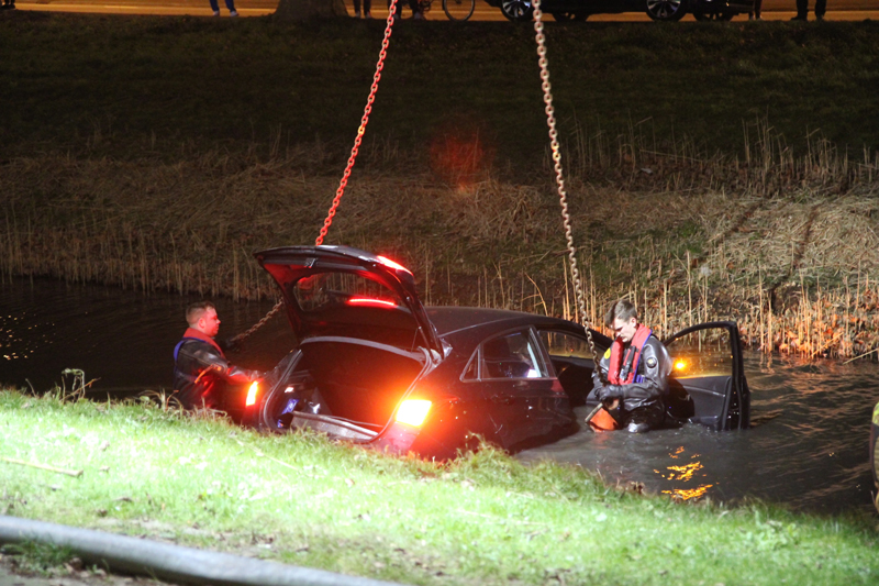 De grote kraan van de brandweer kwam ter plaatse en heeft de auto uit het water getakeld.