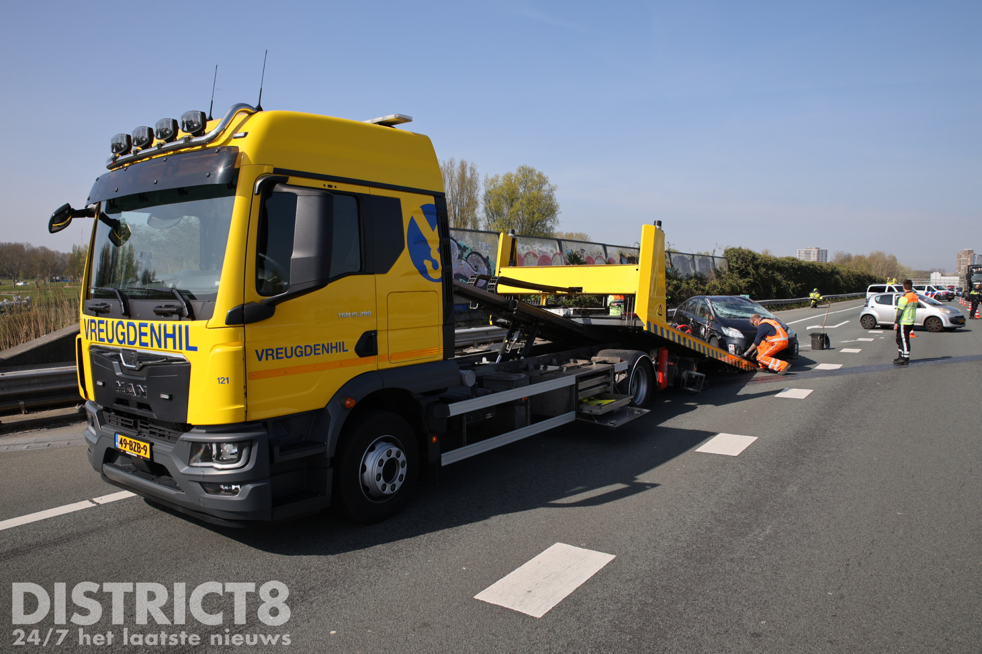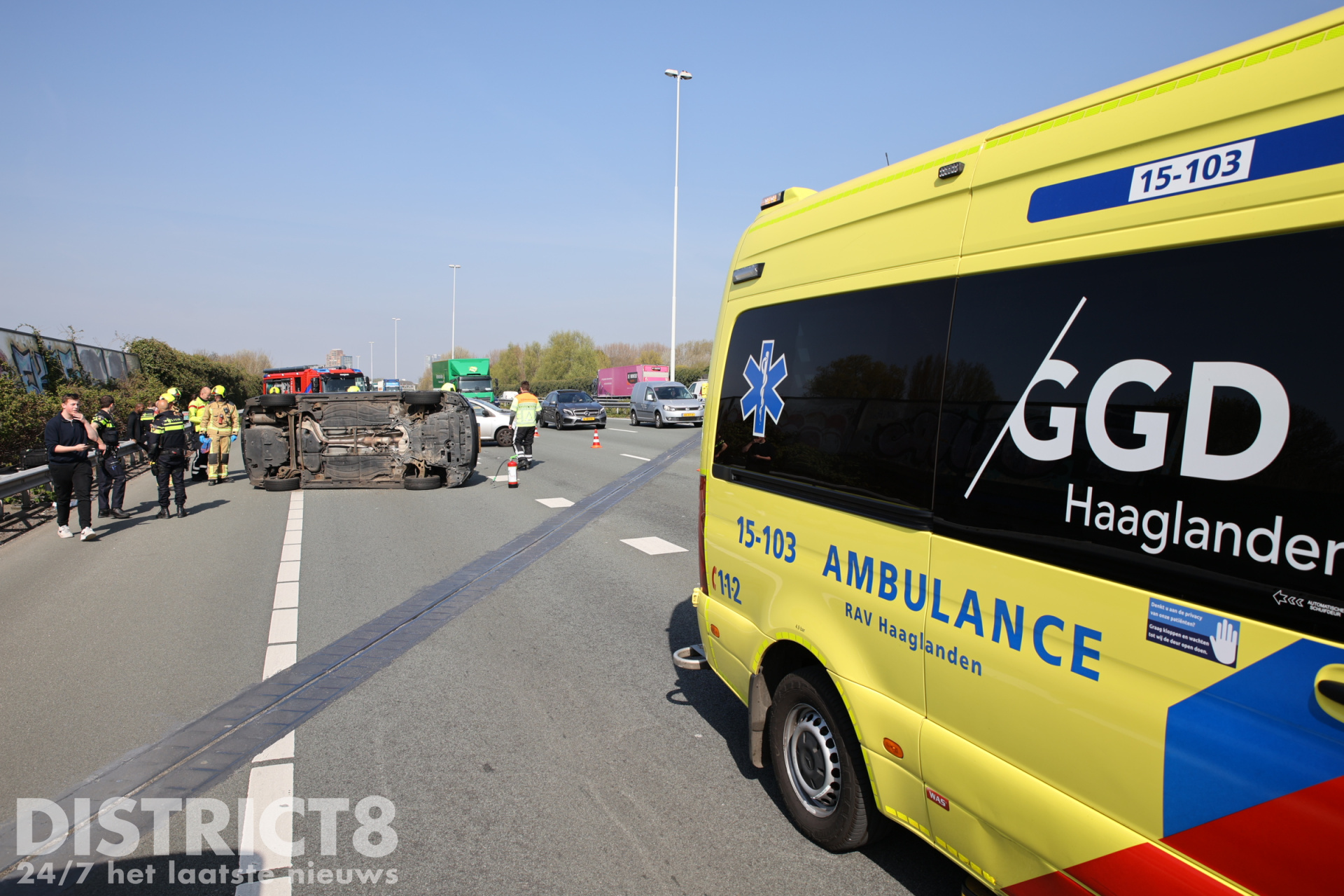 Rond half vier ging het mis tussen de afrit naar de Prinses Beatrixlaan en de afrit Den Haag Zuid. Door nog onbekende oorzaak ontstond er een aanrijding tussen een busje en een auto. De auto sloeg door het ongeval over de kop en kwam op de zijkant tot stilstand.