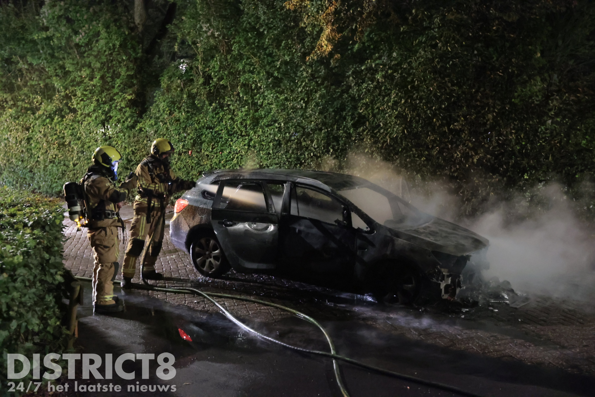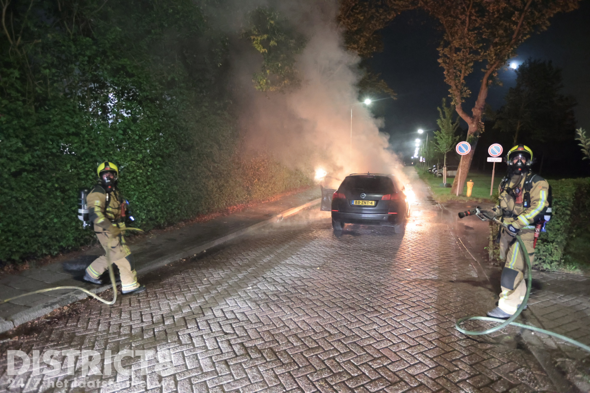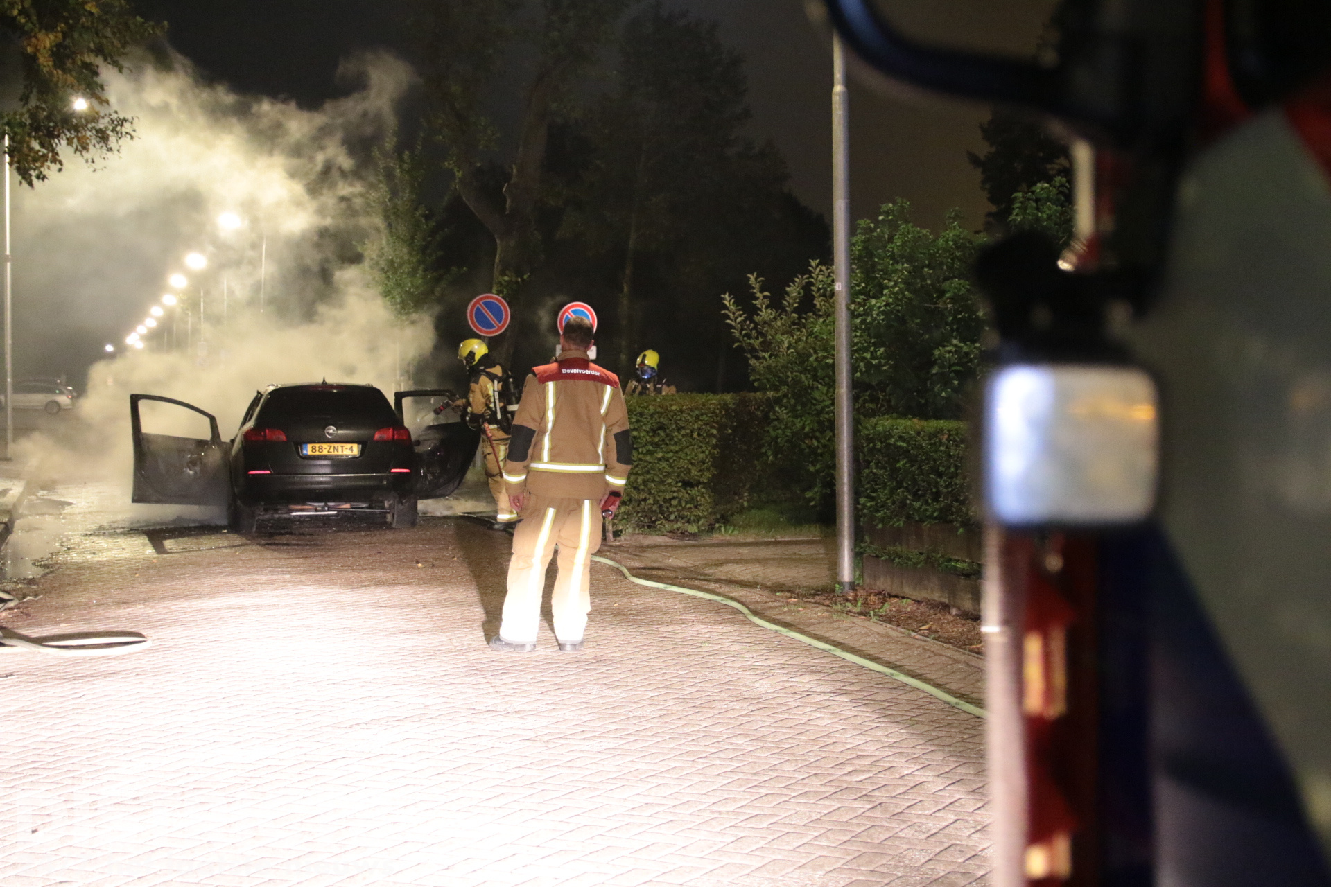 Bij aankomst stond het voertuig aan de voorkant volledig in brand. De brandweerlieden blusten de brand vakkundig met twee hogedrukstralen. De straat werd tijdelijk afgezet met politielint.