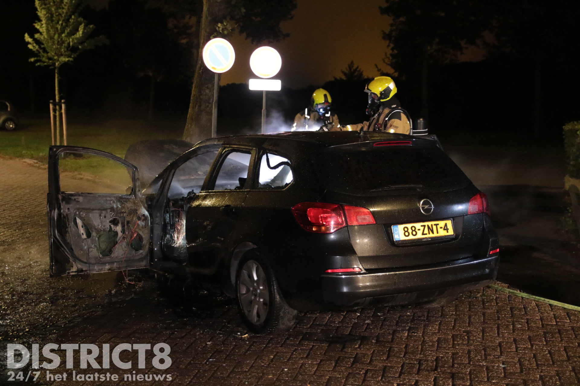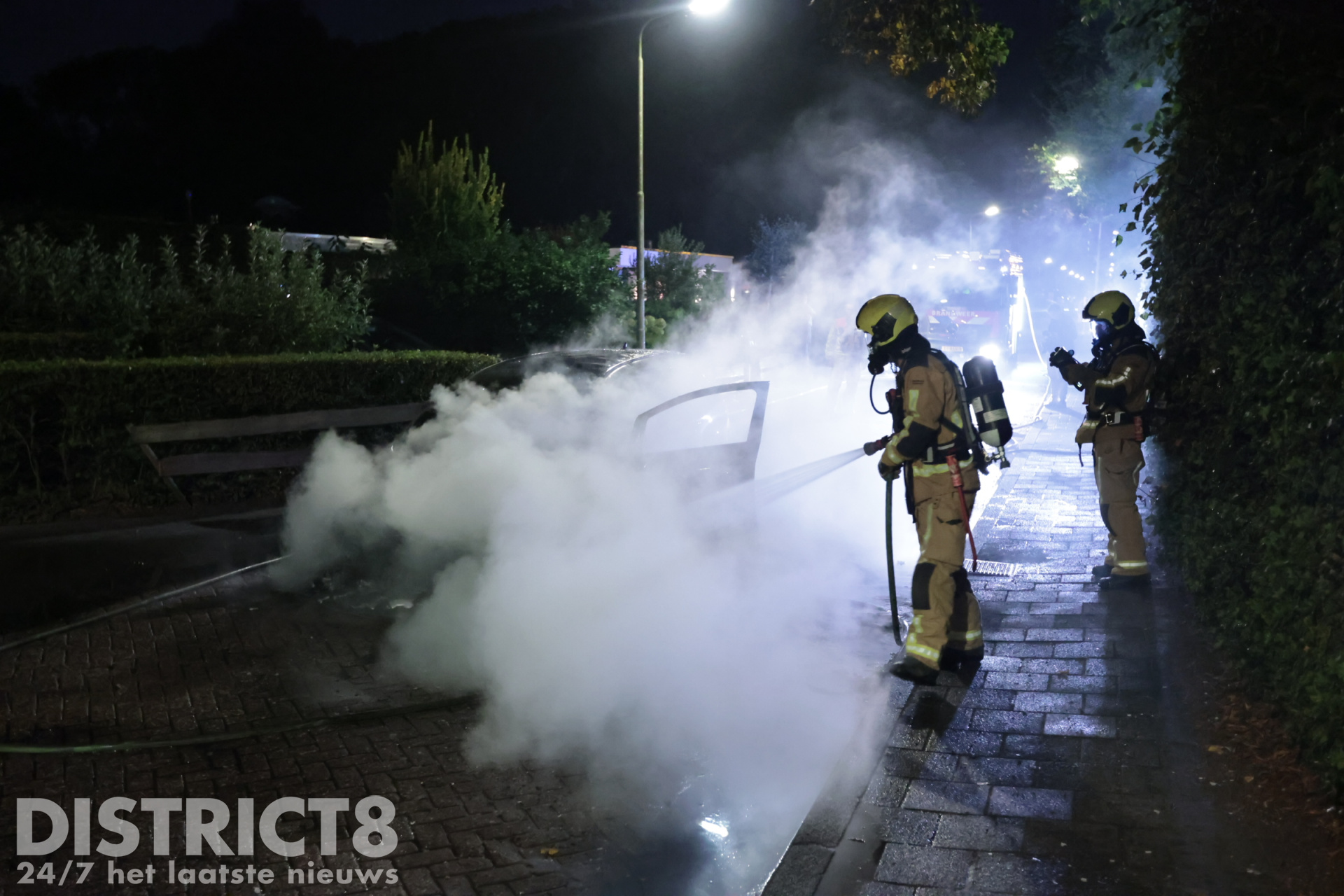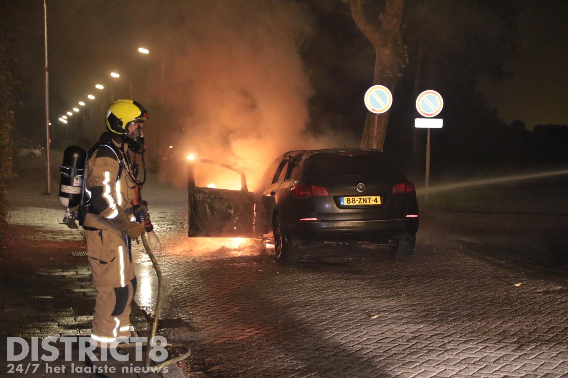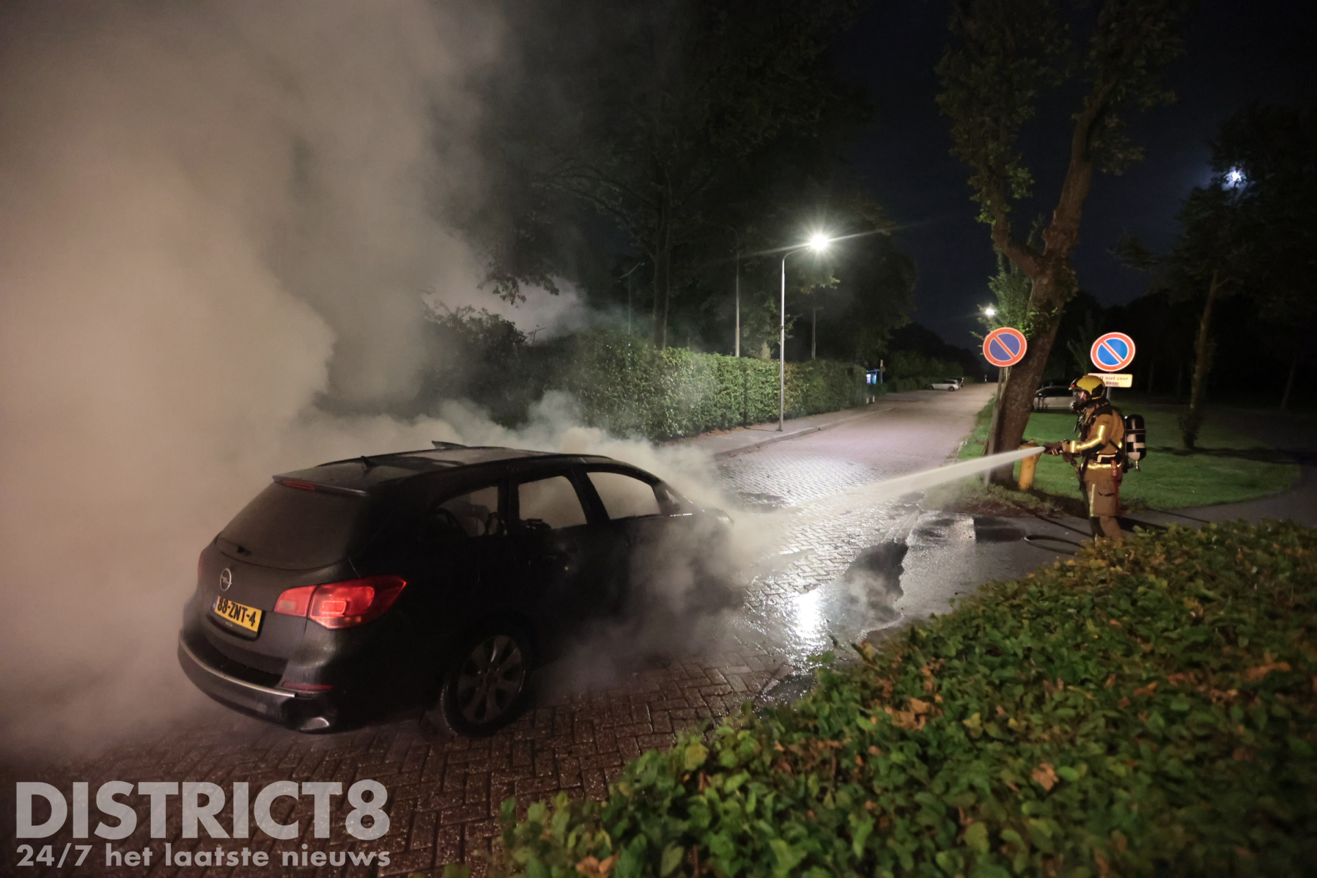 Bij aankomst stond het voertuig aan de voorkant volledig in brand. De brandweerlieden blusten de brand vakkundig met twee hogedrukstralen. De straat werd tijdelijk afgezet met politielint.
