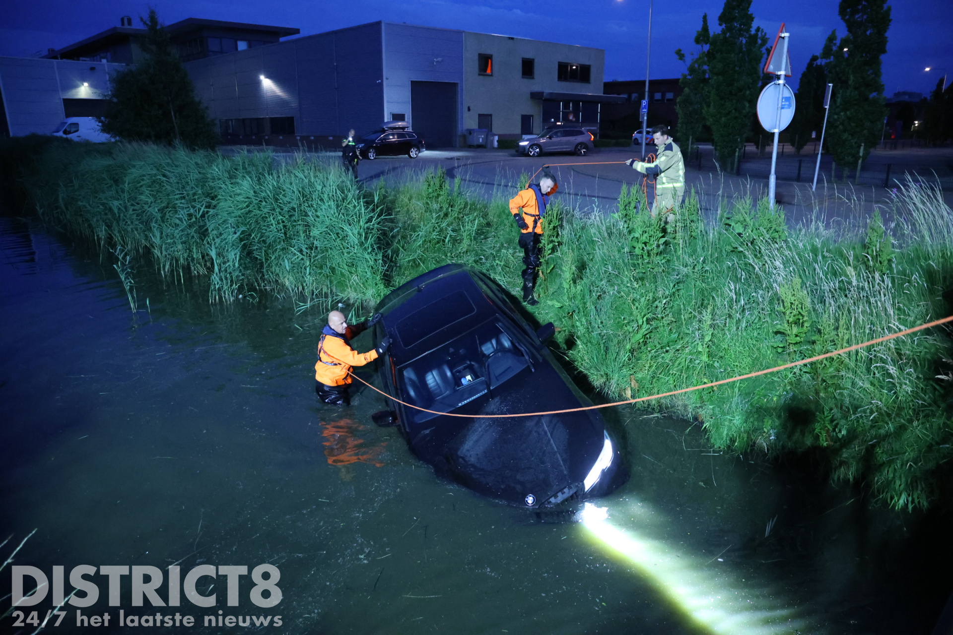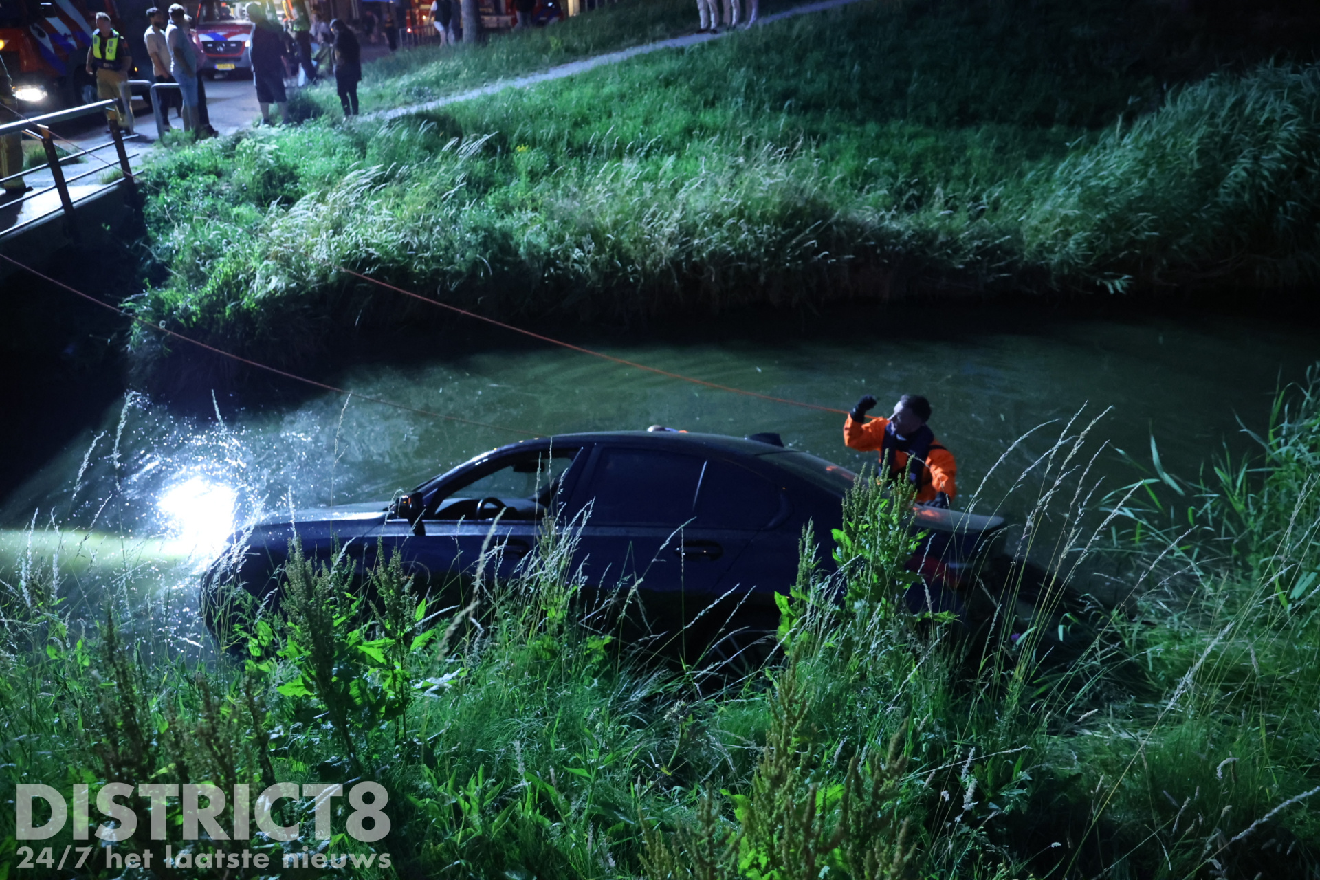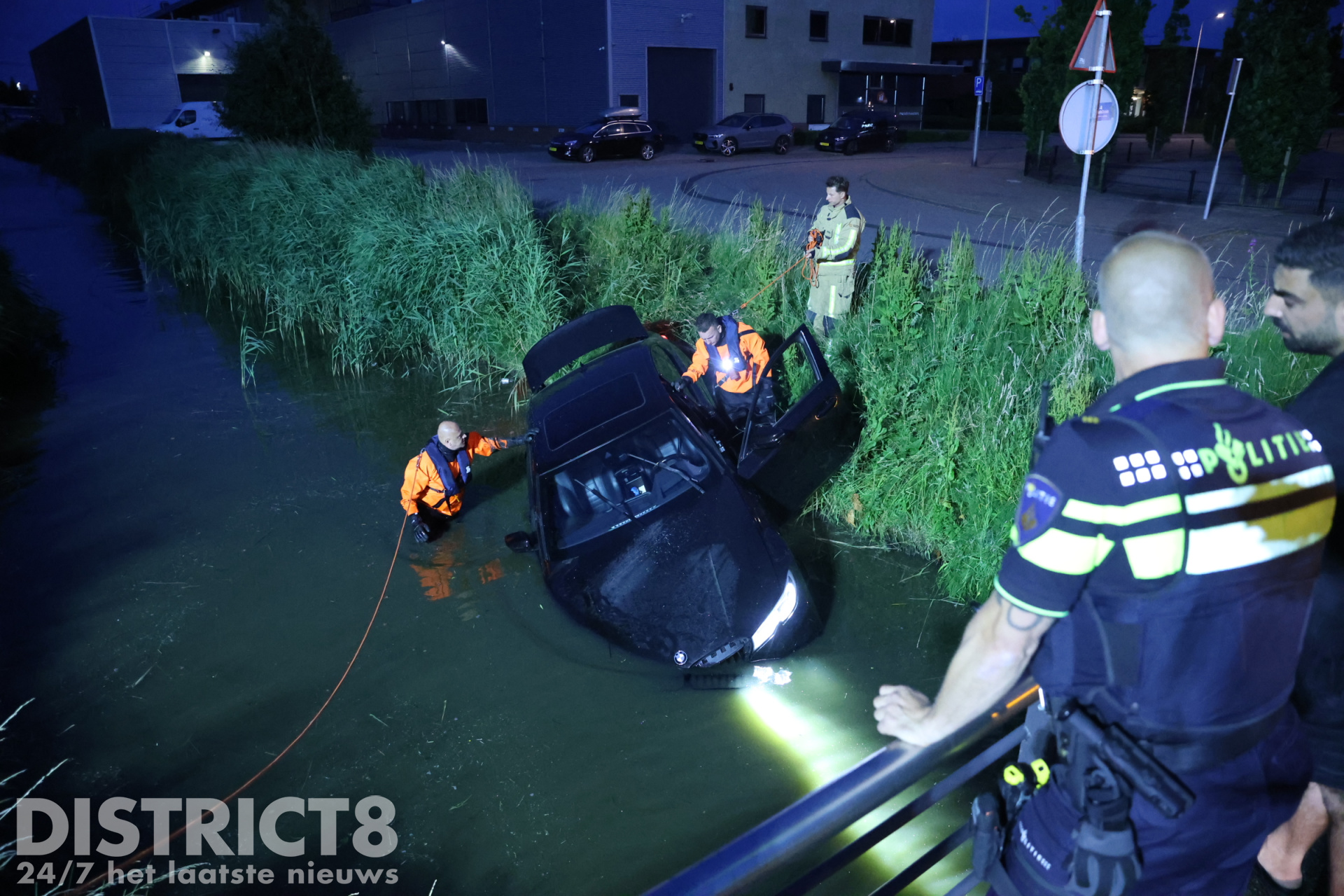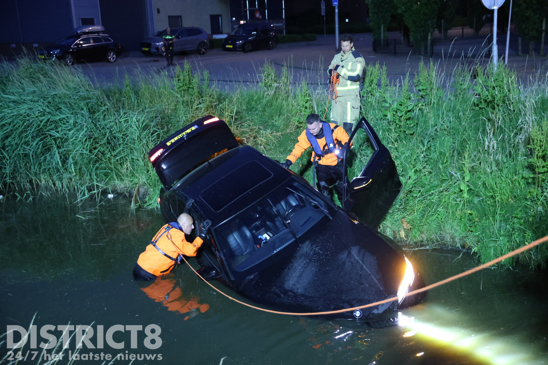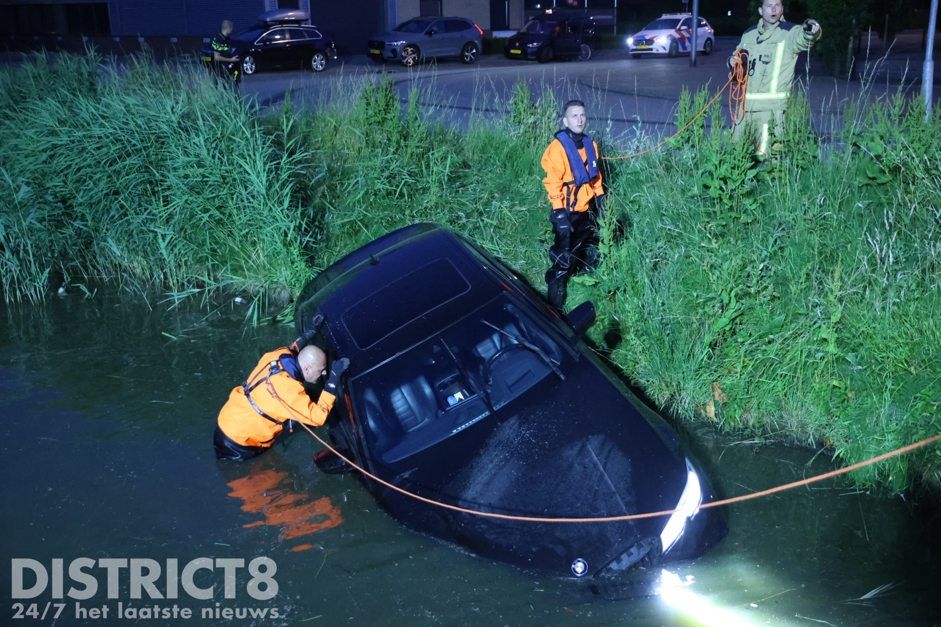De automobilist belde enkele vrienden van hem. Zo ook de eigenaar van een Dodge Ram waarmee een poging werd gedaan om de auto op het drogen te krijgen. Onder het toeziend oog van meerdere jongeren en buurtbewoners werd twee keer geprobeerd om de auto uit het water te slepen. Nadat voor de tweede keer het spanbandje brak, gaven de vrienden van de automobilist het op.