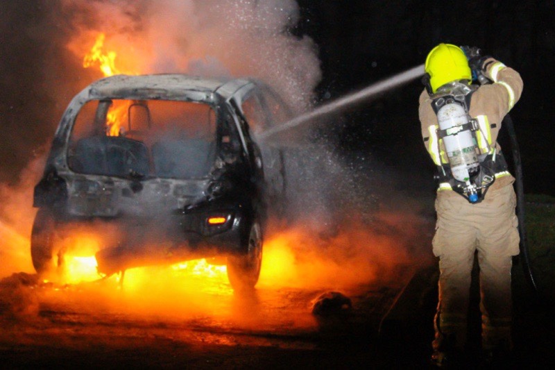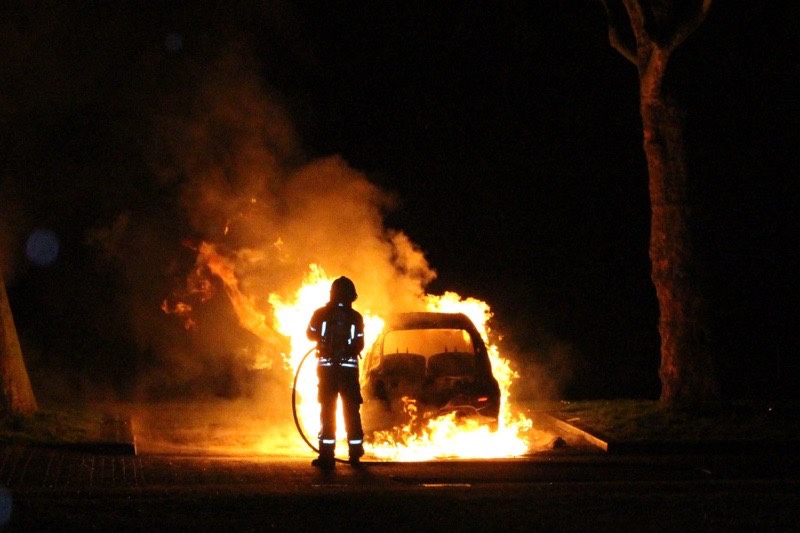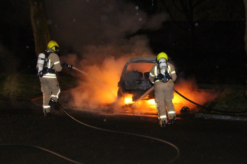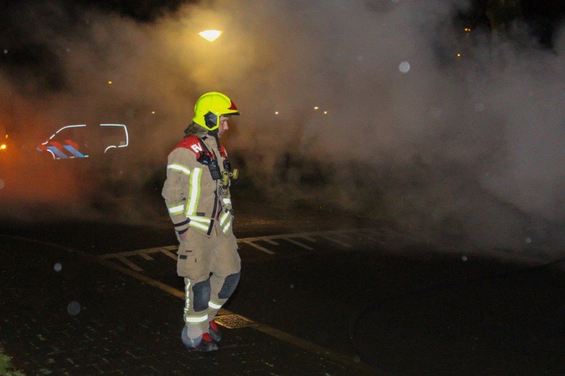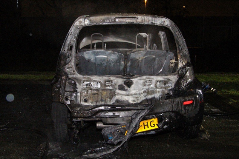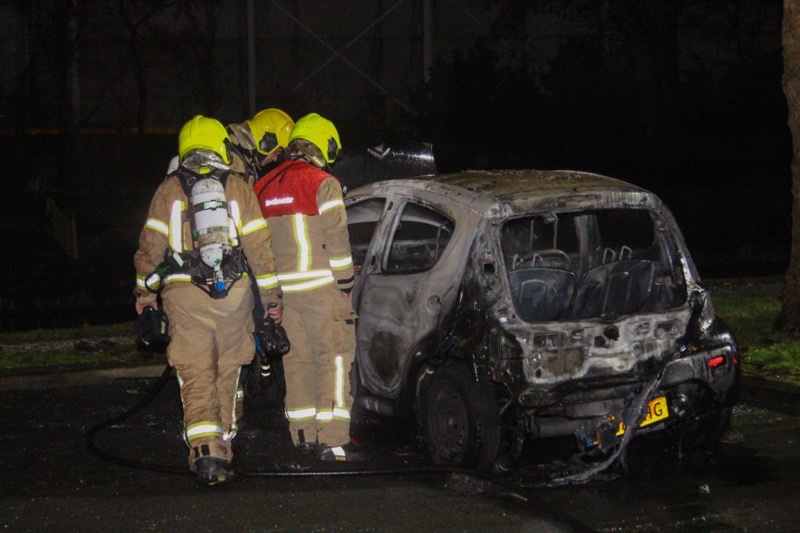Toen de brandweer aankwam stond de auto al volledig in brand. Deze is dan ook compleet verwoest. Tijdens het blussen begon de auto uit zichzelf te toeteren.