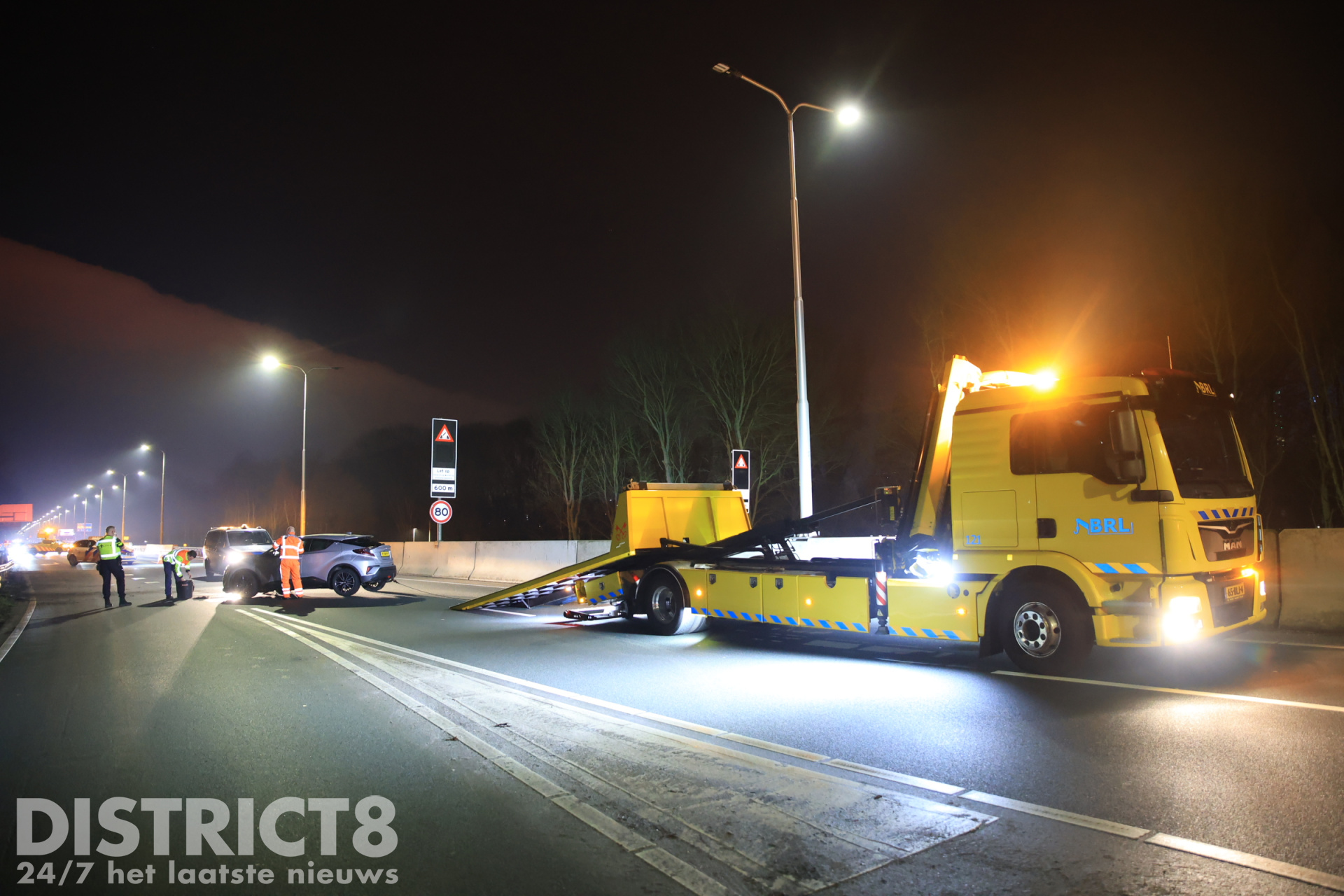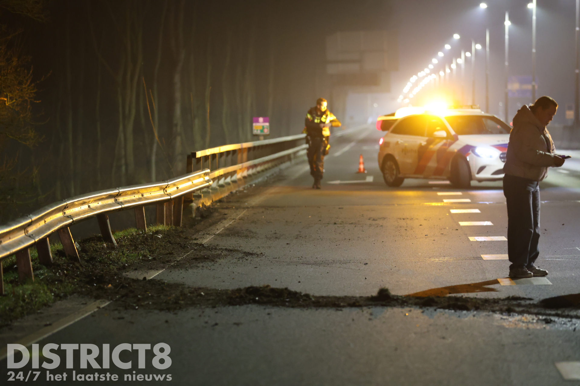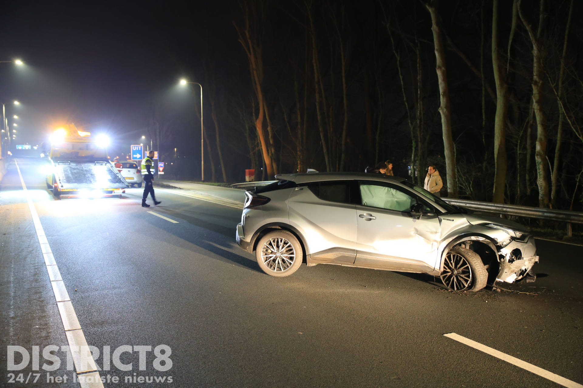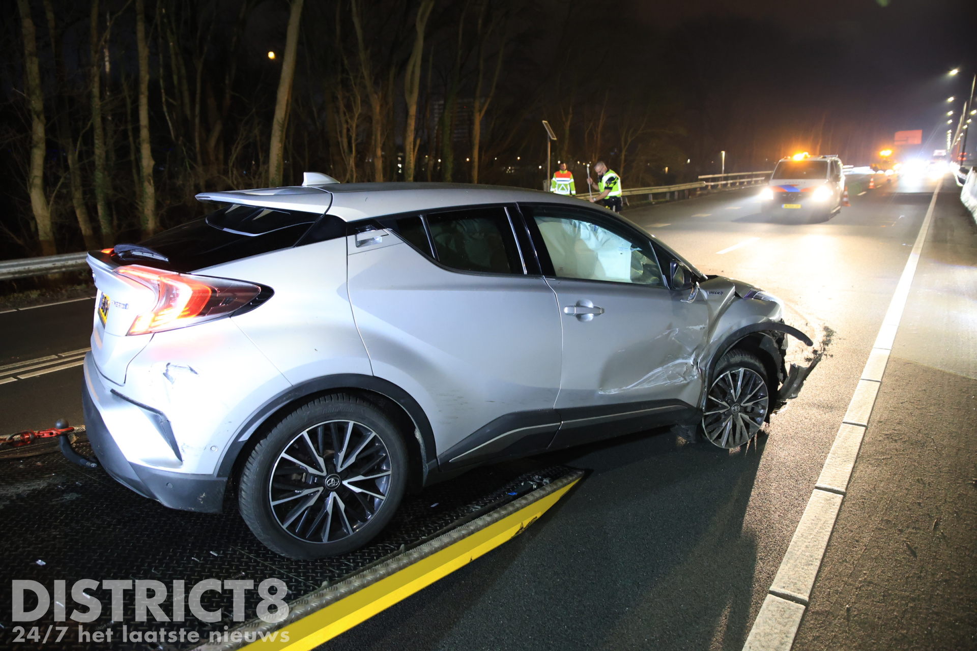 Een bergingsbedrijf is ter plaatse gekomen om de auto af te voeren. De provincie is ter plaatse voor de schade aan de vangrail.