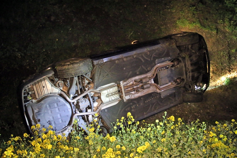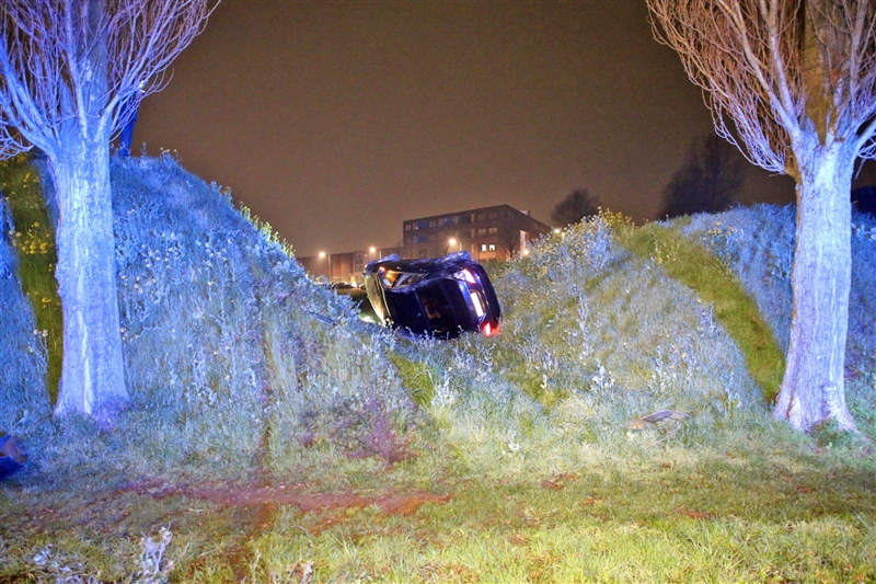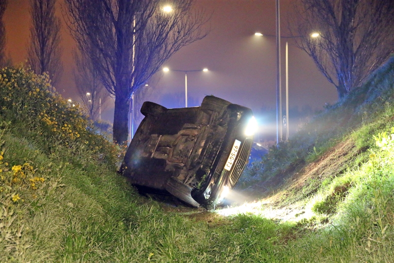 Na een dollemansrit over de Zoetermeerse Rijweg verloor de automobilist de macht over het stuur en vloog hij met zijn auto over een rotonde heen. Na de rotonde knalde hij tegen een lantaarnpaal aan en reed hij een heuvel op. De auto kantelde, vloog over de kop en kwam op de zijkant tot stilstand.