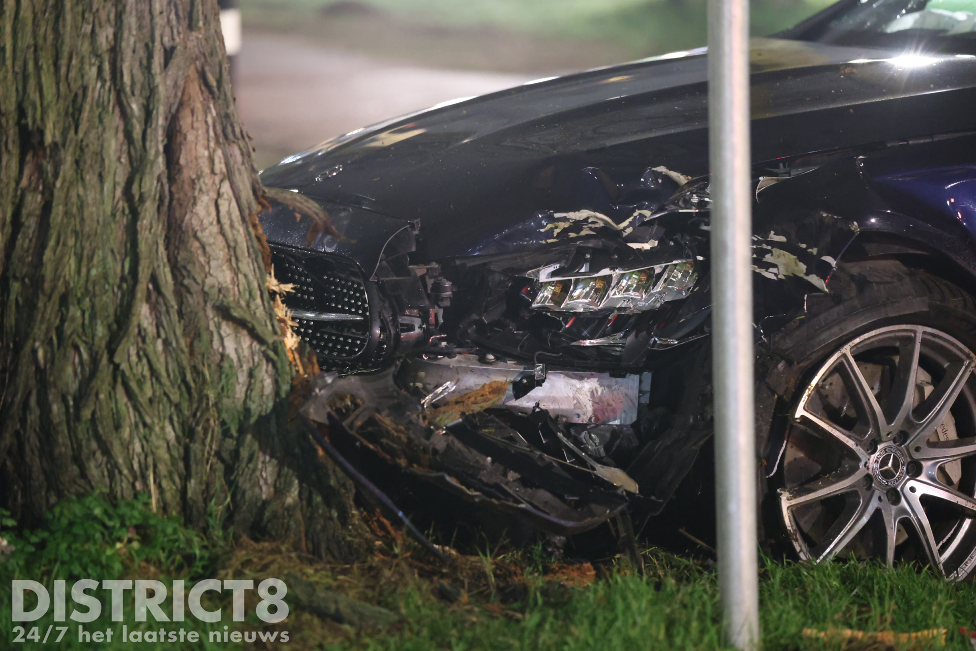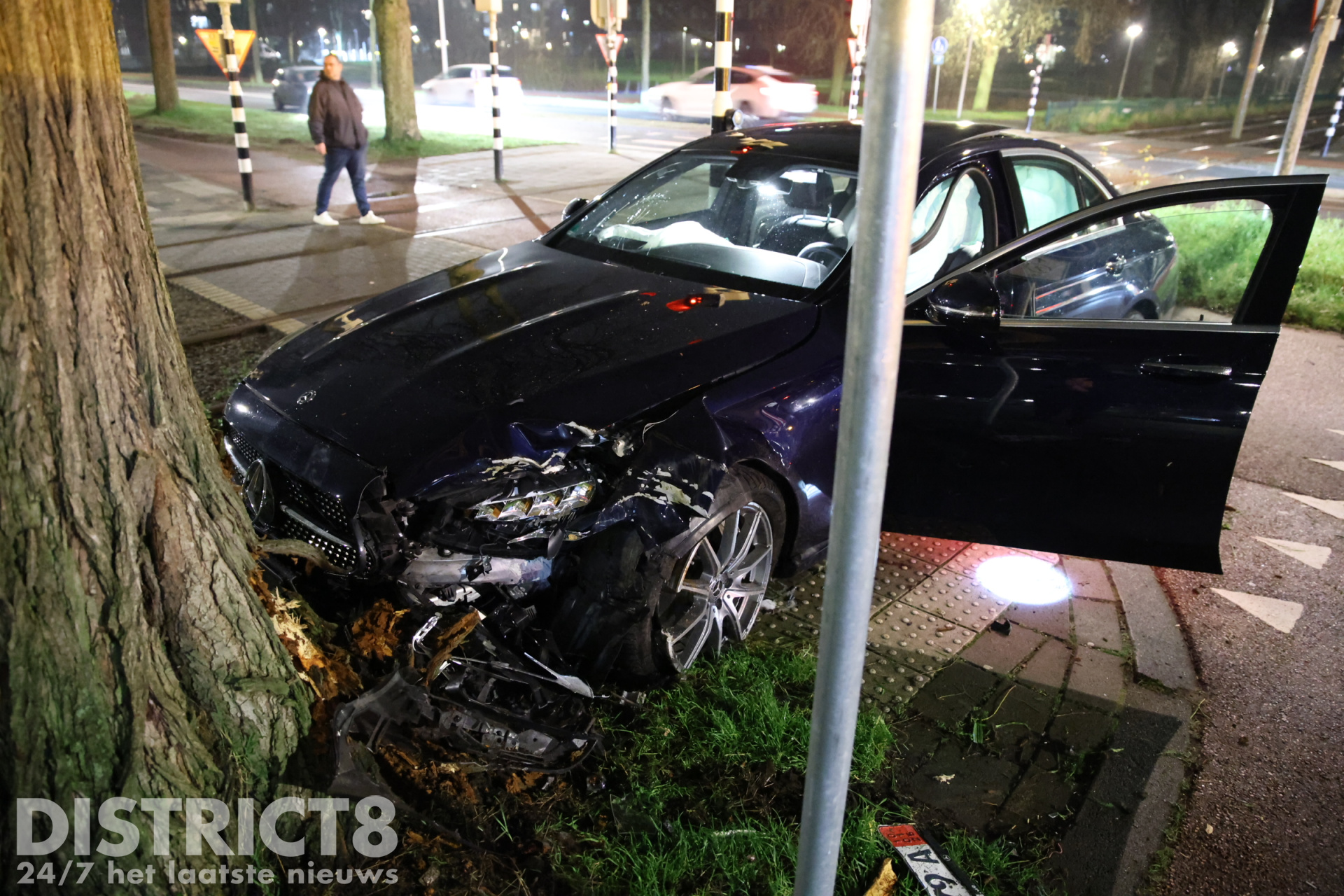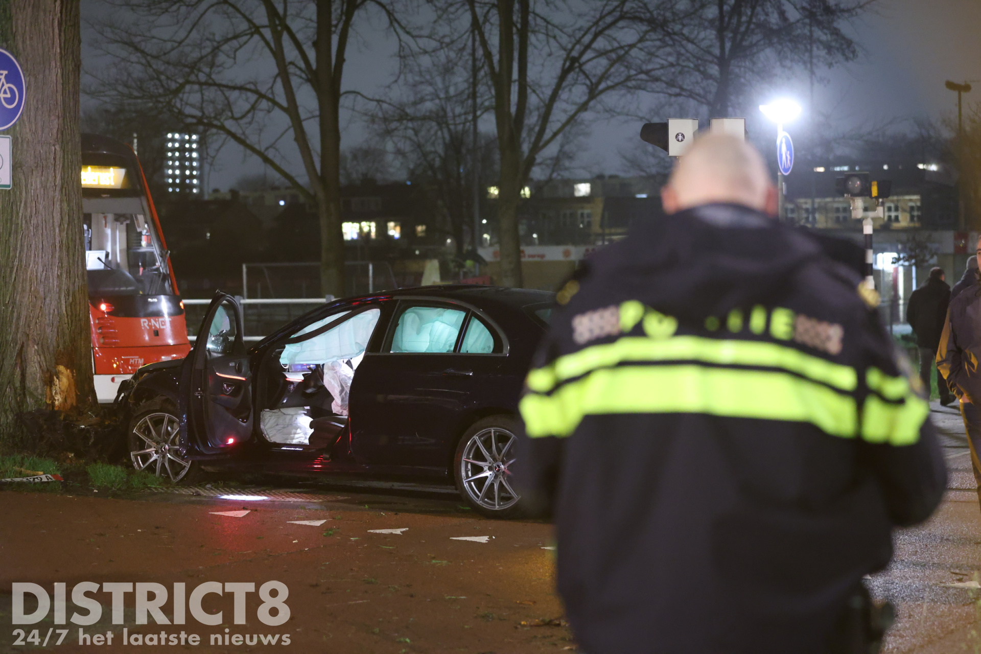 Een automobilist verloor de macht over het stuur, ramde een paaltje en kwam tegen een boom naast de tramrails tot stilstand.