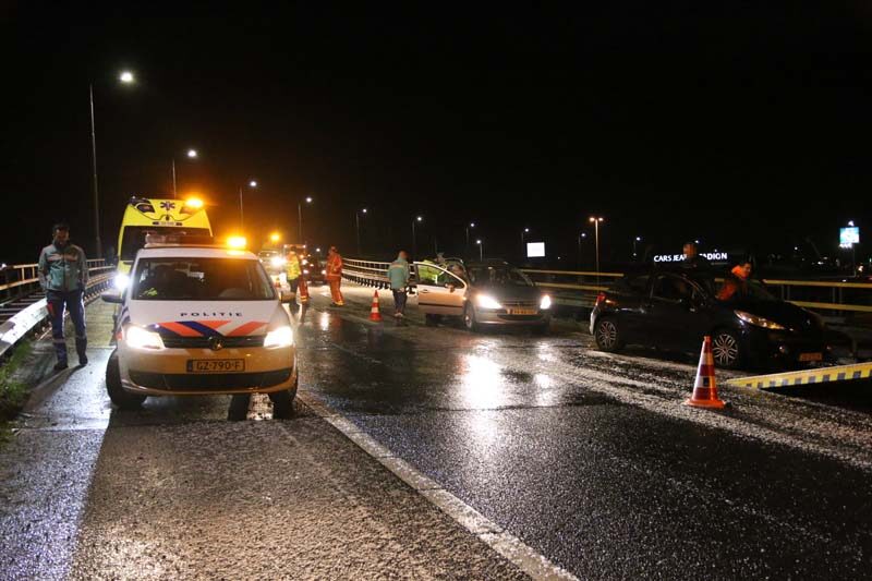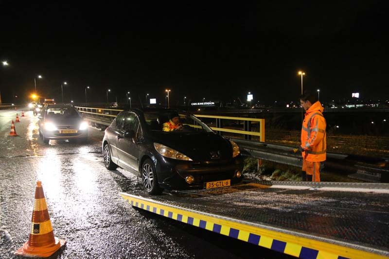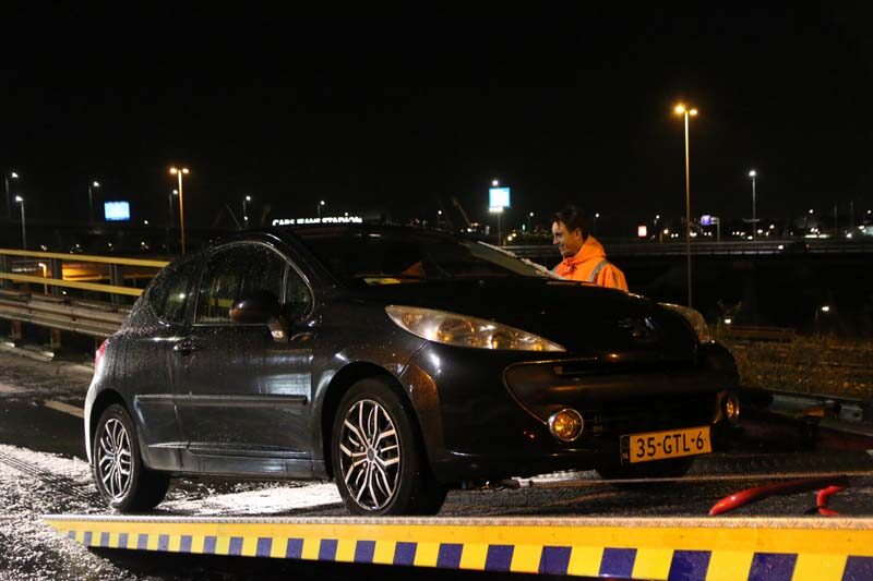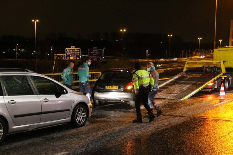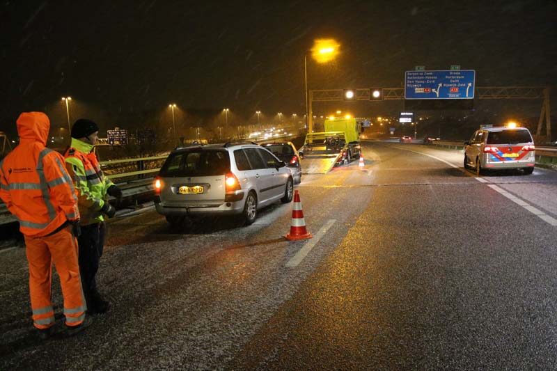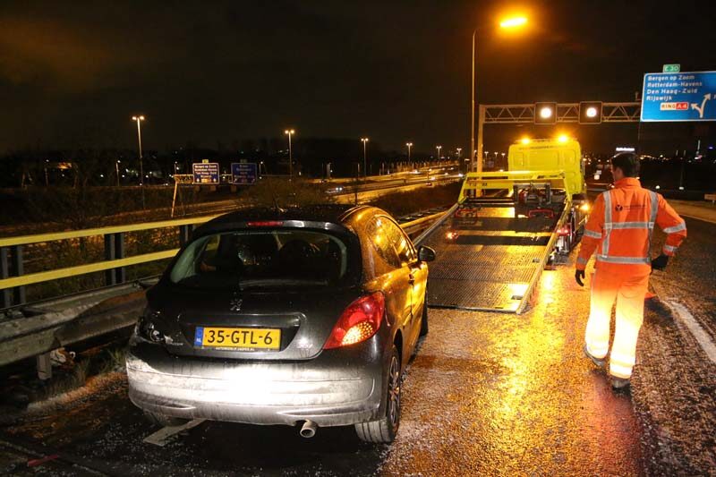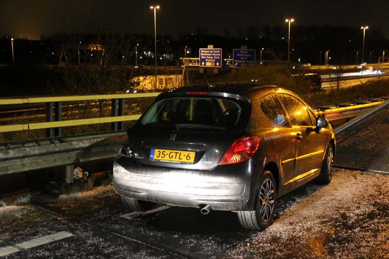Op de rijbaan richting Rijswijk vanaf Zoetermeer gleed de automobilist door de hagel en het natte wegdek uit de bocht. De auto kwam tot stilstand tegen de geleiderail en raakte beschadigd.
