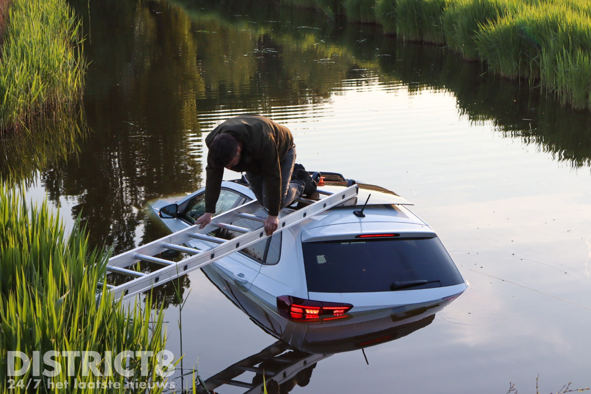 Een berger komt ter plaatse om de auto uit het water te takelen.
