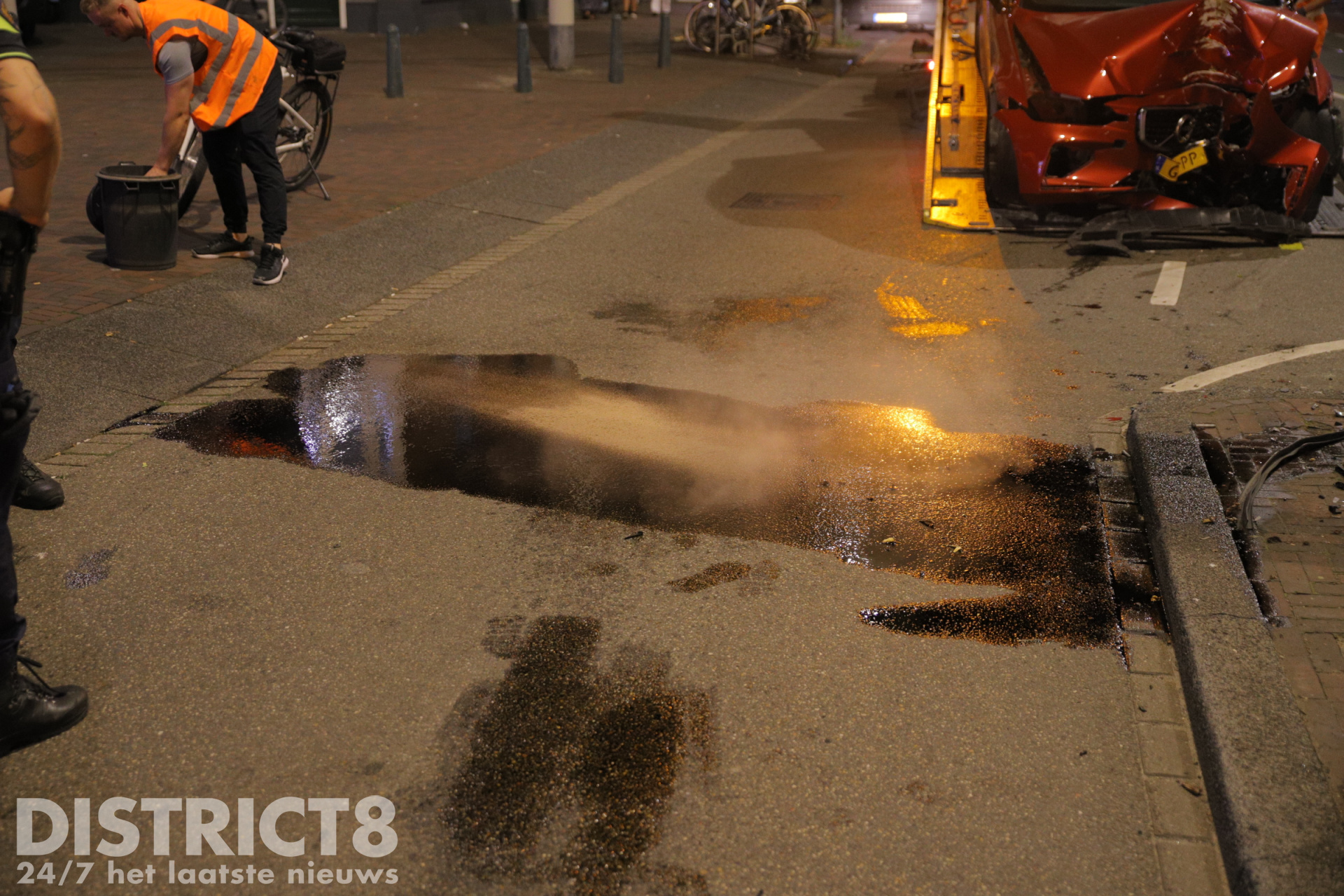 Door een nog onbekende oorzaak verloor de bestuurder de macht over het stuur en kwam met een harde klap tot stilstand tegen een lichtmast. Door de harde klap raakte de auto zo ernstig beschadigd dat er een flinke oliespoor onder de auto vandaan kwam.