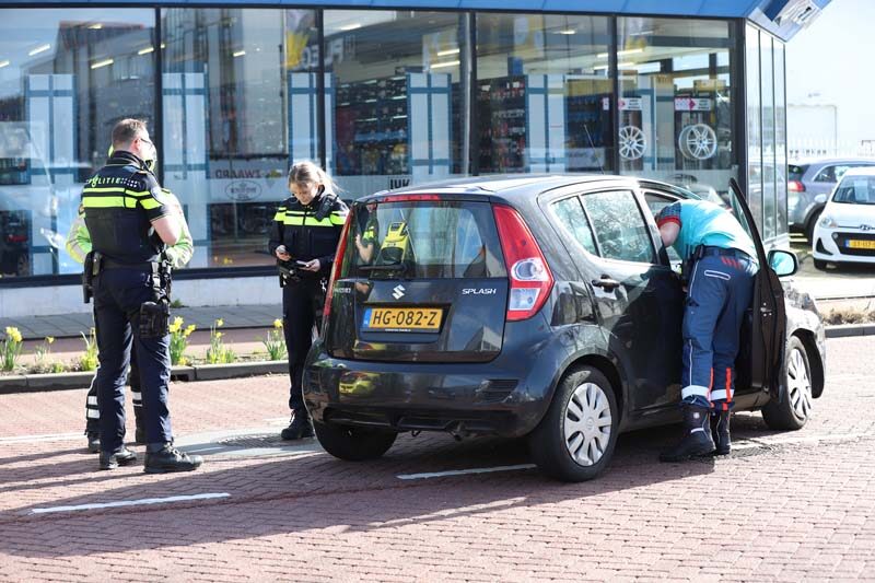 Een ambulance kwam met spoed ter plaatse. De bestuurder van de personenauto wordt door het ambulancepersoneel gecontroleerd op verwondingen.