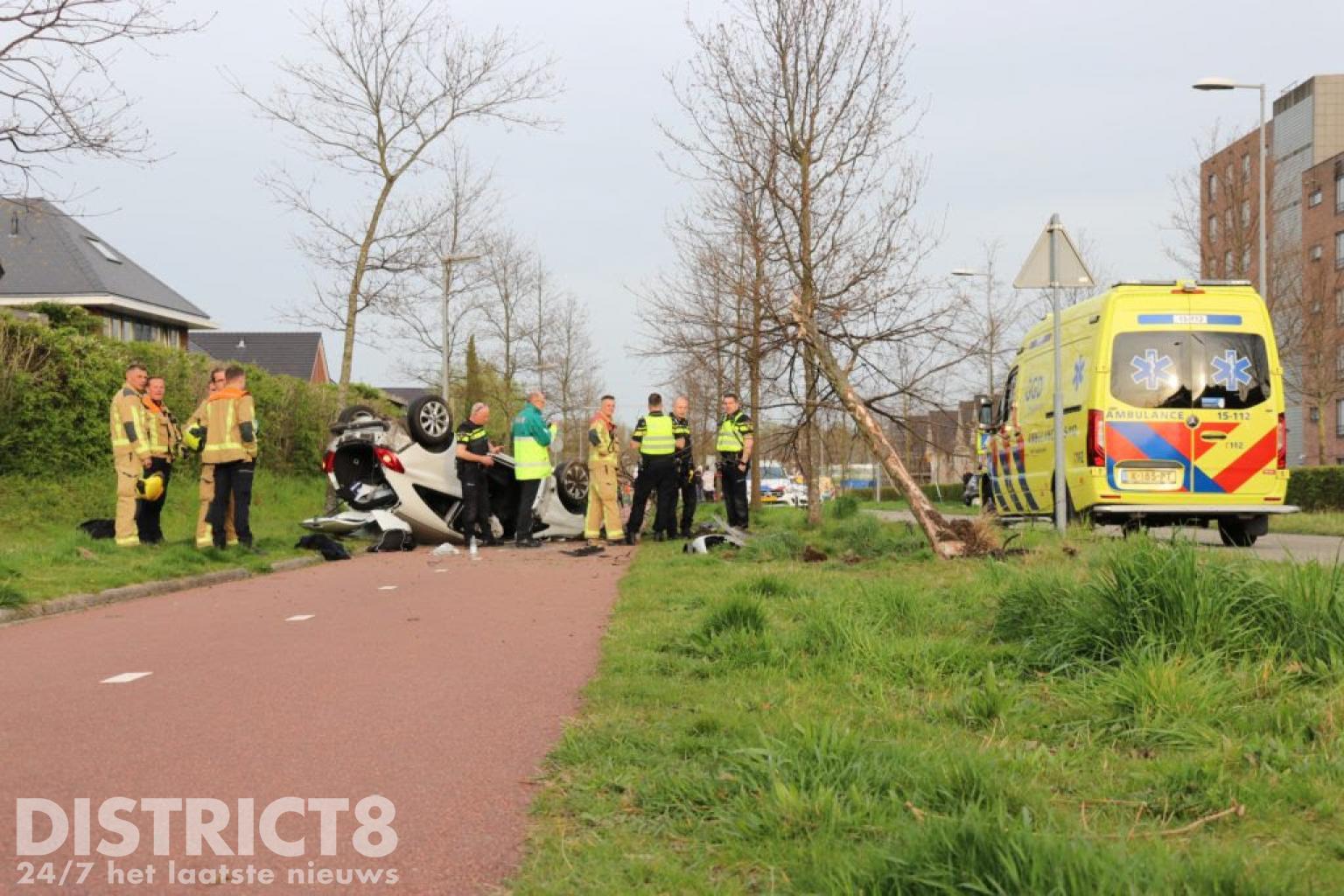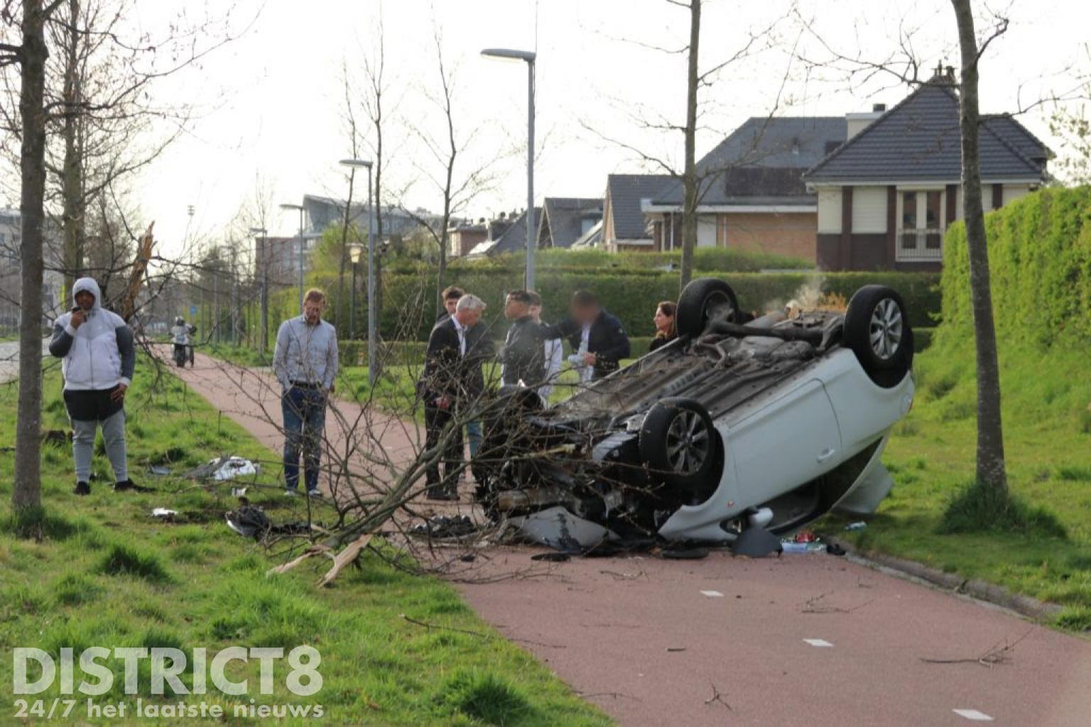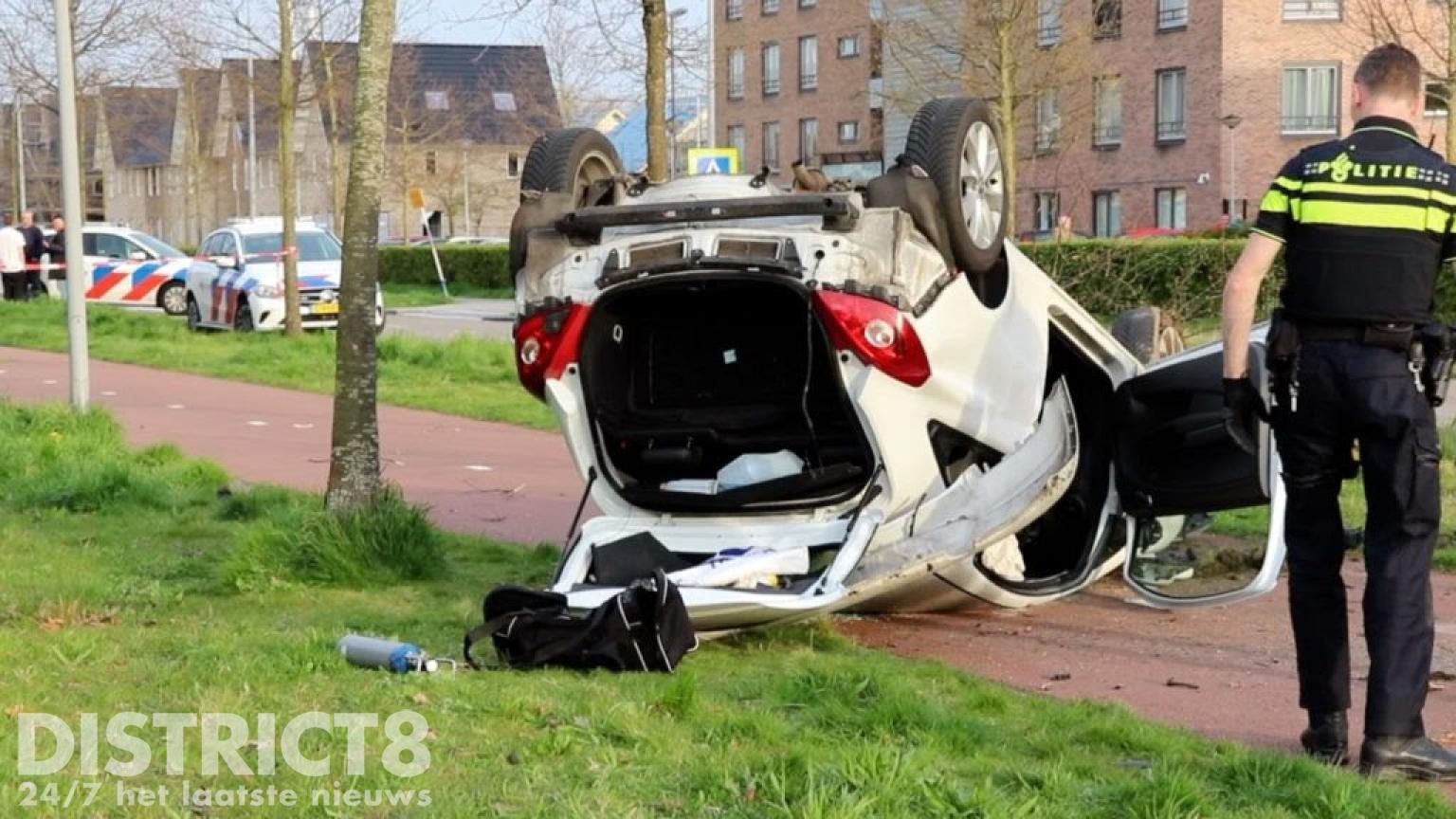 Een automobilist bleek de macht over het stuur te zijn verloren en is op z’n kop tot stilstand gekomen op een fietspad. Volgens omstanders miste de bestuurder hierbij op een haar na twee fietsers.